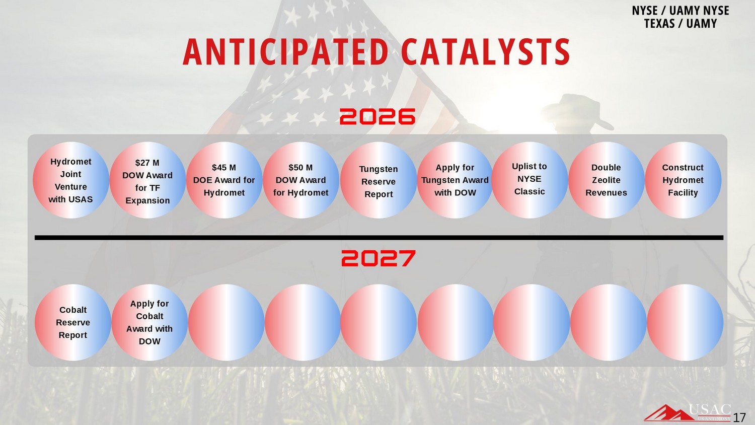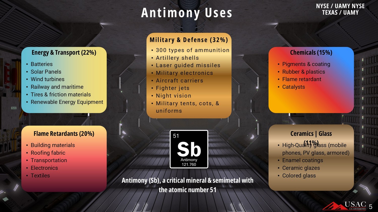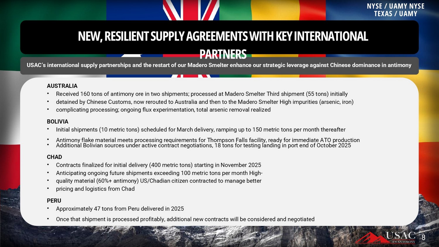 ATTRACTIVE, LONG - TERM STRATEGIC PARTNERSHIPS TO SECURE NORTH AMERICA SUPPLY CHAINS FOR ANTIMONY With global antimony supply increasingly constrained by China’s dominant position, the U.S. supply crunch is intensifying, strengthening the case under DPA for domestic production by 2027 We have secured a strategic partnership withthe Defense Logistics Agency (DLA), aligning with the U.S. government’s push unde r Executive Order 14017 to rebuild resilient domestic critical - mineral supply chains $245 Million DLA Contract & Strategic Defense Securing America’s Supply Chains for Critical Minerals 2024: China cuts off global antimony exports, intensifying U.S. supply crisis 2025: U.S. Antimony applies for DoD - aligned critical mineral grant project $106.7 Million Corporate Contract with U.S. Industrial 15 Partnership Fabric Manufacturer • • • • • • • • • • • • • • • Replicable Model: Blueprint for future defense mineral partnerships Validation & De - Risking: Sole - source DOD contract confirms U.S. defense confidence Scale Leverage: $245M award = ~16 × 2024 revenue — transformational growth Supply Chain Security: Reduces reliance on China; ensures U.S. alternatives Barrier to Entry: Only DOD - approved antimony fully integrated miner and producer in North America. Proprietary process engineering Policy Alignment: Backed by DOD, DPA, and U.S. critical mineral strategy Revenue Visibility: Multi - year IDIQ enables stable, predictable revenue Upside Optionality: Rising defense demand could unlock further awards Purchase of Antimony Trioxide, a key ingredient in flame retardant materials Reinforces both parties’ commitment to supply security within the USA Reduces customer exposure to international supply disruption Signals a broader industrial policy trend toward reshoring critical mineral supply chains This contract represents a key milestone in restoring and strengthening domestic industrial collaboration NYSE / UAMY NYSE TEXAS / UAMY
