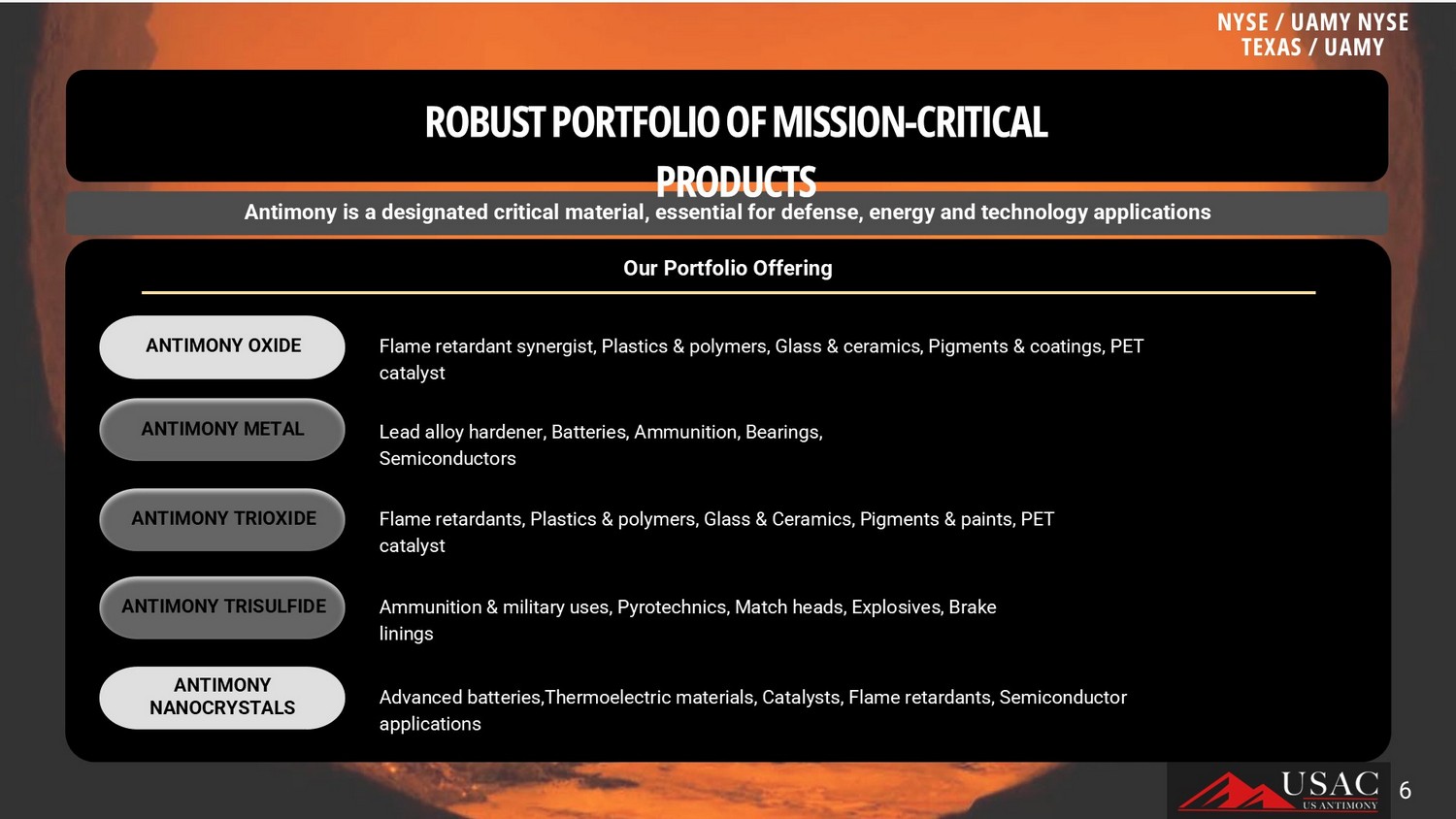 Military & Defense (32%) • 300 types of ammunition • Artillery shells • Laser guided missiles • Military electronics • Aircraft carriers • Fighter jets • Night vision • Military tents, cots, & uniforms 5 Antimony Uses Antimony (Sb), a critical mineral & semimetal with the atomic number 51 Energy & Transport (22%) • Batteries • Solar Panels • Wind turbines • Railway and maritime • Tires & friction materials • Renewable Energy Equipment Flame Retardants (20%) • Building materials • Roofing fabric • Transportation • Electronics • Textiles Chemicals (15%) • Pigments & coating • Rubber & plastics • Flame retardant • Catalysts Ceramics | Glass (11%) • High - Quality glass (mobile phones, PV glass, armored) • Enamel coatings • Ceramic glazes • Colored glass NYSE / UAMY NYSE TEXAS / UAMY