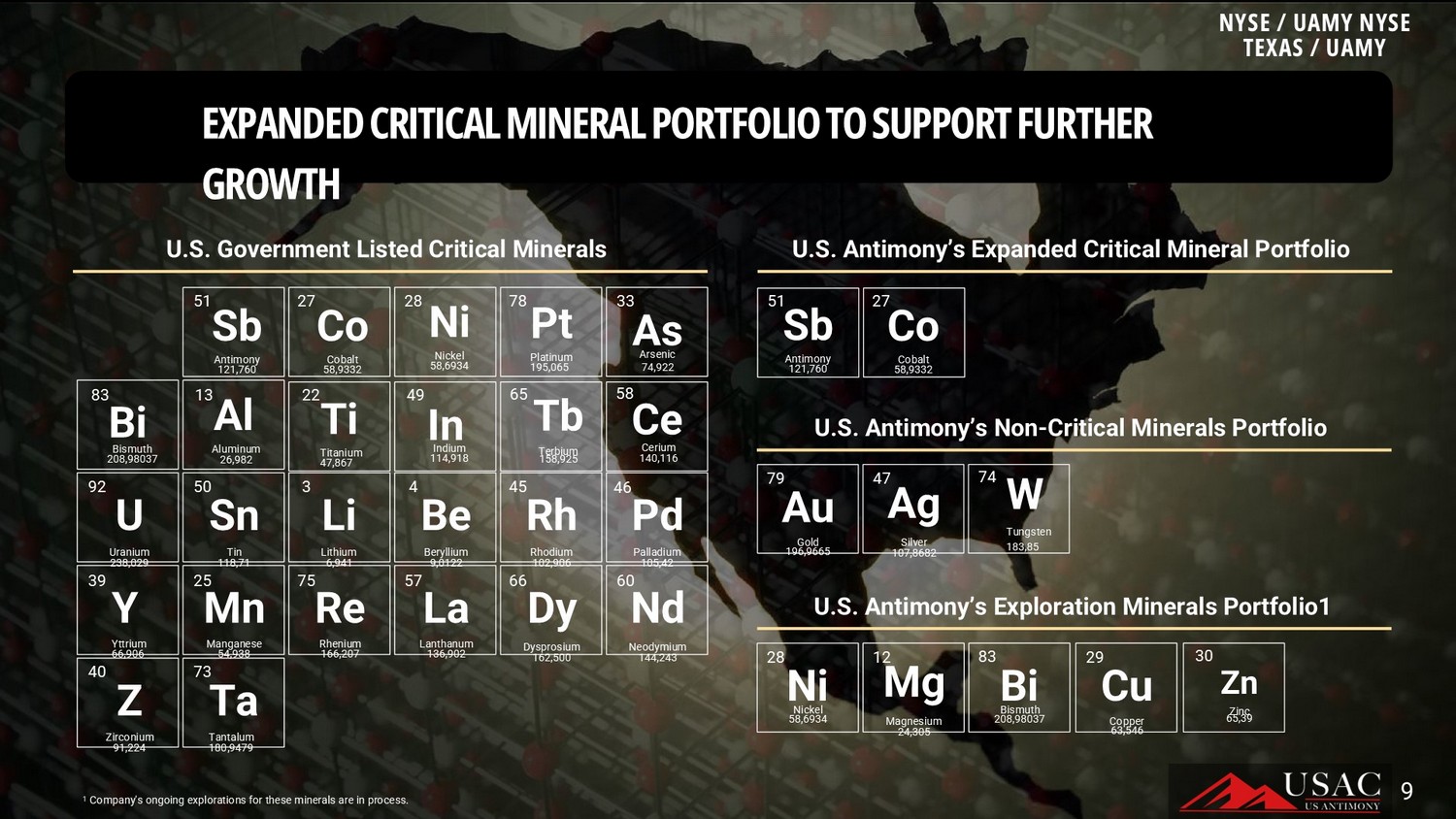 8 • • • • Contracts finalized for initial delivery (400 metric tons) starting in November 2025 Anticipating ongoing future shipments exceeding 100 metric tons per month High - quality material (60%+ antimony) US/Chadian citizen contracted to manage better pricing and logistics from Chad PERU • • Approximately 47 tons from Peru delivered in 2025 Once that shipment is processed profitably, additional new contracts will be considered and negotiated AUSTRALIA • • • Received 160 tons of antimony ore in two shipments; processed at Madero Smelter Third shipment (55 tons) initially detained by Chinese Customs, now rerouted to Australia and then to the Madero Smelter High impurities (arsenic, iron) complicating processing; ongoing flux experimentation, total arsenic removal realized BOLIVIA • • • Initial shipments (10 metric tons) scheduled for March delivery, ramping up to 150 metric tons per month thereafter Antimony flake material meets processing requirements for Thompson Falls facility, ready for immediate ATO production Additional Bolivian sources under active contract negotiations, 18 tons for testing landing in port end of October 2025 USAC’s international supply partnerships and the restart of our Madero Smelter enhance our strategic leverage against Chinese do minance in antimony CHAD NYSE / UAMY NYSE TEXAS / UAMY 8 NEW, RESILIENT SUPPLY AGREEMENTS WITH KEY INTERNATIONAL PARTNERS