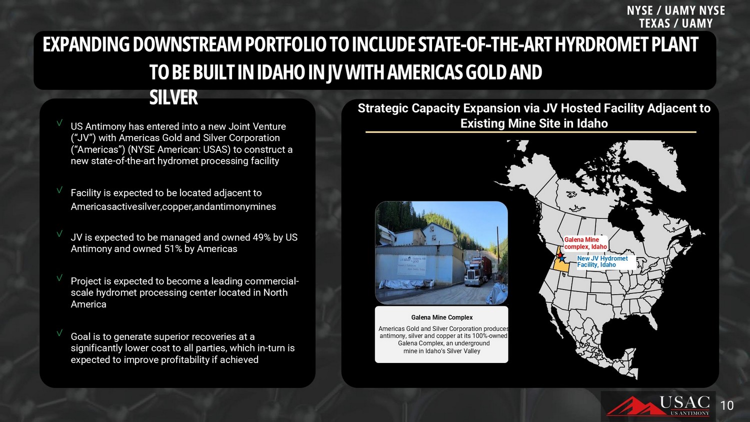 9 EXPANDED CRITICAL MINERAL PORTFOLIO TO SUPPORT FURTHER GROWTH U.S. Government Listed Critical Minerals U.S. Antimony’s Exploration Minerals Portfolio1 U.S. Antimony’s Non - Critical Minerals Portfolio U.S. Antimony’s Expanded Critical Mineral Portfolio 9 83 Bi Bismuth 208,98037 92 U Uranium 238,029 51 Sb Antimony 121,760 13 Al Aluminum 26,982 50 Sn Tin 118,71 22 Ti Titanium 47,867 3 Li Lithium 6,941 49 In Indium 114,918 4 Be Beryllium 9,0122 65 Tb Terbium 158,925 45 Rh Rhodium 102,906 Arsenic 74,922 58 Ce Cerium 140,116 46 Pd Palladium 105,42 51 Sb Antimony 121,760 79 Au Gold 196,9665 47 Ag Silver 107,8682 12 Mg Magnesium 24,305 W Tungsten 183,85 83 Bi Bismuth 208,98037 29 Cu Copper 63,546 30 Zn Zinc 65,39 39 Y Yttrium 66,906 40 Z Zirconium 91,224 25 Mn Manganese 54,938 73 Ta Tantalum 180 , 9479 27 Co Cobalt 58,9332 75 Re Rhenium 166,207 57 La Lanthanum 136,902 28 Ni Nickel 58,6934 66 Dy Dysprosium 162,500 78 Pt Platinum 195 , 065 60 Nd Neodymium 144,243 33 As 28 Ni Nickel 58,6934 27 Co Cobalt 58,9332 74 1 Company's ongoing explorations for these minerals are in process. NYSE / UAMY NYSE TEXAS / UAMY
