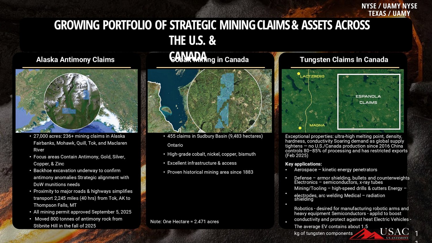 11 GROWING PORTFOLIO OF STRATEGIC MINING CLAIMS & ASSETS ACROSS THE U.S. & CANADA Alaska Antimony Claims Cobalt Mining in Canada Tungsten Claims In Canada 1 1 • 27,000 acres: 236+ mining claims in Alaska Fairbanks, Mohawk, Quill, Tok, and Maclaren River • Focus areas Contain Antimony, Gold, Silver, Copper, & Zinc • Backhoe excavation underway to confirm antimony anomalies Strategic alignment with DoW munitions needs • Proximity to major roads & highways simplifies transport 2,245 miles (40 hrs) from Tok, AK to Thompson Falls, MT • All mining permit approved September 5, 2025 • Moved 800 tonnes of antimony rock from Stibnite Hill in the fall of 2025 Note: One Hectare = 2.471 acres • 455 claims in Sudbury Basin (9,483 hectares) Ontario • High - grade cobalt, nickel, copper, bismuth • Excellent infrastructure & access • Proven historical mining area since 1883 Exceptional properties: ultra - high melting point, density, hardness, conductivity Soaring demand as global supply tightens — no U.S./Canada production since 2016 China controls 80 – 85% of processing and has restricted exports (Feb 2025) Key applications: • • Aerospace – kinetic energy penetrators Defense – armor shielding, bullets and counterweights Electronics – semiconductors, x - ray tubes Mining/Tooling – high - speed drills & cutters Energy – electrodes, arc welding Medical – radiation shielding Robotics - desired for manufacturing robotic arms and heavy equipment Semiconductors - applid to boost conductivity and protect against heat Electric Vehicles - The average EV contains about 1.5 kg of tungsten components • • • NYSE / UAMY NYSE TEXAS / UAMY