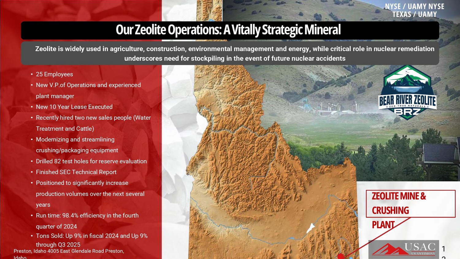 12 • 25 Employees • New V.P.of Operations and experienced plant manager • New 10 Year Lease Executed • Recently hired two new sales people (Water Treatment and Cattle) • Modernizing and streamlining crushing/packaging equipment • Drilled 82 test holes for reserve evaluation • Finished SEC Technical Report • Positioned to significantly increase production volumes over the next several years • Run time: 98.4% efficiency in the fourth quarter of 2024 • Tons Sold: Up 9% in fiscal 2024 and Up 9% through Q3 2025 Preston, Idaho 4005 East Glendale Road Preston, Idaho ZEOLITE MINE & CRUSHING PLANT 1 2 NYSE / UAMY NYSE TEXAS / UAMY Zeolite is widely used in agriculture, construction, environmental management and energy, while critical role in nuclear reme dia tion underscores need for stockpiling in the event of future nuclear accidents Our Zeolite Operations: A Vitally Strategic Mineral