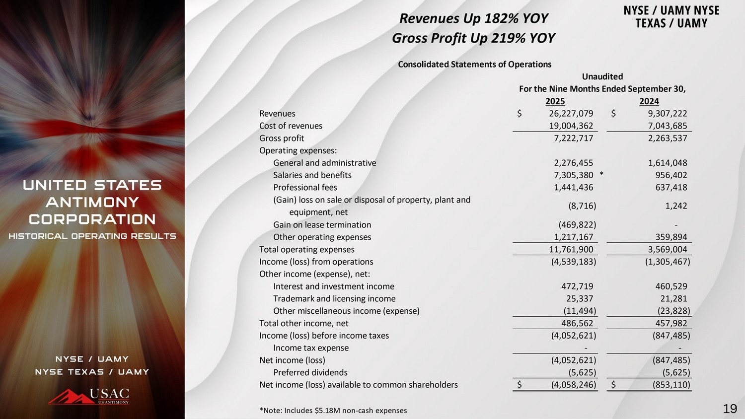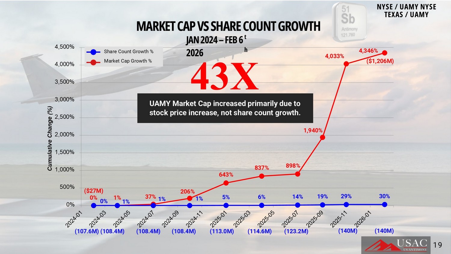 18 (107.6M) (108.4M) ($27M) 0% 1% 0% 1% (108.4M) 37% 1% (108.4M) 206% 1% 5% 643% (113.0M) 6% 837% (114.6M) 898% 14% (123.2M) 1,940% 19% 4,033% 29% (140M) 4,346% 30% (140M) 4,500% 4,000% 3,500% 3,000% 2,500% 2,000% 1,500% 1,000% 0% 500% Cumulative Change (%) MARKET CAP VS SHARE COUNT GROWTH t h Share Count Growth % Market Cap Growth % UAMY Market Cap increased primarily due to stock price increase, not share count growth. 19 JAN 2024 – FEB 6 2026 43X NYSE / UAMY NYSE TEXAS / UAMY ($1,206M)