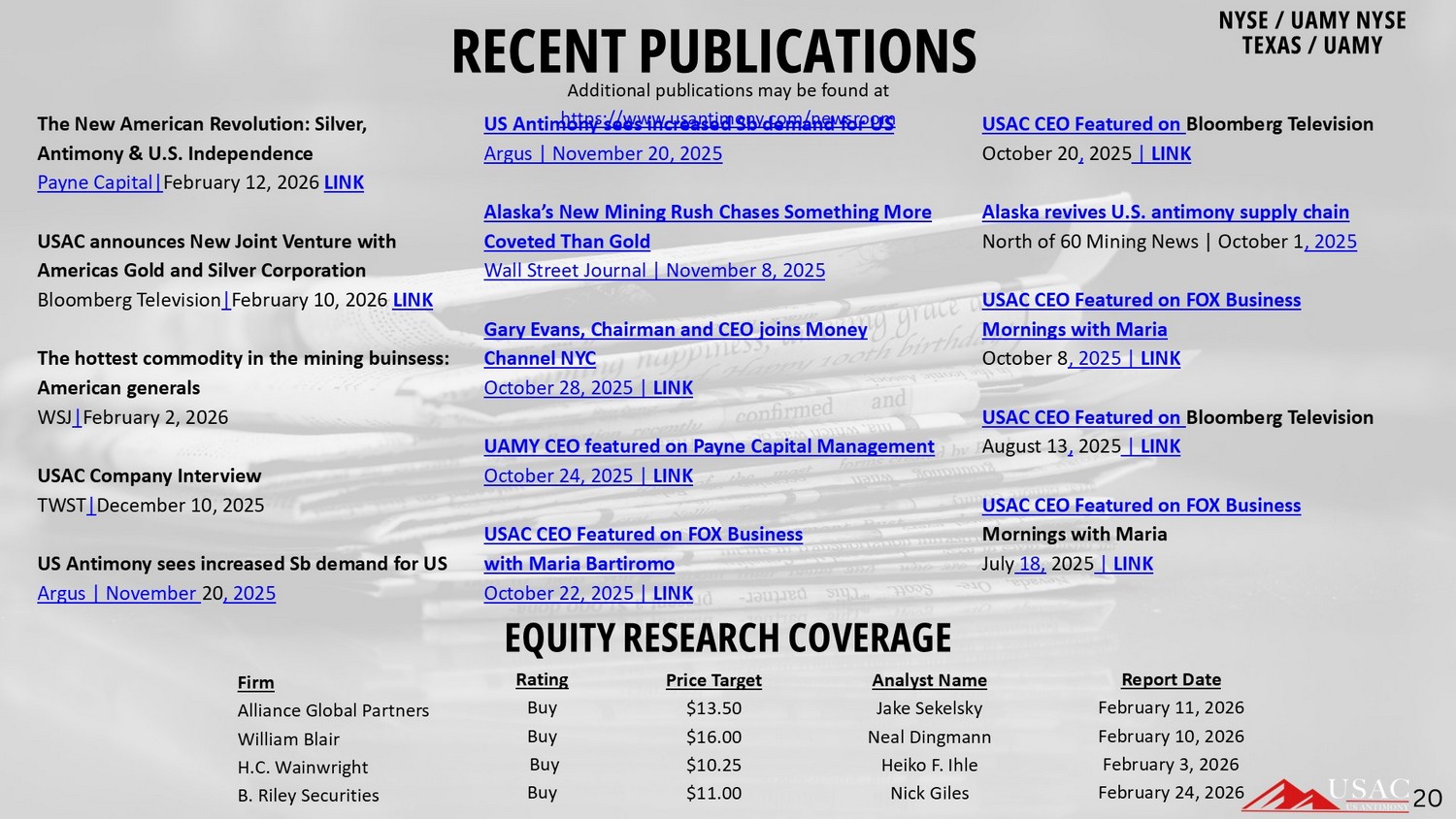 Report Date February 11, 2026 February 10, 2026 February 3, 2026 February 24, 2026 The New American Revolution: Silver, Antimony & U.S. Independence Payne Capital| February 12, 2026 LINK USAC announces New Joint Venture with Americas Gold and Silver Corporation Bloomberg Television | February 10, 2026 LINK The hottest commodity in the mining buinsess: American generals WSJ | February 2, 2026 USAC Company Interview TWST | December 10, 2025 US Antimony sees increased Sb demand for US Argus | November 20 , 2025 USAC CEO Featured on Bloomberg Television October 20 , 2025 | LINK Alaska revives U.S. antimony supply chain North of 60 Mining News | October 1 , 2025 USAC CEO Featured on FOX Business Mornings with Maria October 8 , 2025 | LINK USAC CEO Featured on Bloomberg Television August 13 , 2025 | LINK USAC CEO Featured on FOX Business Mornings with Maria July 18, 2025 | LINK US Antimony sees increased Sb demand for US Argus | November 20 , 2025 Alaska’s New Mining Rush Chases Something More Coveted Than Gold Wall Street Journal | November 8 , 2025 Gary Evans, Chairman and CEO joins Money Channel NYC October 28, 2025 | LINK UAMY CEO featured on Payne Capital Management October 24, 2025 | LINK USAC CEO Featured on FOX Business with Maria Bartiromo October 22 , 2025 | LINK Firm Alliance Global Partners William Blair H.C. Wainwright B. Riley Securities Rating Buy Buy Buy Buy Price Target $13.50 $16.00 $10.25 $11.00 Analyst Name Jake Sekelsky Neal Dingmann Heiko F. Ihle Nick Giles 20 RECENT PUBLICATIONS EQUITY RESEARCH COVERAGE Additional publications may be found at https://www.usantimony.com/newsroom NYSE / UAMY NYSE TEXAS / UAMY