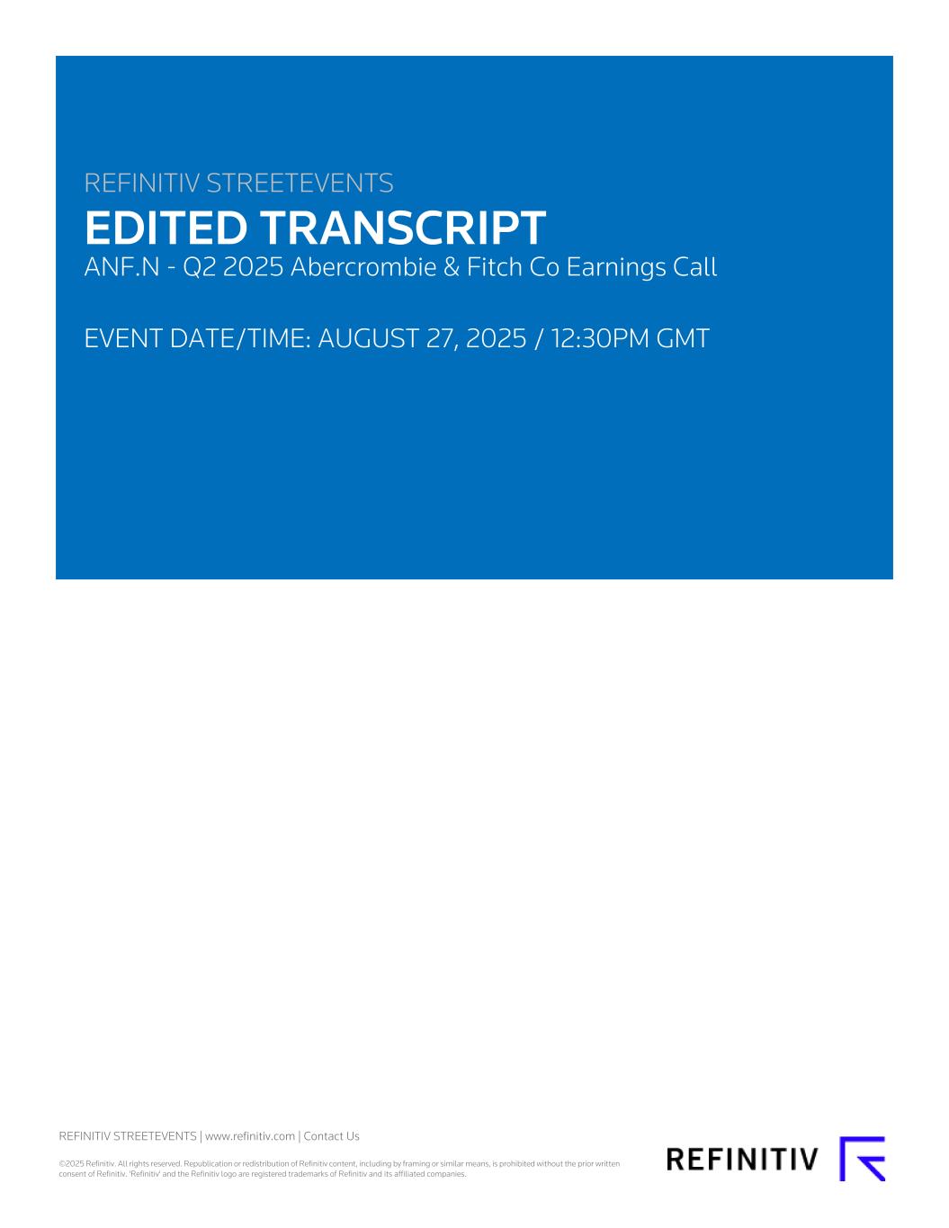REFINITIV STREETEVENTS EDITED TRANSCRIPT ANF.N - Q2 2025 Abercrombie & Fitch Co Earnings Call EVENT DATE/TIME: AUGUST 27, 2025 / 12:30PM GMT REFINITIV STREETEVENTS | www.refinitiv.com | Contact Us ©2025 Refinitiv. All rights reserved. Republication or redistribution of Refinitiv content, including by framing or similar means, is prohibited without the prior written consent of Refinitiv. 'Refinitiv' and the Refinitiv logo are registered trademarks of Refinitiv and its affiliated companies.