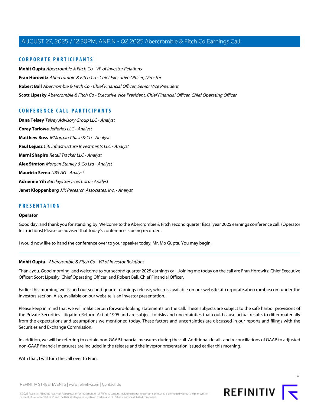 C O R P O R A T E P A R T I C I P A N T S Mohit Gupta Abercrombie & Fitch Co - VP of Investor Relations Fran Horowitz Abercrombie & Fitch Co - Chief Executive Officer, Director Robert Ball Abercrombie & Fitch Co - Chief Financial Officer, Senior Vice President Scott Lipesky Abercrombie & Fitch Co - Executive Vice President, Chief Financial Officer, Chief Operating Officer C O N F E R E N C E C A L L P A R T I C I P A N T S Dana Telsey Telsey Advisory Group LLC - Analyst Corey Tarlowe Jefferies LLC - Analyst Matthew Boss JPMorgan Chase & Co - Analyst Paul Lejuez Citi Infrastructure Investments LLC - Analyst Marni Shapiro Retail Tracker LLC - Analyst Alex Straton Morgan Stanley & Co Ltd - Analyst Mauricio Serna UBS AG - Analyst Adrienne Yih Barclays Services Corp - Analyst Janet Kloppenburg JJK Research Associates, Inc. - Analyst P R E S E N T A T I O N Operator Good day, and thank you for standing by. Welcome to the Abercrombie & Fitch second quarter fiscal year 2025 earnings conference call. (Operator Instructions) Please be advised that today's conference is being recorded. I would now like to hand the conference over to your speaker today, Mr. Mo Gupta. You may begin. Mohit Gupta - Abercrombie & Fitch Co - VP of Investor Relations Thank you. Good morning, and welcome to our second quarter 2025 earnings call. Joining me today on the call are Fran Horowitz, Chief Executive Officer; Scott Lipesky, Chief Operating Officer; and Robert Ball, Chief Financial Officer. Earlier this morning, we issued our second quarter earnings release, which is available on our website at corporate.abercrombie.com under the Investors section. Also, available on our website is an investor presentation. Please keep in mind that we will make certain forward-looking statements on the call. These subjects are subject to the safe harbor provisions of the Private Securities Litigation Reform Act of 1995 and are subject to risks and uncertainties that could cause actual results to differ materially from the expectations and assumptions we mentioned today. These factors and uncertainties are discussed in our reports and filings with the Securities and Exchange Commission. In addition, we will be referring to certain non-GAAP financial measures during the call. Additional details and reconciliations of GAAP to adjusted non-GAAP financial measures are included in the release and the investor presentation issued earlier this morning. With that, I will turn the call over to Fran. 2 REFINITIV STREETEVENTS | www.refinitiv.com | Contact Us ©2025 Refinitiv. All rights reserved. Republication or redistribution of Refinitiv content, including by framing or similar means, is prohibited without the prior written consent of Refinitiv. 'Refinitiv' and the Refinitiv logo are registered trademarks of Refinitiv and its affiliated companies. AUGUST 27, 2025 / 12:30PM, ANF.N - Q2 2025 Abercrombie & Fitch Co Earnings Call