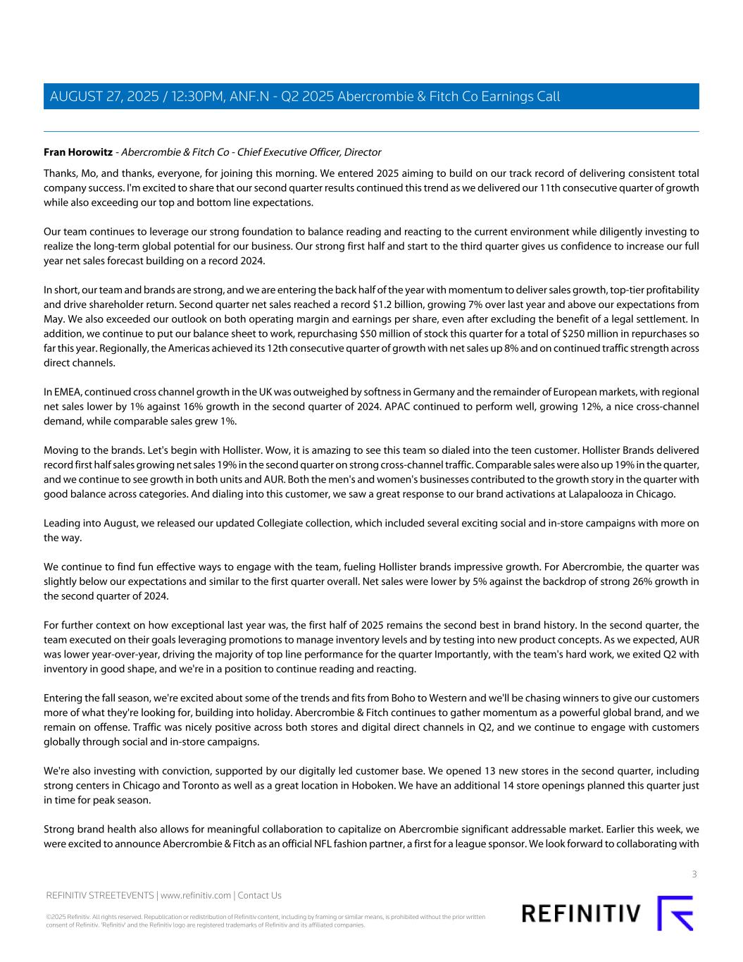 Fran Horowitz - Abercrombie & Fitch Co - Chief Executive Officer, Director Thanks, Mo, and thanks, everyone, for joining this morning. We entered 2025 aiming to build on our track record of delivering consistent total company success. I'm excited to share that our second quarter results continued this trend as we delivered our 11th consecutive quarter of growth while also exceeding our top and bottom line expectations. Our team continues to leverage our strong foundation to balance reading and reacting to the current environment while diligently investing to realize the long-term global potential for our business. Our strong first half and start to the third quarter gives us confidence to increase our full year net sales forecast building on a record 2024. In short, our team and brands are strong, and we are entering the back half of the year with momentum to deliver sales growth, top-tier profitability and drive shareholder return. Second quarter net sales reached a record $1.2 billion, growing 7% over last year and above our expectations from May. We also exceeded our outlook on both operating margin and earnings per share, even after excluding the benefit of a legal settlement. In addition, we continue to put our balance sheet to work, repurchasing $50 million of stock this quarter for a total of $250 million in repurchases so far this year. Regionally, the Americas achieved its 12th consecutive quarter of growth with net sales up 8% and on continued traffic strength across direct channels. In EMEA, continued cross channel growth in the UK was outweighed by softness in Germany and the remainder of European markets, with regional net sales lower by 1% against 16% growth in the second quarter of 2024. APAC continued to perform well, growing 12%, a nice cross-channel demand, while comparable sales grew 1%. Moving to the brands. Let's begin with Hollister. Wow, it is amazing to see this team so dialed into the teen customer. Hollister Brands delivered record first half sales growing net sales 19% in the second quarter on strong cross-channel traffic. Comparable sales were also up 19% in the quarter, and we continue to see growth in both units and AUR. Both the men's and women's businesses contributed to the growth story in the quarter with good balance across categories. And dialing into this customer, we saw a great response to our brand activations at Lalapalooza in Chicago. Leading into August, we released our updated Collegiate collection, which included several exciting social and in-store campaigns with more on the way. We continue to find fun effective ways to engage with the team, fueling Hollister brands impressive growth. For Abercrombie, the quarter was slightly below our expectations and similar to the first quarter overall. Net sales were lower by 5% against the backdrop of strong 26% growth in the second quarter of 2024. For further context on how exceptional last year was, the first half of 2025 remains the second best in brand history. In the second quarter, the team executed on their goals leveraging promotions to manage inventory levels and by testing into new product concepts. As we expected, AUR was lower year-over-year, driving the majority of top line performance for the quarter Importantly, with the team's hard work, we exited Q2 with inventory in good shape, and we're in a position to continue reading and reacting. Entering the fall season, we're excited about some of the trends and fits from Boho to Western and we'll be chasing winners to give our customers more of what they're looking for, building into holiday. Abercrombie & Fitch continues to gather momentum as a powerful global brand, and we remain on offense. Traffic was nicely positive across both stores and digital direct channels in Q2, and we continue to engage with customers globally through social and in-store campaigns. We're also investing with conviction, supported by our digitally led customer base. We opened 13 new stores in the second quarter, including strong centers in Chicago and Toronto as well as a great location in Hoboken. We have an additional 14 store openings planned this quarter just in time for peak season. Strong brand health also allows for meaningful collaboration to capitalize on Abercrombie significant addressable market. Earlier this week, we were excited to announce Abercrombie & Fitch as an official NFL fashion partner, a first for a league sponsor. We look forward to collaborating with 3 REFINITIV STREETEVENTS | www.refinitiv.com | Contact Us ©2025 Refinitiv. All rights reserved. Republication or redistribution of Refinitiv content, including by framing or similar means, is prohibited without the prior written consent of Refinitiv. 'Refinitiv' and the Refinitiv logo are registered trademarks of Refinitiv and its affiliated companies. AUGUST 27, 2025 / 12:30PM, ANF.N - Q2 2025 Abercrombie & Fitch Co Earnings Call