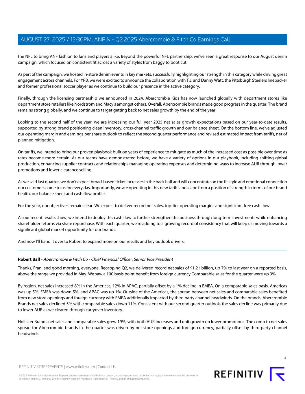 the NFL to bring ANF fashion to fans and players alike. Beyond the powerful NFL partnership, we've seen a great response to our August denim campaign, which focused on consistent fit across a variety of styles from baggy to boot cut. As part of the campaign, we hosted in-store denim events in key markets, successfully highlighting our strength in this category while driving great engagement across channels. For YPB, we were excited to announce the collaboration with T.J. and Danny Watt, the Pittsburgh Steelers linebacker and former professional soccer player as we continue to build our presence in the active category. Finally, through the licensing partnership we announced in 2024, Abercrombie Kids has now launched globally with department stores like department store retailers like Nordstrom and Macy's amongst others. Overall, Abercrombie brands made good progress in the quarter. The brand remains strong globally, and we continue to target getting back to net sales growth by the end of the year. Looking to the second half of the year, we are increasing our full year 2025 net sales growth expectations based on our year-to-date results, supported by strong brand positioning clean inventory, cross-channel traffic growth and our balance sheet. On the bottom line, we've adjusted our operating margin and earnings per share outlook to reflect the second quarter performance and revised estimated impact from tariffs, net of planned mitigation. On tariffs, we intend to bring our proven playbook built on years of experience to mitigate as much of the increased cost as possible over time as rates become more certain. As our teams have demonstrated before, we have a variety of options in our playbook, including shifting global production, enhancing supplier contracts and relationships managing operating expenses and determining ways to increase AUR through lower promotions and lower clearance selling. As we said last quarter, we don't expect broad-based ticket increases in the back half and will concentrate on the fit style and emotional connection our customers come to us for every day. Importantly, we are operating in this new tariff landscape from a position of strength in terms of our brand health, our balance sheet and cash flow profile. For the year, our objectives remain clear. We expect to deliver record net sales, top-tier operating margins and significant free cash flow. As our recent results show, we intend to deploy this cash flow to further strengthen the business through long-term investments while enhancing shareholder returns via share repurchase. With each quarter, we're adding to a growing record of consistency that will keep us moving towards a significant global market opportunity for our brands. And now I'll hand it over to Robert to expand more on our results and key outlook drivers. Robert Ball - Abercrombie & Fitch Co - Chief Financial Officer, Senior Vice President Thanks, Fran, and good morning, everyone. Recapping Q2, we delivered record net sales of $1.21 billion, up 7% to last year on a reported basis, above the range we provided in May. We saw a 100 basis point benefit from foreign currency Comparable sales for the quarter were up 3%. By region, net sales increased 8% in the Americas, 12% in APAC, partially offset by a 1% decline in EMEA. On a comparable sales basis, Americas was up 5%. EMEA was down 5%, and APAC was up 1%. Outside of the Americas, the spread between net sales and comparable sales benefited from new store openings and foreign currency with EMEA additionally impacted by third party channel headwinds. On the brands, Abercrombie Brands net sales declined 5% with comparable sales down 11%. Consistent with our second quarter outlook, the sales decline was primarily due to lower AUR as we cleared through carryover inventory. Hollister Brands net sales and comparable sales grew 19%, with both AUR increases and unit growth on lower promotions. The comp to net sales spread for Abercrombie brands in the quarter was driven by net store openings and foreign currency, partially offset by third-party channel headwinds. 4 REFINITIV STREETEVENTS | www.refinitiv.com | Contact Us ©2025 Refinitiv. All rights reserved. Republication or redistribution of Refinitiv content, including by framing or similar means, is prohibited without the prior written consent of Refinitiv. 'Refinitiv' and the Refinitiv logo are registered trademarks of Refinitiv and its affiliated companies. AUGUST 27, 2025 / 12:30PM, ANF.N - Q2 2025 Abercrombie & Fitch Co Earnings Call