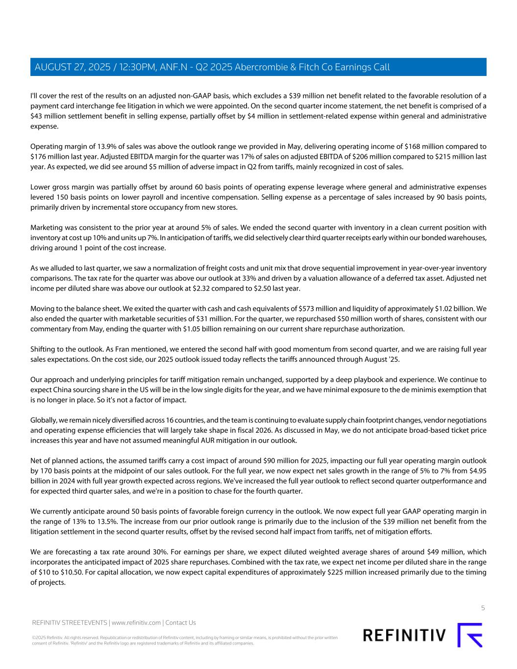 I'll cover the rest of the results on an adjusted non-GAAP basis, which excludes a $39 million net benefit related to the favorable resolution of a payment card interchange fee litigation in which we were appointed. On the second quarter income statement, the net benefit is comprised of a $43 million settlement benefit in selling expense, partially offset by $4 million in settlement-related expense within general and administrative expense. Operating margin of 13.9% of sales was above the outlook range we provided in May, delivering operating income of $168 million compared to $176 million last year. Adjusted EBITDA margin for the quarter was 17% of sales on adjusted EBITDA of $206 million compared to $215 million last year. As expected, we did see around $5 million of adverse impact in Q2 from tariffs, mainly recognized in cost of sales. Lower gross margin was partially offset by around 60 basis points of operating expense leverage where general and administrative expenses levered 150 basis points on lower payroll and incentive compensation. Selling expense as a percentage of sales increased by 90 basis points, primarily driven by incremental store occupancy from new stores. Marketing was consistent to the prior year at around 5% of sales. We ended the second quarter with inventory in a clean current position with inventory at cost up 10% and units up 7%. In anticipation of tariffs, we did selectively clear third quarter receipts early within our bonded warehouses, driving around 1 point of the cost increase. As we alluded to last quarter, we saw a normalization of freight costs and unit mix that drove sequential improvement in year-over-year inventory comparisons. The tax rate for the quarter was above our outlook at 33% and driven by a valuation allowance of a deferred tax asset. Adjusted net income per diluted share was above our outlook at $2.32 compared to $2.50 last year. Moving to the balance sheet. We exited the quarter with cash and cash equivalents of $573 million and liquidity of approximately $1.02 billion. We also ended the quarter with marketable securities of $31 million. For the quarter, we repurchased $50 million worth of shares, consistent with our commentary from May, ending the quarter with $1.05 billion remaining on our current share repurchase authorization. Shifting to the outlook. As Fran mentioned, we entered the second half with good momentum from second quarter, and we are raising full year sales expectations. On the cost side, our 2025 outlook issued today reflects the tariffs announced through August '25. Our approach and underlying principles for tariff mitigation remain unchanged, supported by a deep playbook and experience. We continue to expect China sourcing share in the US will be in the low single digits for the year, and we have minimal exposure to the de minimis exemption that is no longer in place. So it's not a factor of impact. Globally, we remain nicely diversified across 16 countries, and the team is continuing to evaluate supply chain footprint changes, vendor negotiations and operating expense efficiencies that will largely take shape in fiscal 2026. As discussed in May, we do not anticipate broad-based ticket price increases this year and have not assumed meaningful AUR mitigation in our outlook. Net of planned actions, the assumed tariffs carry a cost impact of around $90 million for 2025, impacting our full year operating margin outlook by 170 basis points at the midpoint of our sales outlook. For the full year, we now expect net sales growth in the range of 5% to 7% from $4.95 billion in 2024 with full year growth expected across regions. We've increased the full year outlook to reflect second quarter outperformance and for expected third quarter sales, and we're in a position to chase for the fourth quarter. We currently anticipate around 50 basis points of favorable foreign currency in the outlook. We now expect full year GAAP operating margin in the range of 13% to 13.5%. The increase from our prior outlook range is primarily due to the inclusion of the $39 million net benefit from the litigation settlement in the second quarter results, offset by the revised second half impact from tariffs, net of mitigation efforts. We are forecasting a tax rate around 30%. For earnings per share, we expect diluted weighted average shares of around $49 million, which incorporates the anticipated impact of 2025 share repurchases. Combined with the tax rate, we expect net income per diluted share in the range of $10 to $10.50. For capital allocation, we now expect capital expenditures of approximately $225 million increased primarily due to the timing of projects. 5 REFINITIV STREETEVENTS | www.refinitiv.com | Contact Us ©2025 Refinitiv. All rights reserved. Republication or redistribution of Refinitiv content, including by framing or similar means, is prohibited without the prior written consent of Refinitiv. 'Refinitiv' and the Refinitiv logo are registered trademarks of Refinitiv and its affiliated companies. AUGUST 27, 2025 / 12:30PM, ANF.N - Q2 2025 Abercrombie & Fitch Co Earnings Call