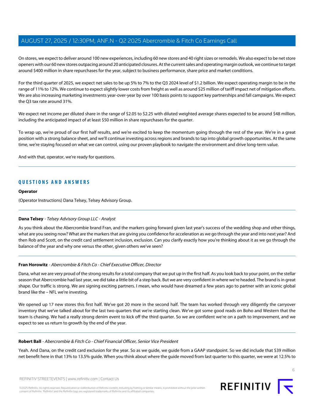On stores, we expect to deliver around 100 new experiences, including 60 new stores and 40 right sizes or remodels. We also expect to be net store openers with our 60 new stores outpacing around 20 anticipated closures. At the current sales and operating margin outlook, we continue to target around $400 million in share repurchases for the year, subject to business performance, share price and market conditions. For the third quarter of 2025, we expect net sales to be up 5% to 7% to the Q3 2024 level of $1.2 billion. We expect operating margin to be in the range of 11% to 12%. We continue to expect slightly lower costs from freight as well as around $25 million of tariff impact net of mitigation efforts. We are also increasing marketing investments year-over-year by over 100 basis points to support key partnerships and fall campaigns. We expect the Q3 tax rate around 31%. We expect net income per diluted share in the range of $2.05 to $2.25 with diluted weighted average shares expected to be around $48 million, including the anticipated impact of at least $50 million in share repurchases for the quarter. To wrap up, we're proud of our first half results, and we're excited to keep the momentum going through the rest of the year. We're in a great position with a strong balance sheet, and we'll continue investing across regions and brands to tap into global growth opportunities. At the same time, we're staying focused on what we can control, using our proven playbook to navigate the environment and drive long-term value. And with that, operator, we're ready for questions. Q U E S T I O N S A N D A N S W E R S Operator (Operator Instructions) Dana Telsey, Telsey Advisory Group. Dana Telsey - Telsey Advisory Group LLC - Analyst As you think about the Abercrombie brand Fran, and the markers going forward given last year's success of the wedding shop and other things, what are you seeing now? What are the markers that are giving you confidence for acceleration as we go through the year and into next year? And then Rob and Scott, on the credit card settlement inclusion, exclusion. Can you clarify exactly how you're thinking about it as we go through the balance of the year and why one versus the other, given others we've seen? Fran Horowitz - Abercrombie & Fitch Co - Chief Executive Officer, Director Dana, what we are very proud of the strong results for a total company that we put up in the first half. As you look back to your point, on the stellar season that Abercrombie had last year, we did take a little bit of a step back. But we are very confident in where we're headed. The brand is in great shape. Our traffic is strong. We are signing exciting partners. I mean, who would have dreamed a few years ago to partner with an iconic global brand like the – NFL we're investing. We opened up 17 new stores this first half. We've got 20 more in the second half. The team has worked through very diligently the carryover inventory that we've talked about for the last two quarters that we're starting clean. We've got some good reads on Boho and Western that the team is chasing. We had a really strong denim event to kick off the third quarter. So we are confident we're on a path to improvement, and we expect to see us return to growth by the end of the year. Robert Ball - Abercrombie & Fitch Co - Chief Financial Officer, Senior Vice President Yeah. And Dana, on the credit card exclusion for the year. So as we guide, we guide from a GAAP standpoint. So we did include that $39 million net benefit here in that 13% to 13.5% guide. When you think about where the guide moved from last quarter to this quarter, we were at 12.5% to 6 REFINITIV STREETEVENTS | www.refinitiv.com | Contact Us ©2025 Refinitiv. All rights reserved. Republication or redistribution of Refinitiv content, including by framing or similar means, is prohibited without the prior written consent of Refinitiv. 'Refinitiv' and the Refinitiv logo are registered trademarks of Refinitiv and its affiliated companies. AUGUST 27, 2025 / 12:30PM, ANF.N - Q2 2025 Abercrombie & Fitch Co Earnings Call