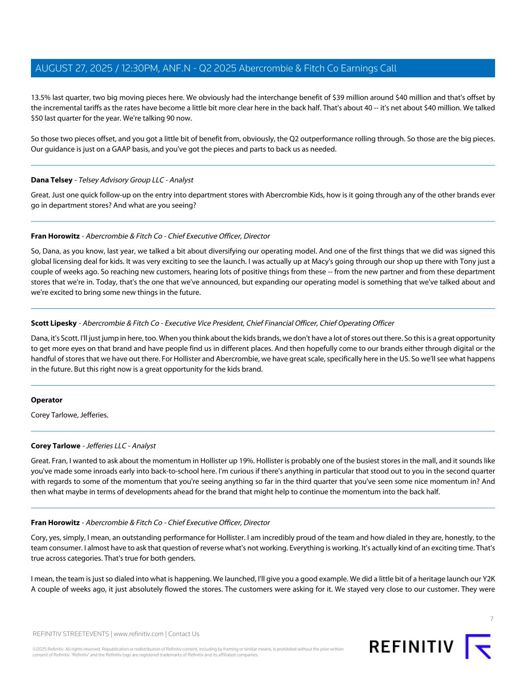 13.5% last quarter, two big moving pieces here. We obviously had the interchange benefit of $39 million around $40 million and that's offset by the incremental tariffs as the rates have become a little bit more clear here in the back half. That's about 40 -- it's net about $40 million. We talked $50 last quarter for the year. We're talking 90 now. So those two pieces offset, and you got a little bit of benefit from, obviously, the Q2 outperformance rolling through. So those are the big pieces. Our guidance is just on a GAAP basis, and you've got the pieces and parts to back us as needed. Dana Telsey - Telsey Advisory Group LLC - Analyst Great. Just one quick follow-up on the entry into department stores with Abercrombie Kids, how is it going through any of the other brands ever go in department stores? And what are you seeing? Fran Horowitz - Abercrombie & Fitch Co - Chief Executive Officer, Director So, Dana, as you know, last year, we talked a bit about diversifying our operating model. And one of the first things that we did was signed this global licensing deal for kids. It was very exciting to see the launch. I was actually up at Macy's going through our shop up there with Tony just a couple of weeks ago. So reaching new customers, hearing lots of positive things from these -- from the new partner and from these department stores that we're in. Today, that's the one that we've announced, but expanding our operating model is something that we've talked about and we're excited to bring some new things in the future. Scott Lipesky - Abercrombie & Fitch Co - Executive Vice President, Chief Financial Officer, Chief Operating Officer Dana, it's Scott. I'll just jump in here, too. When you think about the kids brands, we don't have a lot of stores out there. So this is a great opportunity to get more eyes on that brand and have people find us in different places. And then hopefully come to our brands either through digital or the handful of stores that we have out there. For Hollister and Abercrombie, we have great scale, specifically here in the US. So we'll see what happens in the future. But this right now is a great opportunity for the kids brand. Operator Corey Tarlowe, Jefferies. Corey Tarlowe - Jefferies LLC - Analyst Great. Fran, I wanted to ask about the momentum in Hollister up 19%. Hollister is probably one of the busiest stores in the mall, and it sounds like you've made some inroads early into back-to-school here. I'm curious if there's anything in particular that stood out to you in the second quarter with regards to some of the momentum that you're seeing anything so far in the third quarter that you've seen some nice momentum in? And then what maybe in terms of developments ahead for the brand that might help to continue the momentum into the back half. Fran Horowitz - Abercrombie & Fitch Co - Chief Executive Officer, Director Cory, yes, simply, I mean, an outstanding performance for Hollister. I am incredibly proud of the team and how dialed in they are, honestly, to the team consumer. I almost have to ask that question of reverse what's not working. Everything is working. It's actually kind of an exciting time. That's true across categories. That's true for both genders. I mean, the team is just so dialed into what is happening. We launched, I'll give you a good example. We did a little bit of a heritage launch our Y2K A couple of weeks ago, it just absolutely flowed the stores. The customers were asking for it. We stayed very close to our customer. They were 7 REFINITIV STREETEVENTS | www.refinitiv.com | Contact Us ©2025 Refinitiv. All rights reserved. Republication or redistribution of Refinitiv content, including by framing or similar means, is prohibited without the prior written consent of Refinitiv. 'Refinitiv' and the Refinitiv logo are registered trademarks of Refinitiv and its affiliated companies. AUGUST 27, 2025 / 12:30PM, ANF.N - Q2 2025 Abercrombie & Fitch Co Earnings Call