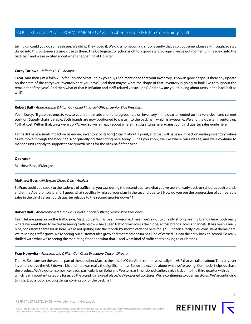 telling us, could you do some reissue. We did it. They loved it. We did a homecoming shop recently that also got tremendous sell-through. So stay dialed into this customer staying close to them. The Collegiate Collection is off to a good start. So again, we've got momentum heading into the back half, and we're excited about what's happening at Hollister. Corey Tarlowe - Jefferies LLC - Analyst Great. And then just a follow-up for Rob and Scott. I think you guys had mentioned that your inventory is now in good shape. Is there any update on the state of the carryover inventory that you have? And then maybe what the shape of that inventory is going to look like throughout the remainder of the year? And then what of that is inflation and tariff-related versus units? And how are you thinking about units in the back half as well? Robert Ball - Abercrombie & Fitch Co - Chief Financial Officer, Senior Vice President Yeah. Corey, I'll grab this one. So yes, to your point, made a ton of progress here on inventory in the quarter. ended up in a very clean and current position. Supply chain is stable. Both brands are now positioned to chase into the back half, which is awesome. We end the quarter inventory up 10% at cost. Within that, units were up 7%. And so we're happy about where that sits sitting here against our third quarter sales guide here. Tariffs did have a small impact on us ending inventory costs for Q2, call it about 1 point, and that will have an impact on ending inventory values as we move through the back half. Not quantifying that sitting here today. But as you know, we like where our units sit, and we'll continue to manage units tightly to support those growth plans for the back half of the year. Operator Matthew Boss, JPMorgan. Matthew Boss - JPMorgan Chase & Co - Analyst So Fran, could you speak to the cadence of traffic that you saw during the second quarter, what you've seen for early back-to-school at both brands and at the Abercrombie brand, I guess what specifically missed your plan in the second quarter? How do you see the progression of comparable sales in the third versus fourth quarter relative to the second quarter down 11. Robert Ball - Abercrombie & Fitch Co - Chief Financial Officer, Senior Vice President Yeah, let me jump in on the traffic side, Matt. So traffic has been awesome. I mean we've got two really strong healthy brands here. both really where we want them to be. We're seeing traffic grow -- have seen traffic grow across the globe, across brands. across channels. It has been a really nice, consistent theme for us here. We're not getting into the month-by-month cadence here for Q2. But been a really nice, consistent theme here. We're seeing traffic grow. We're seeing our customer files grow and that momentum has kind of carried us into the early back-to-school. So really thrilled with what we're seeing the marketing front and what that -- and what kind of traffic that's driving to our brands. Fran Horowitz - Abercrombie & Fitch Co - Chief Executive Officer, Director Thanks. So to answer the second part of the question, Matt, so the miss in Q2 for Abercrombie was really the AUR that we talked about. The carryover inventory drove the AUR down a bit, and that was really the significant miss. So we are excited about what we're seeing. Our model helps us chase the product. We've gotten some nice reads, particularly on Boho and Western, as I mentioned earlier, a nice kick off to the third quarter with denim, which is an important category for us. So the brand is in a great place. We've opened up stores. We're continuing to open up stores. We're continuing to invest. So a lot of exciting things coming up for the back half. 8 REFINITIV STREETEVENTS | www.refinitiv.com | Contact Us ©2025 Refinitiv. All rights reserved. Republication or redistribution of Refinitiv content, including by framing or similar means, is prohibited without the prior written consent of Refinitiv. 'Refinitiv' and the Refinitiv logo are registered trademarks of Refinitiv and its affiliated companies. AUGUST 27, 2025 / 12:30PM, ANF.N - Q2 2025 Abercrombie & Fitch Co Earnings Call