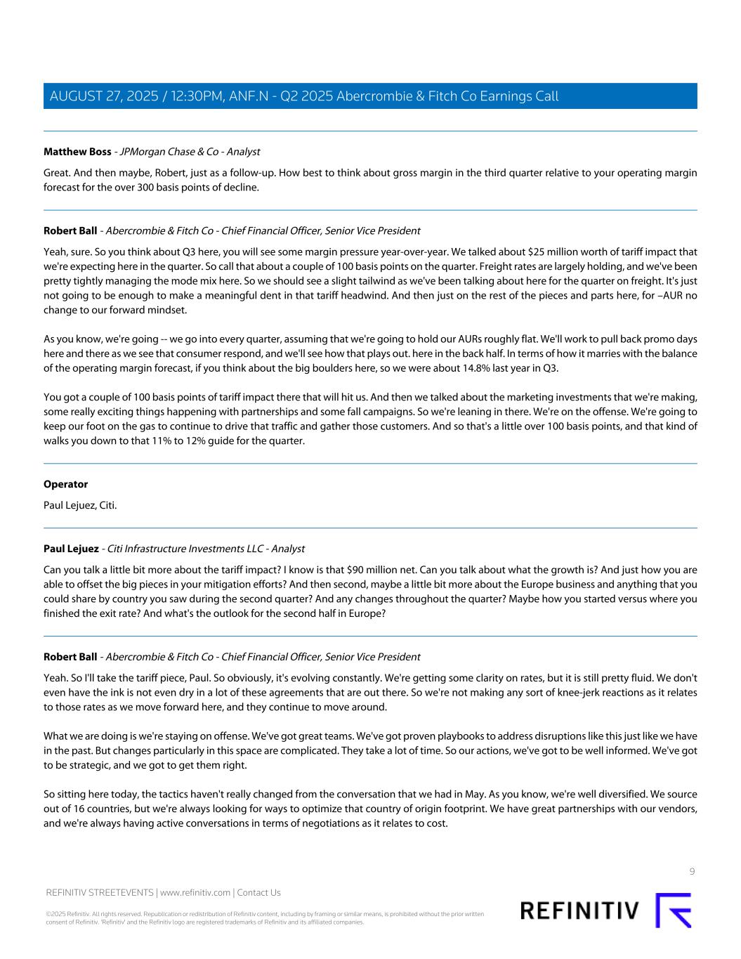 Matthew Boss - JPMorgan Chase & Co - Analyst Great. And then maybe, Robert, just as a follow-up. How best to think about gross margin in the third quarter relative to your operating margin forecast for the over 300 basis points of decline. Robert Ball - Abercrombie & Fitch Co - Chief Financial Officer, Senior Vice President Yeah, sure. So you think about Q3 here, you will see some margin pressure year-over-year. We talked about $25 million worth of tariff impact that we're expecting here in the quarter. So call that about a couple of 100 basis points on the quarter. Freight rates are largely holding, and we've been pretty tightly managing the mode mix here. So we should see a slight tailwind as we've been talking about here for the quarter on freight. It's just not going to be enough to make a meaningful dent in that tariff headwind. And then just on the rest of the pieces and parts here, for –AUR no change to our forward mindset. As you know, we're going -- we go into every quarter, assuming that we're going to hold our AURs roughly flat. We'll work to pull back promo days here and there as we see that consumer respond, and we'll see how that plays out. here in the back half. In terms of how it marries with the balance of the operating margin forecast, if you think about the big boulders here, so we were about 14.8% last year in Q3. You got a couple of 100 basis points of tariff impact there that will hit us. And then we talked about the marketing investments that we're making, some really exciting things happening with partnerships and some fall campaigns. So we're leaning in there. We're on the offense. We're going to keep our foot on the gas to continue to drive that traffic and gather those customers. And so that's a little over 100 basis points, and that kind of walks you down to that 11% to 12% guide for the quarter. Operator Paul Lejuez, Citi. Paul Lejuez - Citi Infrastructure Investments LLC - Analyst Can you talk a little bit more about the tariff impact? I know is that $90 million net. Can you talk about what the growth is? And just how you are able to offset the big pieces in your mitigation efforts? And then second, maybe a little bit more about the Europe business and anything that you could share by country you saw during the second quarter? And any changes throughout the quarter? Maybe how you started versus where you finished the exit rate? And what's the outlook for the second half in Europe? Robert Ball - Abercrombie & Fitch Co - Chief Financial Officer, Senior Vice President Yeah. So I'll take the tariff piece, Paul. So obviously, it's evolving constantly. We're getting some clarity on rates, but it is still pretty fluid. We don't even have the ink is not even dry in a lot of these agreements that are out there. So we're not making any sort of knee-jerk reactions as it relates to those rates as we move forward here, and they continue to move around. What we are doing is we're staying on offense. We've got great teams. We've got proven playbooks to address disruptions like this just like we have in the past. But changes particularly in this space are complicated. They take a lot of time. So our actions, we've got to be well informed. We've got to be strategic, and we got to get them right. So sitting here today, the tactics haven't really changed from the conversation that we had in May. As you know, we're well diversified. We source out of 16 countries, but we're always looking for ways to optimize that country of origin footprint. We have great partnerships with our vendors, and we're always having active conversations in terms of negotiations as it relates to cost. 9 REFINITIV STREETEVENTS | www.refinitiv.com | Contact Us ©2025 Refinitiv. All rights reserved. Republication or redistribution of Refinitiv content, including by framing or similar means, is prohibited without the prior written consent of Refinitiv. 'Refinitiv' and the Refinitiv logo are registered trademarks of Refinitiv and its affiliated companies. AUGUST 27, 2025 / 12:30PM, ANF.N - Q2 2025 Abercrombie & Fitch Co Earnings Call