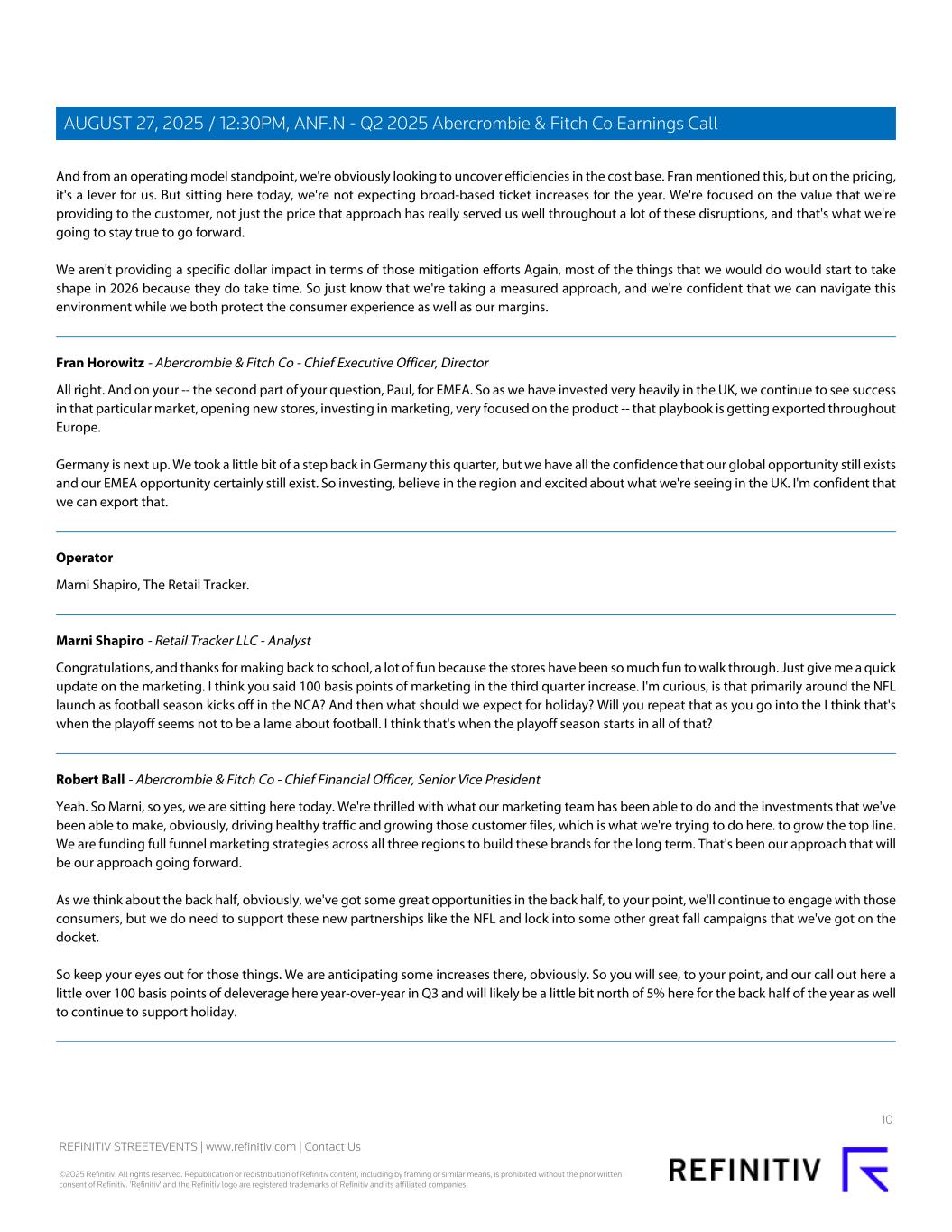 And from an operating model standpoint, we're obviously looking to uncover efficiencies in the cost base. Fran mentioned this, but on the pricing, it's a lever for us. But sitting here today, we're not expecting broad-based ticket increases for the year. We're focused on the value that we're providing to the customer, not just the price that approach has really served us well throughout a lot of these disruptions, and that's what we're going to stay true to go forward. We aren't providing a specific dollar impact in terms of those mitigation efforts Again, most of the things that we would do would start to take shape in 2026 because they do take time. So just know that we're taking a measured approach, and we're confident that we can navigate this environment while we both protect the consumer experience as well as our margins. Fran Horowitz - Abercrombie & Fitch Co - Chief Executive Officer, Director All right. And on your -- the second part of your question, Paul, for EMEA. So as we have invested very heavily in the UK, we continue to see success in that particular market, opening new stores, investing in marketing, very focused on the product -- that playbook is getting exported throughout Europe. Germany is next up. We took a little bit of a step back in Germany this quarter, but we have all the confidence that our global opportunity still exists and our EMEA opportunity certainly still exist. So investing, believe in the region and excited about what we're seeing in the UK. I'm confident that we can export that. Operator Marni Shapiro, The Retail Tracker. Marni Shapiro - Retail Tracker LLC - Analyst Congratulations, and thanks for making back to school, a lot of fun because the stores have been so much fun to walk through. Just give me a quick update on the marketing. I think you said 100 basis points of marketing in the third quarter increase. I'm curious, is that primarily around the NFL launch as football season kicks off in the NCA? And then what should we expect for holiday? Will you repeat that as you go into the I think that's when the playoff seems not to be a lame about football. I think that's when the playoff season starts in all of that? Robert Ball - Abercrombie & Fitch Co - Chief Financial Officer, Senior Vice President Yeah. So Marni, so yes, we are sitting here today. We're thrilled with what our marketing team has been able to do and the investments that we've been able to make, obviously, driving healthy traffic and growing those customer files, which is what we're trying to do here. to grow the top line. We are funding full funnel marketing strategies across all three regions to build these brands for the long term. That's been our approach that will be our approach going forward. As we think about the back half, obviously, we've got some great opportunities in the back half, to your point, we'll continue to engage with those consumers, but we do need to support these new partnerships like the NFL and lock into some other great fall campaigns that we've got on the docket. So keep your eyes out for those things. We are anticipating some increases there, obviously. So you will see, to your point, and our call out here a little over 100 basis points of deleverage here year-over-year in Q3 and will likely be a little bit north of 5% here for the back half of the year as well to continue to support holiday. 10 REFINITIV STREETEVENTS | www.refinitiv.com | Contact Us ©2025 Refinitiv. All rights reserved. Republication or redistribution of Refinitiv content, including by framing or similar means, is prohibited without the prior written consent of Refinitiv. 'Refinitiv' and the Refinitiv logo are registered trademarks of Refinitiv and its affiliated companies. AUGUST 27, 2025 / 12:30PM, ANF.N - Q2 2025 Abercrombie & Fitch Co Earnings Call