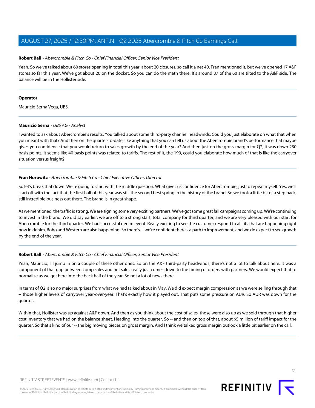 Robert Ball - Abercrombie & Fitch Co - Chief Financial Officer, Senior Vice President Yeah. So we've talked about 60 stores opening in total this year, about 20 closures, so call it a net 40. Fran mentioned it, but we've opened 17 A&F stores so far this year. We've got about 20 on the docket. So you can do the math there. It's around 37 of the 60 are tilted to the A&F side. The balance will be in the Hollister side. Operator Mauricio Serna Vega, UBS. Mauricio Serna - UBS AG - Analyst I wanted to ask about Abercrombie's results. You talked about some third-party channel headwinds. Could you just elaborate on what that when you meant with that? And then on the quarter-to-date, like anything that you can tell us about the Abercrombie brand's performance that maybe gives you confidence that you would return to sales growth by the end of the year? And then just on the gross margin for Q2, it was down 230 basis points, it seems like 40 basis points was related to tariffs. The rest of it, the 190, could you elaborate how much of that is like the carryover situation versus freight? Fran Horowitz - Abercrombie & Fitch Co - Chief Executive Officer, Director So let's break that down. We're going to start with the middle question. What gives us confidence for Abercrombie, just to repeat myself. Yes, we'll start off with the fact that the first half of this year was still the second best spring in the history of the brand. So we took a little bit of a step back, still incredible business out there. The brand is in great shape. As we mentioned, the traffic is strong. We are signing some very exciting partners. We've got some great fall campaigns coming up. We're continuing to invest in the brand. We did say earlier, we are off to a strong start, total company for third quarter, and we are very pleased with our start for Abercrombie for the third quarter. We had successful denim event. Really exciting to see the customer respond to all fits that are happening right now in denim, Boho and Western are also happening. So there's -- we're confident there's a path to improvement, and we do expect to see growth by the end of the year. Robert Ball - Abercrombie & Fitch Co - Chief Financial Officer, Senior Vice President Yeah, Mauricio, I'll jump in on a couple of these other ones. So on the A&F third-party headwinds, there's not a lot to talk about here. It was a component of that gap between comp sales and net sales really just comes down to the timing of orders with partners. We would expect that to normalize as we get here into the back half of the year. So not a lot of news there. In terms of Q2, also no major surprises from what we had talked about in May. We did expect margin compression as we were selling through that -- those higher levels of carryover year-over-year. That's exactly how it played out. That puts some pressure on AUR. So AUR was down for the quarter. Within that, Hollister was up against A&F down. And then as you think about the cost of sales, those were also up as we sold through that higher cost inventory that we had on the balance sheet. Heading into the quarter. So -- and then on top of that, about $5 million of tariff impact for the quarter. So that's kind of our -- the big moving pieces on gross margin. And I think we talked gross margin outlook a little bit earlier on the call. 12 REFINITIV STREETEVENTS | www.refinitiv.com | Contact Us ©2025 Refinitiv. All rights reserved. Republication or redistribution of Refinitiv content, including by framing or similar means, is prohibited without the prior written consent of Refinitiv. 'Refinitiv' and the Refinitiv logo are registered trademarks of Refinitiv and its affiliated companies. AUGUST 27, 2025 / 12:30PM, ANF.N - Q2 2025 Abercrombie & Fitch Co Earnings Call