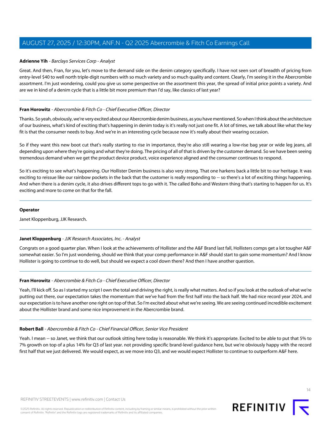 Adrienne Yih - Barclays Services Corp - Analyst Great. And then, Fran, for you, let's move to the demand side on the denim category specifically. I have not seen sort of breadth of pricing from entry-level $40 to well north triple-digit numbers with so much variety and so much quality and content. Clearly, I'm seeing it in the Abercrombie assortment. I'm just wondering, could you give us some perspective on the assortment this year, the spread of initial price points a variety. And are we in kind of a denim cycle that is a little bit more premium than I'd say, like classics of last year? Fran Horowitz - Abercrombie & Fitch Co - Chief Executive Officer, Director Thanks. So yeah, obviously, we're very excited about our Abercrombie denim business, as you have mentioned. So when I think about the architecture of our business, what's kind of exciting that's happening in denim today is it's really not just one fit. A lot of times, we talk about like what the key fit is that the consumer needs to buy. And we're in an interesting cycle because now it's really about their wearing occasion. So if they want this new boot cut that's really starting to rise in importance, they're also still wearing a low-rise bag year or wide leg jeans, all depending upon where they're going and what they're doing. The pricing of all of that is driven by the customer demand. So we have been seeing tremendous demand when we get the product device product, voice experience aligned and the consumer continues to respond. So it's exciting to see what's happening. Our Hollister Denim business is also very strong. That one harkens back a little bit to our heritage. It was exciting to reissue like our rainbow pockets in the back that the customer is really responding to -- so there's a lot of exciting things happening. And when there is a denim cycle, it also drives different tops to go with it. The called Boho and Western thing that's starting to happen for us. It's exciting and more to come on that for the fall. Operator Janet Kloppenburg, JJK Research. Janet Kloppenburg - JJK Research Associates, Inc. - Analyst Congrats on a good quarter plan. When I look at the achievements of Hollister and the A&F Brand last fall, Hollisters comps get a lot tougher A&F somewhat easier. So I'm just wondering, should we think that your comp performance in A&F should start to gain some momentum? And I know Hollister is going to continue to do well, but should we expect a cool down there? And then I have another question. Fran Horowitz - Abercrombie & Fitch Co - Chief Executive Officer, Director Yeah, I'll kick off. So as I started my script I own the total and driving the right, is really what matters. And so if you look at the outlook of what we're putting out there, our expectation takes the momentum that we've had from the first half into the back half. We had nice record year 2024, and our expectation is to have another one right on top of that. So I'm excited about what we're seeing. We are seeing continued incredible excitement about the Hollister brand and some nice improvement in the Abercrombie brand. Robert Ball - Abercrombie & Fitch Co - Chief Financial Officer, Senior Vice President Yeah. I mean -- so Janet, we think that our outlook sitting here today is reasonable. We think it's appropriate. Excited to be able to put that 5% to 7% growth on top of a plus 14% for Q3 of last year. not providing specific brand-level guidance here, but we're obviously happy with the record first half that we just delivered. We would expect, as we move into Q3, and we would expect Hollister to continue to outperform A&F here. 14 REFINITIV STREETEVENTS | www.refinitiv.com | Contact Us ©2025 Refinitiv. All rights reserved. Republication or redistribution of Refinitiv content, including by framing or similar means, is prohibited without the prior written consent of Refinitiv. 'Refinitiv' and the Refinitiv logo are registered trademarks of Refinitiv and its affiliated companies. AUGUST 27, 2025 / 12:30PM, ANF.N - Q2 2025 Abercrombie & Fitch Co Earnings Call
