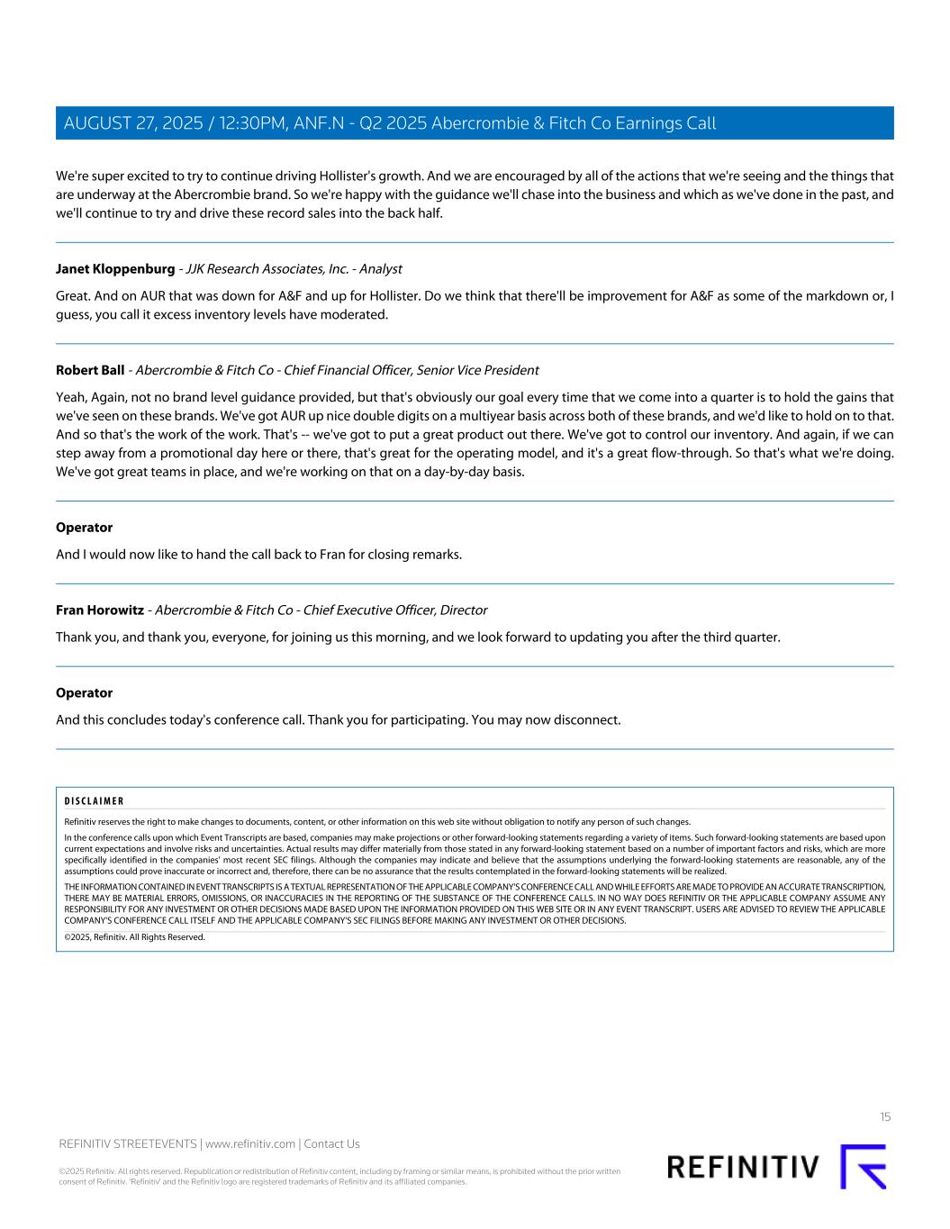 We're super excited to try to continue driving Hollister's growth. And we are encouraged by all of the actions that we're seeing and the things that are underway at the Abercrombie brand. So we're happy with the guidance we'll chase into the business and which as we've done in the past, and we'll continue to try and drive these record sales into the back half. Janet Kloppenburg - JJK Research Associates, Inc. - Analyst Great. And on AUR that was down for A&F and up for Hollister. Do we think that there'll be improvement for A&F as some of the markdown or, I guess, you call it excess inventory levels have moderated. Robert Ball - Abercrombie & Fitch Co - Chief Financial Officer, Senior Vice President Yeah, Again, not no brand level guidance provided, but that's obviously our goal every time that we come into a quarter is to hold the gains that we've seen on these brands. We've got AUR up nice double digits on a multiyear basis across both of these brands, and we'd like to hold on to that. And so that's the work of the work. That's -- we've got to put a great product out there. We've got to control our inventory. And again, if we can step away from a promotional day here or there, that's great for the operating model, and it's a great flow-through. So that's what we're doing. We've got great teams in place, and we're working on that on a day-by-day basis. Operator And I would now like to hand the call back to Fran for closing remarks. Fran Horowitz - Abercrombie & Fitch Co - Chief Executive Officer, Director Thank you, and thank you, everyone, for joining us this morning, and we look forward to updating you after the third quarter. Operator And this concludes today's conference call. Thank you for participating. You may now disconnect. D I S C L A I M E R Refinitiv reserves the right to make changes to documents, content, or other information on this web site without obligation to notify any person of such changes. In the conference calls upon which Event Transcripts are based, companies may make projections or other forward-looking statements regarding a variety of items. Such forward-looking statements are based upon current expectations and involve risks and uncertainties. Actual results may differ materially from those stated in any forward-looking statement based on a number of important factors and risks, which are more specifically identified in the companies' most recent SEC filings. Although the companies may indicate and believe that the assumptions underlying the forward-looking statements are reasonable, any of the assumptions could prove inaccurate or incorrect and, therefore, there can be no assurance that the results contemplated in the forward-looking statements will be realized. THE INFORMATION CONTAINED IN EVENT TRANSCRIPTS IS A TEXTUAL REPRESENTATION OF THE APPLICABLE COMPANY'S CONFERENCE CALL AND WHILE EFFORTS ARE MADE TO PROVIDE AN ACCURATE TRANSCRIPTION, THERE MAY BE MATERIAL ERRORS, OMISSIONS, OR INACCURACIES IN THE REPORTING OF THE SUBSTANCE OF THE CONFERENCE CALLS. IN NO WAY DOES REFINITIV OR THE APPLICABLE COMPANY ASSUME ANY RESPONSIBILITY FOR ANY INVESTMENT OR OTHER DECISIONS MADE BASED UPON THE INFORMATION PROVIDED ON THIS WEB SITE OR IN ANY EVENT TRANSCRIPT. USERS ARE ADVISED TO REVIEW THE APPLICABLE COMPANY'S CONFERENCE CALL ITSELF AND THE APPLICABLE COMPANY'S SEC FILINGS BEFORE MAKING ANY INVESTMENT OR OTHER DECISIONS. ©2025, Refinitiv. All Rights Reserved. 16456579-2025-08-27T19:46:37.780 15 REFINITIV STREETEVENTS | www.refinitiv.com | Contact Us ©2025 Refinitiv. All rights reserved. Republication or redistribution of Refinitiv content, including by framing or similar means, is prohibited without the prior written consent of Refinitiv. 'Refinitiv' and the Refinitiv logo are registered trademarks of Refinitiv and its affiliated companies. AUGUST 27, 2025 / 12:30PM, ANF.N - Q2 2025 Abercrombie & Fitch Co Earnings Call