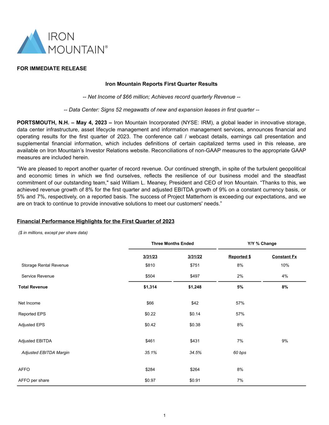 FOR IMMEDIATE RELEASE Iron Mountain Reports First Quarter Results -- Net Income of $66 million; Achieves record quarterly Revenue -- -- Data Center: Signs 52 megawatts of new and expansion leases in first quarter -- PORTSMOUTH, N.H. – May 4, 2023 – Iron Mountain Incorporated (NYSE: IRM), a global leader in innovative storage, data center infrastructure, asset lifecycle management and information management services, announces financial and operating results for the first quarter of 2023. The conference call / webcast details, earnings call presentation and supplemental financial information, which includes definitions of certain capitalized terms used in this release, are available on Iron Mountain’s Investor Relations website. Reconciliations of non-GAAP measures to the appropriate GAAP measures are included herein. “We are pleased to report another quarter of record revenue. Our continued strength, in spite of the turbulent geopolitical and economic times in which we find ourselves, reflects the resilience of our business model and the steadfast commitment of our outstanding team," said William L. Meaney, President and CEO of Iron Mountain. “Thanks to this, we achieved revenue growth of 8% for the first quarter and adjusted EBITDA growth of 9% on a constant currency basis, or 5% and 7%, respectively, on a reported basis. The success of Project Matterhorn is exceeding our expectations, and we are on track to continue to provide innovative solutions to meet our customers' needs.” Financial Performance Highlights for the First Quarter of 2023 ($ in millions, except per share data) Three Months Ended Y/Y % Change 3/31/23 3/31/22 Reported $ Constant Fx Storage Rental Revenue $810 $751 8% 10% Service Revenue $504 $497 2% 4% Total Revenue $1,314 $1,248 5% 8% Net Income $66 $42 57% Reported EPS $0.22 $0.14 57% Adjusted EPS $0.42 $0.38 8% Adjusted EBITDA $461 $431 7% 9% Adjusted EBITDA Margin 35.1% 34.5% 60 bps AFFO $284 $264 8% AFFO per share $0.97 $0.91 7% 1