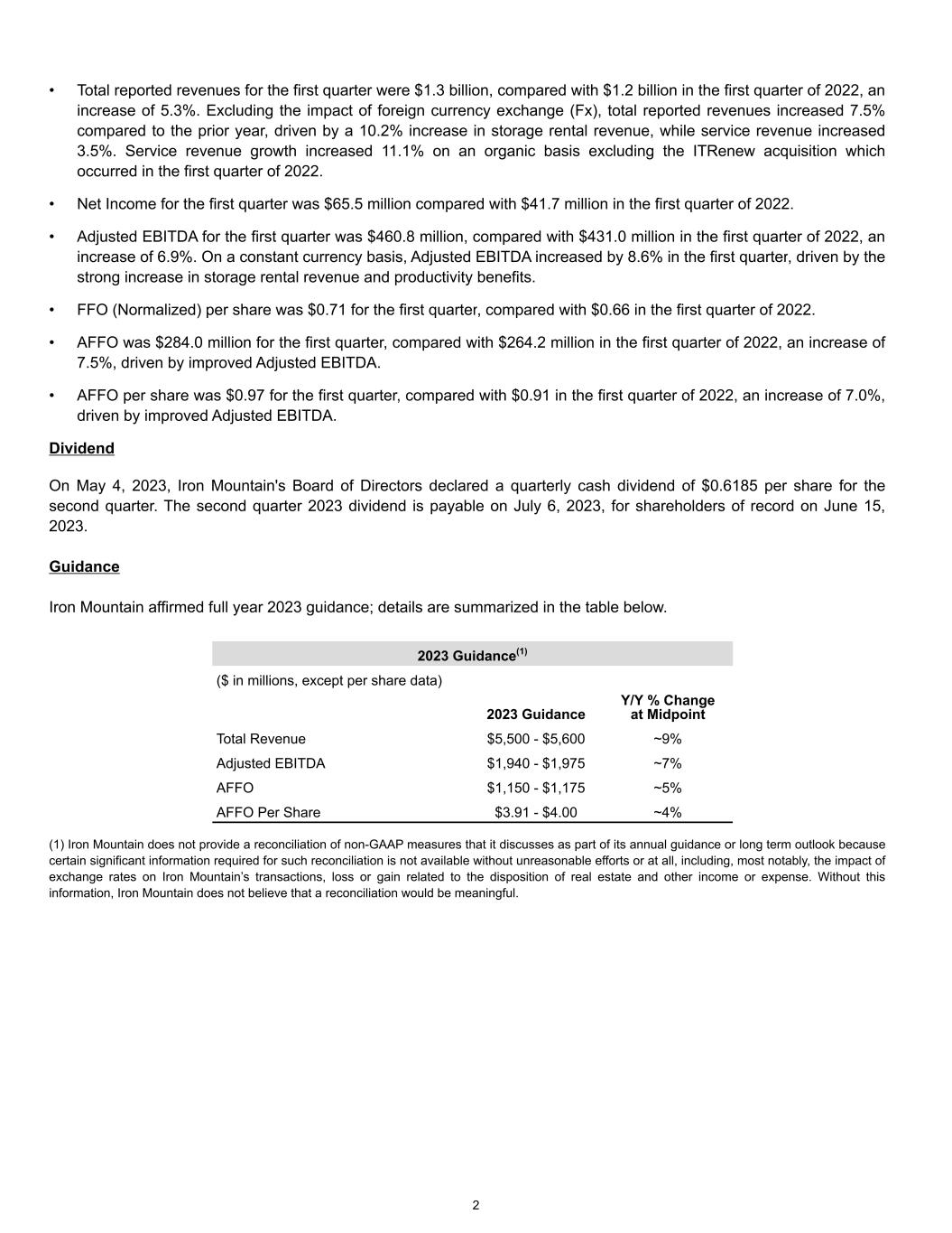 • Total reported revenues for the first quarter were $1.3 billion, compared with $1.2 billion in the first quarter of 2022, an increase of 5.3%. Excluding the impact of foreign currency exchange (Fx), total reported revenues increased 7.5% compared to the prior year, driven by a 10.2% increase in storage rental revenue, while service revenue increased 3.5%. Service revenue growth increased 11.1% on an organic basis excluding the ITRenew acquisition which occurred in the first quarter of 2022. • Net Income for the first quarter was $65.5 million compared with $41.7 million in the first quarter of 2022. • Adjusted EBITDA for the first quarter was $460.8 million, compared with $431.0 million in the first quarter of 2022, an increase of 6.9%. On a constant currency basis, Adjusted EBITDA increased by 8.6% in the first quarter, driven by the strong increase in storage rental revenue and productivity benefits. • FFO (Normalized) per share was $0.71 for the first quarter, compared with $0.66 in the first quarter of 2022. • AFFO was $284.0 million for the first quarter, compared with $264.2 million in the first quarter of 2022, an increase of 7.5%, driven by improved Adjusted EBITDA. • AFFO per share was $0.97 for the first quarter, compared with $0.91 in the first quarter of 2022, an increase of 7.0%, driven by improved Adjusted EBITDA. Dividend On May 4, 2023, Iron Mountain's Board of Directors declared a quarterly cash dividend of $0.6185 per share for the second quarter. The second quarter 2023 dividend is payable on July 6, 2023, for shareholders of record on June 15, 2023. Guidance Iron Mountain affirmed full year 2023 guidance; details are summarized in the table below. 2023 Guidance(1) ($ in millions, except per share data) 2023 Guidance Y/Y % Change at Midpoint Total Revenue $5,500 - $5,600 ~9% Adjusted EBITDA $1,940 - $1,975 ~7% AFFO $1,150 - $1,175 ~5% AFFO Per Share $3.91 - $4.00 ~4% (1) Iron Mountain does not provide a reconciliation of non-GAAP measures that it discusses as part of its annual guidance or long term outlook because certain significant information required for such reconciliation is not available without unreasonable efforts or at all, including, most notably, the impact of exchange rates on Iron Mountain’s transactions, loss or gain related to the disposition of real estate and other income or expense. Without this information, Iron Mountain does not believe that a reconciliation would be meaningful. 2