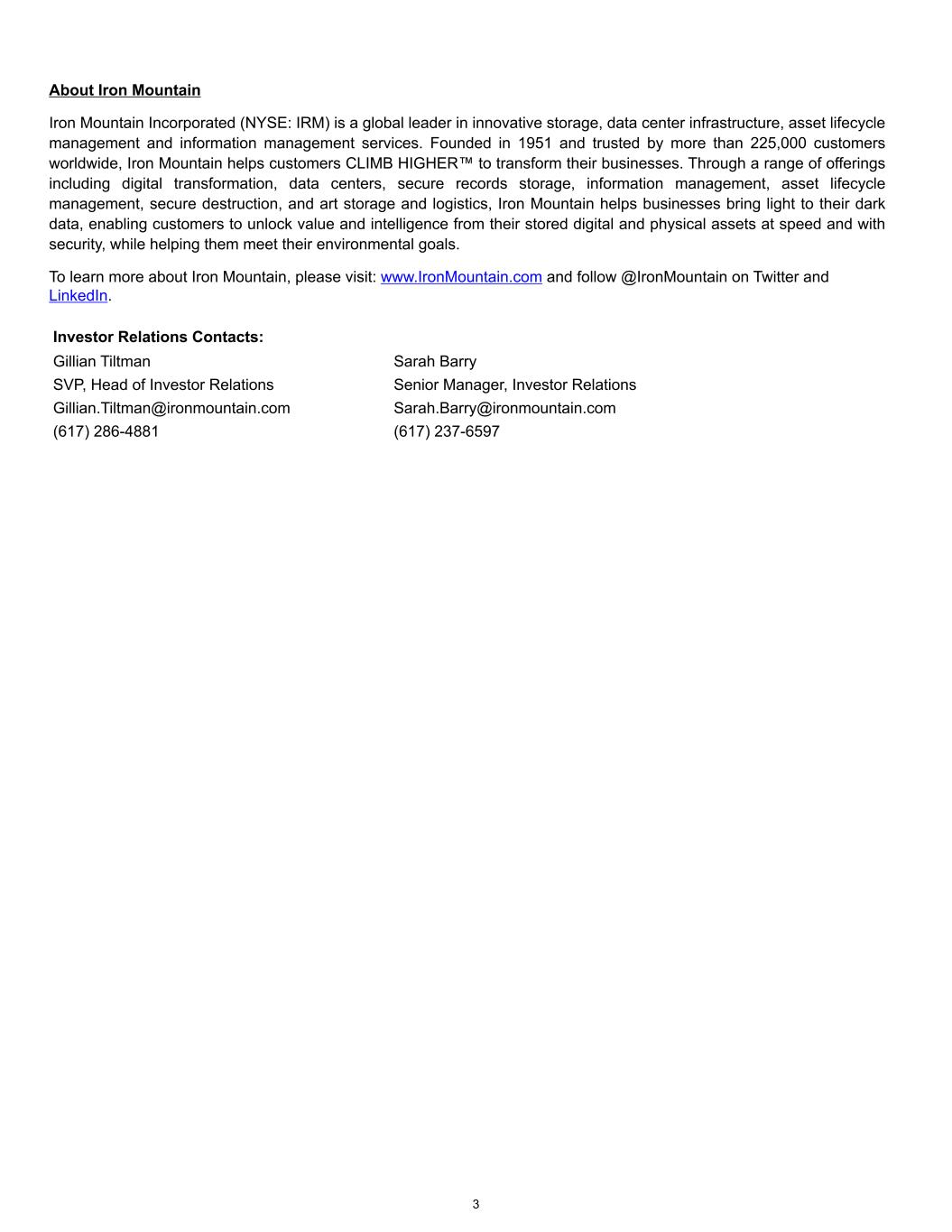 About Iron Mountain Iron Mountain Incorporated (NYSE: IRM) is a global leader in innovative storage, data center infrastructure, asset lifecycle management and information management services. Founded in 1951 and trusted by more than 225,000 customers worldwide, Iron Mountain helps customers CLIMB HIGHER™ to transform their businesses. Through a range of offerings including digital transformation, data centers, secure records storage, information management, asset lifecycle management, secure destruction, and art storage and logistics, Iron Mountain helps businesses bring light to their dark data, enabling customers to unlock value and intelligence from their stored digital and physical assets at speed and with security, while helping them meet their environmental goals. To learn more about Iron Mountain, please visit: www.IronMountain.com and follow @IronMountain on Twitter and LinkedIn. Investor Relations Contacts: Gillian Tiltman Sarah Barry SVP, Head of Investor Relations Senior Manager, Investor Relations Gillian.Tiltman@ironmountain.com Sarah.Barry@ironmountain.com (617) 286-4881 (617) 237-6597 3