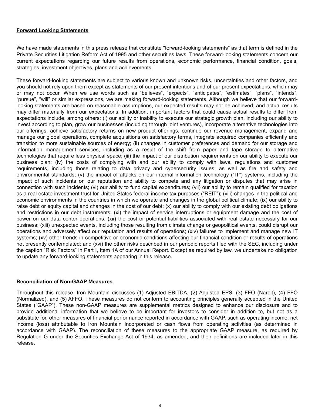 Forward Looking Statements We have made statements in this press release that constitute "forward-looking statements" as that term is defined in the Private Securities Litigation Reform Act of 1995 and other securities laws. These forward-looking statements concern our current expectations regarding our future results from operations, economic performance, financial condition, goals, strategies, investment objectives, plans and achievements. These forward-looking statements are subject to various known and unknown risks, uncertainties and other factors, and you should not rely upon them except as statements of our present intentions and of our present expectations, which may or may not occur. When we use words such as “believes”, “expects”, “anticipates”, “estimates”, “plans”, “intends”, “pursue”, “will” or similar expressions, we are making forward-looking statements. Although we believe that our forward- looking statements are based on reasonable assumptions, our expected results may not be achieved, and actual results may differ materially from our expectations. In addition, important factors that could cause actual results to differ from expectations include, among others: (i) our ability or inability to execute our strategic growth plan, including our ability to invest according to plan, grow our businesses (including through joint ventures), incorporate alternative technologies into our offerings, achieve satisfactory returns on new product offerings, continue our revenue management, expand and manage our global operations, complete acquisitions on satisfactory terms, integrate acquired companies efficiently and transition to more sustainable sources of energy; (ii) changes in customer preferences and demand for our storage and information management services, including as a result of the shift from paper and tape storage to alternative technologies that require less physical space; (iii) the impact of our distribution requirements on our ability to execute our business plan; (iv) the costs of complying with and our ability to comply with laws, regulations and customer requirements, including those relating to data privacy and cybersecurity issues, as well as fire and safety and environmental standards; (v) the impact of attacks on our internal information technology (“IT”) systems, including the impact of such incidents on our reputation and ability to compete and any litigation or disputes that may arise in connection with such incidents; (vi) our ability to fund capital expenditures; (vii) our ability to remain qualified for taxation as a real estate investment trust for United States federal income tax purposes (“REIT”); (viii) changes in the political and economic environments in the countries in which we operate and changes in the global political climate; (ix) our ability to raise debt or equity capital and changes in the cost of our debt; (x) our ability to comply with our existing debt obligations and restrictions in our debt instruments; (xi) the impact of service interruptions or equipment damage and the cost of power on our data center operations; (xii) the cost or potential liabilities associated with real estate necessary for our business; (xiii) unexpected events, including those resulting from climate change or geopolitical events, could disrupt our operations and adversely affect our reputation and results of operations; (xiv) failures to implement and manage new IT systems; (xv) other trends in competitive or economic conditions affecting our financial condition or results of operations not presently contemplated; and (xvi) the other risks described in our periodic reports filed with the SEC, including under the caption “Risk Factors” in Part I, Item 1A of our Annual Report. Except as required by law, we undertake no obligation to update any forward-looking statements appearing in this release. Reconciliation of Non-GAAP Measures Throughout this release, Iron Mountain discusses (1) Adjusted EBITDA, (2) Adjusted EPS, (3) FFO (Nareit), (4) FFO (Normalized), and (5) AFFO. These measures do not conform to accounting principles generally accepted in the United States (“GAAP”). These non-GAAP measures are supplemental metrics designed to enhance our disclosure and to provide additional information that we believe to be important for investors to consider in addition to, but not as a substitute for, other measures of financial performance reported in accordance with GAAP, such as operating income, net income (loss) attributable to Iron Mountain Incorporated or cash flows from operating activities (as determined in accordance with GAAP). The reconciliation of these measures to the appropriate GAAP measure, as required by Regulation G under the Securities Exchange Act of 1934, as amended, and their definitions are included later in this release. 4