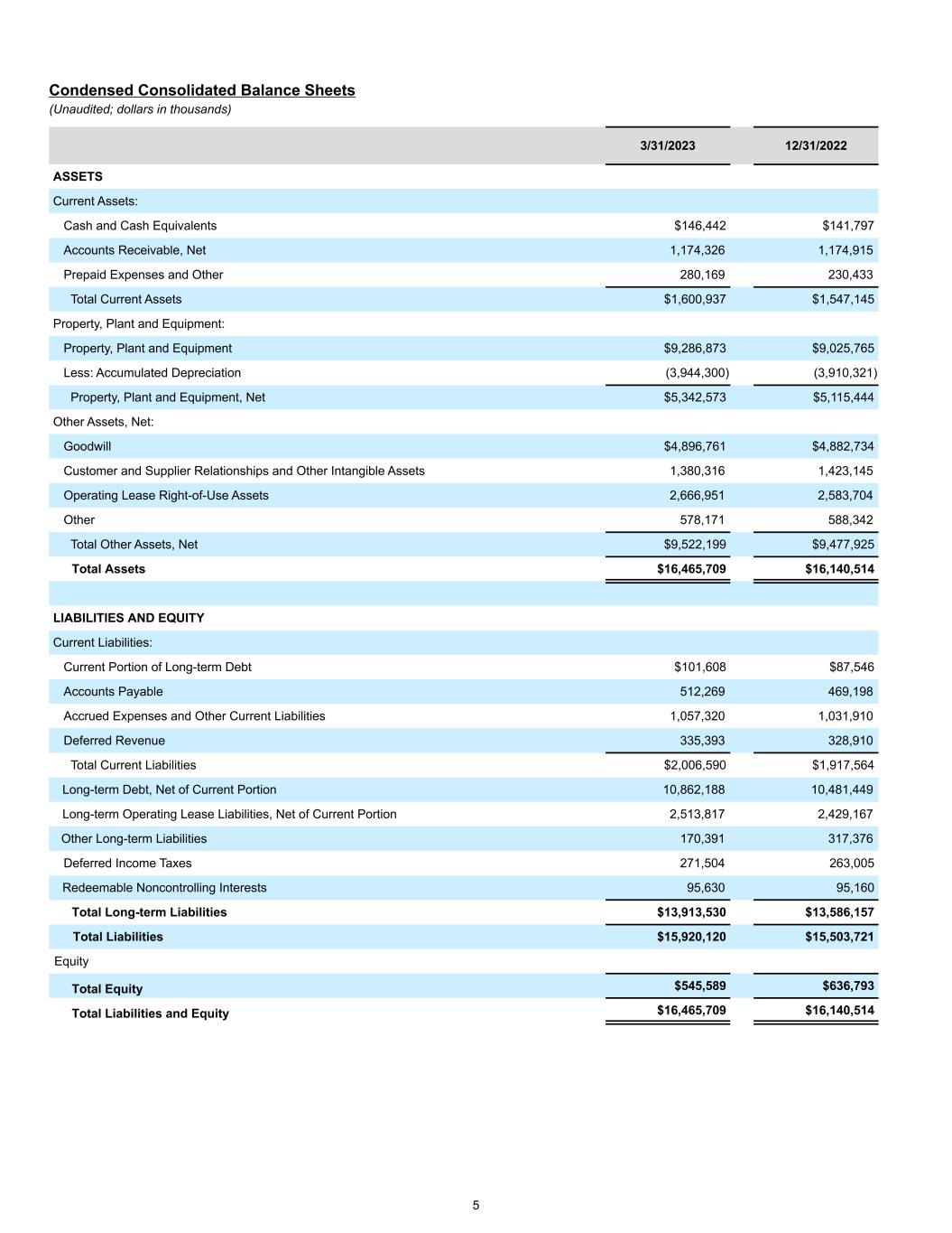 Condensed Consolidated Balance Sheets (Unaudited; dollars in thousands) 3/31/2023 12/31/2022 ASSETS Current Assets: Cash and Cash Equivalents $146,442 $141,797 Accounts Receivable, Net 1,174,326 1,174,915 Prepaid Expenses and Other 280,169 230,433 Total Current Assets $1,600,937 $1,547,145 Property, Plant and Equipment: Property, Plant and Equipment $9,286,873 $9,025,765 Less: Accumulated Depreciation (3,944,300) (3,910,321) Property, Plant and Equipment, Net $5,342,573 $5,115,444 Other Assets, Net: Goodwill $4,896,761 $4,882,734 Customer and Supplier Relationships and Other Intangible Assets 1,380,316 1,423,145 Operating Lease Right-of-Use Assets 2,666,951 2,583,704 Other 578,171 588,342 Total Other Assets, Net $9,522,199 $9,477,925 Total Assets $16,465,709 $16,140,514 LIABILITIES AND EQUITY Current Liabilities: Current Portion of Long-term Debt $101,608 $87,546 Accounts Payable 512,269 469,198 Accrued Expenses and Other Current Liabilities 1,057,320 1,031,910 Deferred Revenue 335,393 328,910 Total Current Liabilities $2,006,590 $1,917,564 Long-term Debt, Net of Current Portion 10,862,188 10,481,449 Long-term Operating Lease Liabilities, Net of Current Portion 2,513,817 2,429,167 Other Long-term Liabilities 170,391 317,376 Deferred Income Taxes 271,504 263,005 Redeemable Noncontrolling Interests 95,630 95,160 Total Long-term Liabilities $13,913,530 $13,586,157 Total Liabilities $15,920,120 $15,503,721 Equity Total Equity $545,589 $636,793 Total Liabilities and Equity $16,465,709 $16,140,514 5