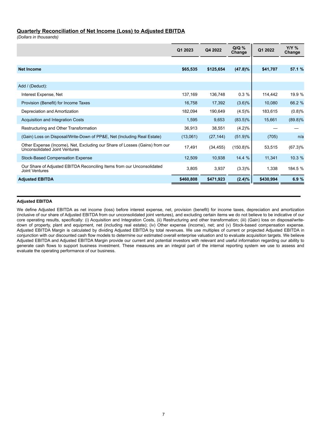 Quarterly Reconciliation of Net Income (Loss) to Adjusted EBITDA (Dollars in thousands) Q1 2023 Q4 2022 Q/Q % Change Q1 2022 Y/Y % Change Net Income $65,535 $125,654 (47.8) % $41,707 57.1 % Add / (Deduct): Interest Expense, Net 137,169 136,748 0.3 % 114,442 19.9 % Provision (Benefit) for Income Taxes 16,758 17,392 (3.6) % 10,080 66.2 % Depreciation and Amortization 182,094 190,649 (4.5) % 183,615 (0.8) % Acquisition and Integration Costs 1,595 9,653 (83.5) % 15,661 (89.8) % Restructuring and Other Transformation 36,913 38,551 (4.2) % — — (Gain) Loss on Disposal/Write-Down of PP&E, Net (Including Real Estate) (13,061) (27,144) (51.9) % (705) n/a Other Expense (Income), Net, Excluding our Share of Losses (Gains) from our Unconsolidated Joint Ventures 17,491 (34,455) (150.8) % 53,515 (67.3) % Stock-Based Compensation Expense 12,509 10,938 14.4 % 11,341 10.3 % Our Share of Adjusted EBITDA Reconciling Items from our Unconsolidated Joint Ventures 3,805 3,937 (3.3) % 1,338 184.5 % Adjusted EBITDA $460,808 $471,923 (2.4) % $430,994 6.9 % Adjusted EBITDA We define Adjusted EBITDA as net income (loss) before interest expense, net, provision (benefit) for income taxes, depreciation and amortization (inclusive of our share of Adjusted EBITDA from our unconsolidated joint ventures), and excluding certain items we do not believe to be indicative of our core operating results, specifically: (i) Acquisition and Integration Costs, (ii) Restructuring and other transformation; (iii) (Gain) loss on disposal/write- down of property, plant and equipment, net (including real estate); (iv) Other expense (income), net; and (v) Stock-based compensation expense. Adjusted EBITDA Margin is calculated by dividing Adjusted EBITDA by total revenues. We use multiples of current or projected Adjusted EBITDA in conjunction with our discounted cash flow models to determine our estimated overall enterprise valuation and to evaluate acquisition targets. We believe Adjusted EBITDA and Adjusted EBITDA Margin provide our current and potential investors with relevant and useful information regarding our ability to generate cash flows to support business investment. These measures are an integral part of the internal reporting system we use to assess and evaluate the operating performance of our business. 7