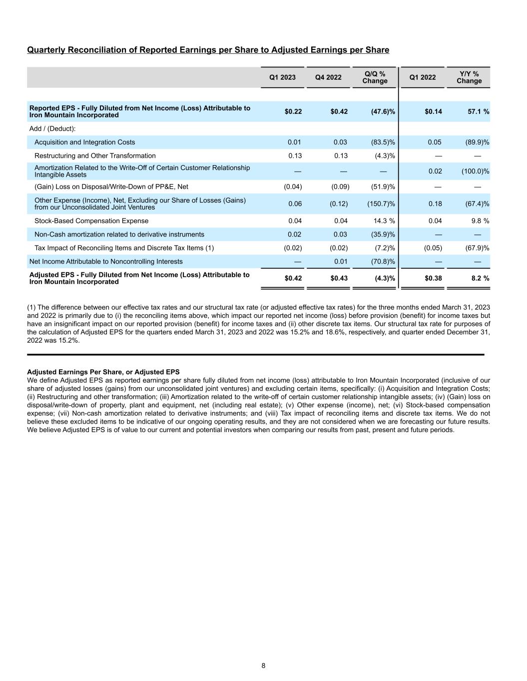 Quarterly Reconciliation of Reported Earnings per Share to Adjusted Earnings per Share Q1 2023 Q4 2022 Q/Q % Change Q1 2022 Y/Y % Change Reported EPS - Fully Diluted from Net Income (Loss) Attributable to Iron Mountain Incorporated $0.22 $0.42 (47.6) % $0.14 57.1 % Add / (Deduct): Acquisition and Integration Costs 0.01 0.03 (83.5) % 0.05 (89.9) % Restructuring and Other Transformation 0.13 0.13 (4.3) % — — Amortization Related to the Write-Off of Certain Customer Relationship Intangible Assets — — — 0.02 (100.0) % (Gain) Loss on Disposal/Write-Down of PP&E, Net (0.04) (0.09) (51.9) % — — Other Expense (Income), Net, Excluding our Share of Losses (Gains) from our Unconsolidated Joint Ventures 0.06 (0.12) (150.7) % 0.18 (67.4) % Stock-Based Compensation Expense 0.04 0.04 14.3 % 0.04 9.8 % Non-Cash amortization related to derivative instruments 0.02 0.03 (35.9) % — — Tax Impact of Reconciling Items and Discrete Tax Items (1) (0.02) (0.02) (7.2) % (0.05) (67.9) % Net Income Attributable to Noncontrolling Interests — 0.01 (70.8) % — — Adjusted EPS - Fully Diluted from Net Income (Loss) Attributable to Iron Mountain Incorporated $0.42 $0.43 (4.3) % $0.38 8.2 % (1) The difference between our effective tax rates and our structural tax rate (or adjusted effective tax rates) for the three months ended March 31, 2023 and 2022 is primarily due to (i) the reconciling items above, which impact our reported net income (loss) before provision (benefit) for income taxes but have an insignificant impact on our reported provision (benefit) for income taxes and (ii) other discrete tax items. Our structural tax rate for purposes of the calculation of Adjusted EPS for the quarters ended March 31, 2023 and 2022 was 15.2% and 18.6%, respectively, and quarter ended December 31, 2022 was 15.2%. Adjusted Earnings Per Share, or Adjusted EPS We define Adjusted EPS as reported earnings per share fully diluted from net income (loss) attributable to Iron Mountain Incorporated (inclusive of our share of adjusted losses (gains) from our unconsolidated joint ventures) and excluding certain items, specifically: (i) Acquisition and Integration Costs; (ii) Restructuring and other transformation; (iii) Amortization related to the write-off of certain customer relationship intangible assets; (iv) (Gain) loss on disposal/write-down of property, plant and equipment, net (including real estate); (v) Other expense (income), net; (vi) Stock-based compensation expense; (vii) Non-cash amortization related to derivative instruments; and (viii) Tax impact of reconciling items and discrete tax items. We do not believe these excluded items to be indicative of our ongoing operating results, and they are not considered when we are forecasting our future results. We believe Adjusted EPS is of value to our current and potential investors when comparing our results from past, present and future periods. 8