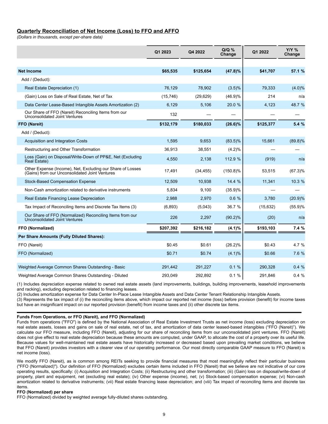 Quarterly Reconciliation of Net Income (Loss) to FFO and AFFO (Dollars in thousands, except per-share data) Q1 2023 Q4 2022 Q/Q % Change Q1 2022 Y/Y % Change Net Income $65,535 $125,654 (47.8) % $41,707 57.1 % Add / (Deduct): Real Estate Depreciation (1) 76,129 78,902 (3.5) % 79,333 (4.0) % (Gain) Loss on Sale of Real Estate, Net of Tax (15,746) (29,629) (46.9) % 214 n/a Data Center Lease-Based Intangible Assets Amortization (2) 6,129 5,106 20.0 % 4,123 48.7 % Our Share of FFO (Nareit) Reconciling Items from our Unconsolidated Joint Ventures 132 — — — — FFO (Nareit) $132,179 $180,033 (26.6) % $125,377 5.4 % Add / (Deduct): Acquisition and Integration Costs 1,595 9,653 (83.5) % 15,661 (89.8) % Restructuring and Other Transformation 36,913 38,551 (4.2) % — — Loss (Gain) on Disposal/Write-Down of PP&E, Net (Excluding Real Estate) 4,550 2,138 112.9 % (919) n/a Other Expense (Income), Net, Excluding our Share of Losses (Gains) from our Unconsolidated Joint Ventures 17,491 (34,455) (150.8) % 53,515 (67.3) % Stock-Based Compensation Expense 12,509 10,938 14.4 % 11,341 10.3 % Non-Cash amortization related to derivative instruments 5,834 9,100 (35.9) % — — Real Estate Financing Lease Depreciation 2,988 2,970 0.6 % 3,780 (20.9) % Tax Impact of Reconciling Items and Discrete Tax Items (3) (6,893) (5,043) 36.7 % (15,632) (55.9) % Our Share of FFO (Normalized) Reconciling Items from our Unconsolidated Joint Ventures 226 2,297 (90.2) % (20) n/a FFO (Normalized) $207,392 $216,182 (4.1) % $193,103 7.4 % Per Share Amounts (Fully Diluted Shares): FFO (Nareit) $0.45 $0.61 (26.2) % $0.43 4.7 % FFO (Normalized) $0.71 $0.74 (4.1) % $0.66 7.6 % Weighted Average Common Shares Outstanding - Basic 291,442 291,227 0.1 % 290,328 0.4 % Weighted Average Common Shares Outstanding - Diluted 293,049 292,892 0.1 % 291,846 0.4 % (1) Includes depreciation expense related to owned real estate assets (land improvements, buildings, building improvements, leasehold improvements and racking), excluding depreciation related to financing leases. (2) Includes amortization expense for Data Center In-Place Lease Intangible Assets and Data Center Tenant Relationship Intangible Assets. (3) Represents the tax impact of (i) the reconciling items above, which impact our reported net income (loss) before provision (benefit) for income taxes but have an insignificant impact on our reported provision (benefit) from income taxes and (ii) other discrete tax items. Funds From Operations, or FFO (Nareit), and FFO (Normalized) Funds from operations ("FFO") is defined by the National Association of Real Estate Investment Trusts as net income (loss) excluding depreciation on real estate assets, losses and gains on sale of real estate, net of tax, and amortization of data center leased-based intangibles (“FFO (Nareit)”). We calculate our FFO measure, including FFO (Nareit), adjusting for our share of reconciling items from our unconsolidated joint ventures. FFO (Nareit) does not give effect to real estate depreciation because these amounts are computed, under GAAP, to allocate the cost of a property over its useful life. Because values for well-maintained real estate assets have historically increased or decreased based upon prevailing market conditions, we believe that FFO (Nareit) provides investors with a clearer view of our operating performance. Our most directly comparable GAAP measure to FFO (Nareit) is net income (loss). We modify FFO (Nareit), as is common among REITs seeking to provide financial measures that most meaningfully reflect their particular business ("FFO (Normalized)"). Our definition of FFO (Normalized) excludes certain items included in FFO (Nareit) that we believe are not indicative of our core operating results, specifically: (i) Acquisition and Integration Costs; (ii) Restructuring and other transformation; (iii) (Gain) loss on disposal/write-down of property, plant and equipment, net (excluding real estate); (iv) Other expense (income), net; (v) Stock-based compensation expense; (vi) Non-cash amortization related to derivative instruments; (vii) Real estate financing lease depreciation; and (viii) Tax impact of reconciling items and discrete tax items. FFO (Normalized) per share FFO (Normalized) divided by weighted average fully-diluted shares outstanding. 9