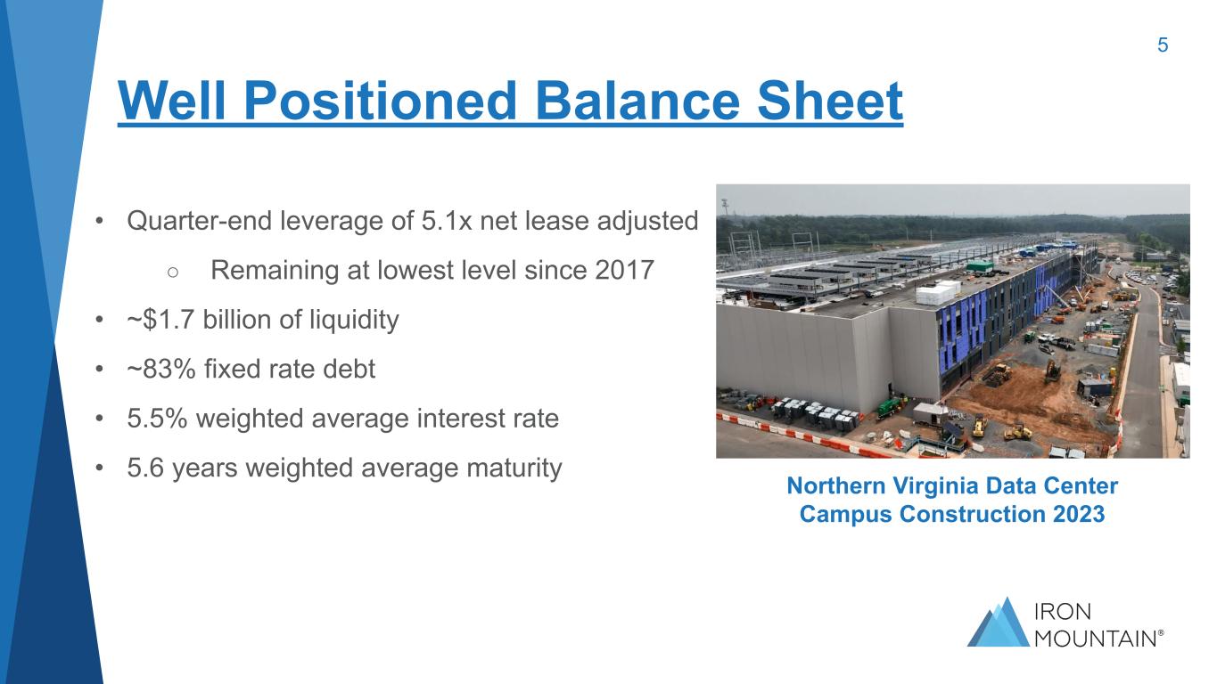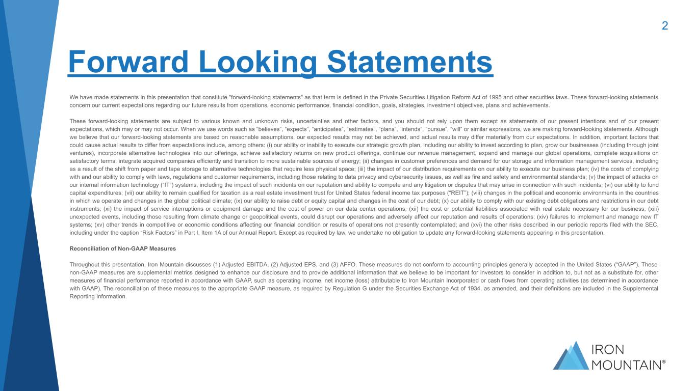 We have made statements in this presentation that constitute "forward-looking statements" as that term is defined in the Private Securities Litigation Reform Act of 1995 and other securities laws. These forward-looking statements concern our current expectations regarding our future results from operations, economic performance, financial condition, goals, strategies, investment objectives, plans and achievements. These forward-looking statements are subject to various known and unknown risks, uncertainties and other factors, and you should not rely upon them except as statements of our present intentions and of our present expectations, which may or may not occur. When we use words such as “believes”, “expects”, “anticipates”, “estimates”, “plans”, “intends”, “pursue”, “will” or similar expressions, we are making forward-looking statements. Although we believe that our forward-looking statements are based on reasonable assumptions, our expected results may not be achieved, and actual results may differ materially from our expectations. In addition, important factors that could cause actual results to differ from expectations include, among others: (i) our ability or inability to execute our strategic growth plan, including our ability to invest according to plan, grow our businesses (including through joint ventures), incorporate alternative technologies into our offerings, achieve satisfactory returns on new product offerings, continue our revenue management, expand and manage our global operations, complete acquisitions on satisfactory terms, integrate acquired companies efficiently and transition to more sustainable sources of energy; (ii) changes in customer preferences and demand for our storage and information management services, including as a result of the shift from paper and tape storage to alternative technologies that require less physical space; (iii) the impact of our distribution requirements on our ability to execute our business plan; (iv) the costs of complying with and our ability to comply with laws, regulations and customer requirements, including those relating to data privacy and cybersecurity issues, as well as fire and safety and environmental standards; (v) the impact of attacks on our internal information technology (“IT”) systems, including the impact of such incidents on our reputation and ability to compete and any litigation or disputes that may arise in connection with such incidents; (vi) our ability to fund capital expenditures; (vii) our ability to remain qualified for taxation as a real estate investment trust for United States federal income tax purposes (“REIT”); (viii) changes in the political and economic environments in the countries in which we operate and changes in the global political climate; (ix) our ability to raise debt or equity capital and changes in the cost of our debt; (x) our ability to comply with our existing debt obligations and restrictions in our debt instruments; (xi) the impact of service interruptions or equipment damage and the cost of power on our data center operations; (xii) the cost or potential liabilities associated with real estate necessary for our business; (xiii) unexpected events, including those resulting from climate change or geopolitical events, could disrupt our operations and adversely affect our reputation and results of operations; (xiv) failures to implement and manage new IT systems; (xv) other trends in competitive or economic conditions affecting our financial condition or results of operations not presently contemplated; and (xvi) the other risks described in our periodic reports filed with the SEC, including under the caption “Risk Factors” in Part I, Item 1A of our Annual Report. Except as required by law, we undertake no obligation to update any forward-looking statements appearing in this presentation. Reconciliation of Non-GAAP Measures Throughout this presentation, Iron Mountain discusses (1) Adjusted EBITDA, (2) Adjusted EPS, and (3) AFFO. These measures do not conform to accounting principles generally accepted in the United States (“GAAP”). These non-GAAP measures are supplemental metrics designed to enhance our disclosure and to provide additional information that we believe to be important for investors to consider in addition to, but not as a substitute for, other measures of financial performance reported in accordance with GAAP, such as operating income, net income (loss) attributable to Iron Mountain Incorporated or cash flows from operating activities (as determined in accordance with GAAP). The reconciliation of these measures to the appropriate GAAP measure, as required by Regulation G under the Securities Exchange Act of 1934, as amended, and their definitions are included in the Supplemental Reporting Information. 2 Forward Looking Statements