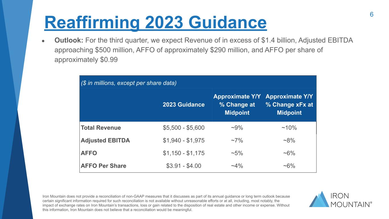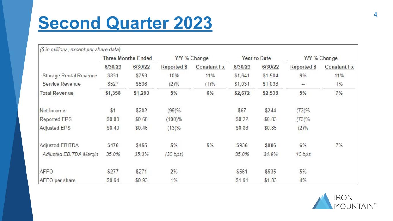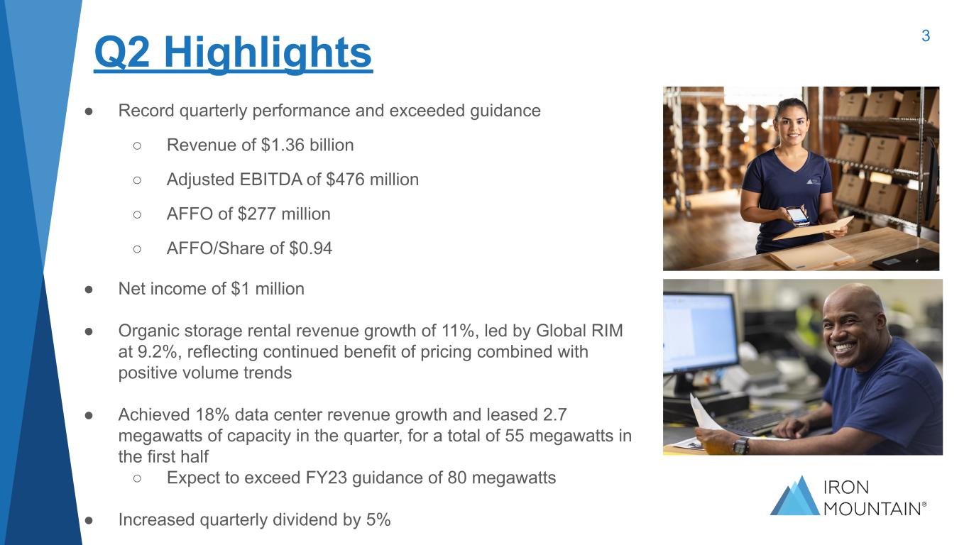 3Q2 Highlights ● Record quarterly performance and exceeded guidance ○ Revenue of $1.36 billion ○ Adjusted EBITDA of $476 million ○ AFFO of $277 million ○ AFFO/Share of $0.94 ● Net income of $1 million ● Organic storage rental revenue growth of 11%, led by Global RIM at 9.2%, reflecting continued benefit of pricing combined with positive volume trends ● Achieved 18% data center revenue growth and leased 2.7 megawatts of capacity in the quarter, for a total of 55 megawatts in the first half ○ Expect to exceed FY23 guidance of 80 megawatts ● Increased quarterly dividend by 5%