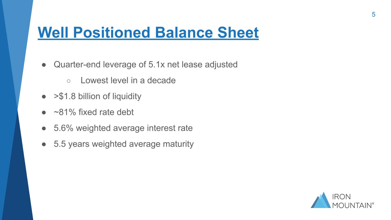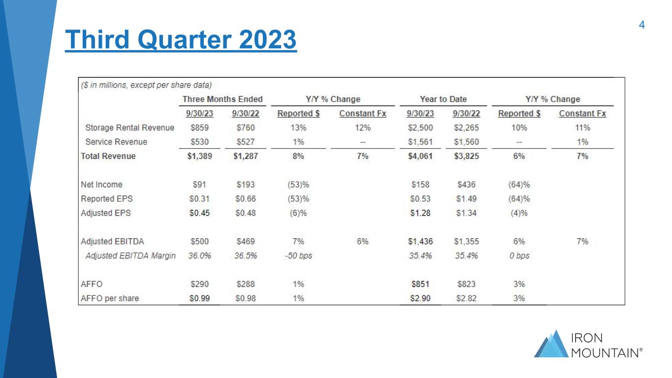 We have made statements in this presentation that constitute "forward-looking statements" as that term is defined in the Private Securities Litigation Reform Act of 1995 and other securities laws. These forward-looking statements concern our current expectations regarding our future results from operations, economic performance, financial condition, goals, strategies, investment objectives, plans and achievements. These forward-looking statements are subject to various known and unknown risks, uncertainties and other factors, and you should not rely upon them except as statements of our present intentions and of our present expectations, which may or may not occur. When we use words such as “believes”, “expects”, “anticipates”, “estimates”, “plans”, “intends”, “projects”, “pursue”, “will” or similar expressions, we are making forward-looking statements. Although we believe that our forward-looking statements are based on reasonable assumptions, our expected results may not be achieved, and actual results may differ materially from our expectations. In addition, important factors that could cause actual results to differ from expectations include, among others: (i) our ability or inability to execute our strategic growth plan, including our ability to invest according to plan, grow our businesses (including through joint ventures), incorporate alternative technologies into our offerings, achieve satisfactory returns on new product offerings, continue our revenue management, expand and manage our global operations, complete acquisitions on satisfactory terms, integrate acquired companies efficiently and transition to more sustainable sources of energy; (ii) changes in customer preferences and demand for our storage and information management services, including as a result of the shift from paper and tape storage to alternative technologies that require less physical space; (iii) the impact of our distribution requirements on our ability to execute our business plan; (iv) the costs of complying with and our ability to comply with laws, regulations and customer requirements, including those relating to data privacy and cybersecurity issues, as well as fire and safety and environmental standards; (v) the impact of attacks on our internal information technology (“IT”) systems, including the impact of such incidents on our reputation and ability to compete and any litigation or disputes that may arise in connection with such incidents; (vi) our ability to fund capital expenditures; (vii) our ability to remain qualified for taxation as a real estate investment trust for United States federal income tax purposes (“REIT”); (viii) changes in the political and economic environments in the countries in which we operate and changes in the global political climate; (ix) our ability to raise debt or equity capital and changes in the cost of our debt; (x) our ability to comply with our existing debt obligations and restrictions in our debt instruments; (xi) the impact of service interruptions or equipment damage and the cost of power on our data center operations; (xii) the cost or potential liabilities associated with real estate necessary for our business; (xiii) unexpected events, including those resulting from climate change or geopolitical events, could disrupt our operations and adversely affect our reputation and results of operations; (xiv) failures to implement and manage new IT systems; (xv) other trends in competitive or economic conditions affecting our financial condition or results of operations not presently contemplated; and (xvi) the other risks described in our periodic reports filed with the SEC, including under the caption “Risk Factors” in Part I, Item 1A of our Annual Report. Except as required by law, we undertake no obligation to update any forward-looking statements appearing in this presentation. Reconciliation of Non-GAAP Measures Throughout this presentation, Iron Mountain discusses (1) Adjusted EBITDA, (2) Adjusted EPS, and (3) AFFO. These measures do not conform to accounting principles generally accepted in the United States (“GAAP”). These non-GAAP measures are supplemental metrics designed to enhance our disclosure and to provide additional information that we believe to be important for investors to consider in addition to, but not as a substitute for, other measures of financial performance reported in accordance with GAAP, such as operating income, net income (loss) attributable to Iron Mountain Incorporated or cash flows from operating activities (as determined in accordance with GAAP). The reconciliation of these measures to the appropriate GAAP measure, as required by Regulation G under the Securities Exchange Act of 1934, as amended, and their definitions are included in the Supplemental Reporting Information. 2Forward Looking Statements