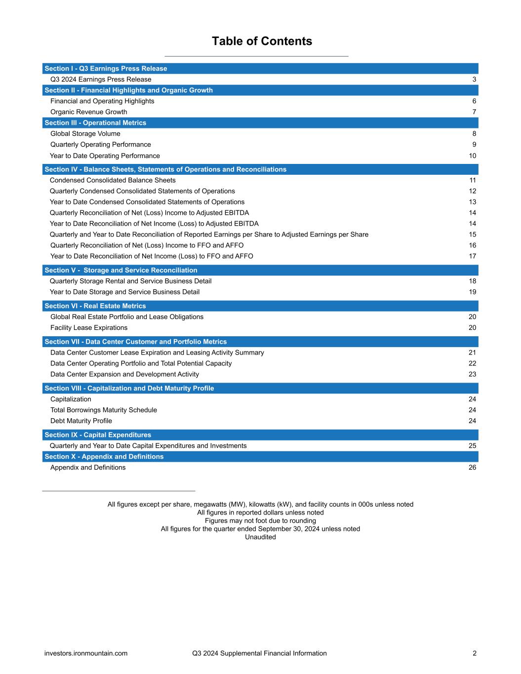 Table of Contents Section I - Q3 Earnings Press Release Q3 2024 Earnings Press Release 3 Section II - Financial Highlights and Organic Growth Financial and Operating Highlights 6 Organic Revenue Growth 7 Section III - Operational Metrics Global Storage Volume 8 Quarterly Operating Performance 9 Year to Date Operating Performance 10 Section IV - Balance Sheets, Statements of Operations and Reconciliations Condensed Consolidated Balance Sheets 11 Quarterly Condensed Consolidated Statements of Operations 12 Year to Date Condensed Consolidated Statements of Operations 13 Quarterly Reconciliation of Net (Loss) Income to Adjusted EBITDA 14 Year to Date Reconciliation of Net Income (Loss) to Adjusted EBITDA 14 Quarterly and Year to Date Reconciliation of Reported Earnings per Share to Adjusted Earnings per Share 15 Quarterly Reconciliation of Net (Loss) Income to FFO and AFFO 16 Year to Date Reconciliation of Net Income (Loss) to FFO and AFFO 17 Section V - Storage and Service Reconciliation Quarterly Storage Rental and Service Business Detail 18 Year to Date Storage and Service Business Detail 19 Section VI - Real Estate Metrics Global Real Estate Portfolio and Lease Obligations 20 Facility Lease Expirations 20 Section VII - Data Center Customer and Portfolio Metrics Data Center Customer Lease Expiration and Leasing Activity Summary 21 Data Center Operating Portfolio and Total Potential Capacity 22 Data Center Expansion and Development Activity 23 Section VIII - Capitalization and Debt Maturity Profile Capitalization 24 Total Borrowings Maturity Schedule 24 Debt Maturity Profile 24 Section IX - Capital Expenditures Quarterly and Year to Date Capital Expenditures and Investments 25 Section X - Appendix and Definitions Appendix and Definitions 26 All figures except per share, megawatts (MW), kilowatts (kW), and facility counts in 000s unless noted All figures in reported dollars unless noted Figures may not foot due to rounding All figures for the quarter ended September 30, 2024 unless noted Unaudited investors.ironmountain.com Q3 2024 Supplemental Financial Information 2