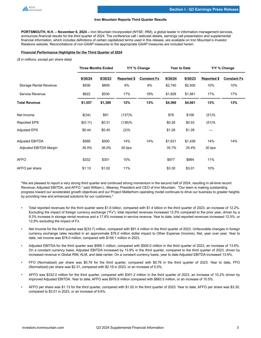 Iron Mountain Reports Third Quarter Results PORTSMOUTH, N.H. – November 6, 2024 – Iron Mountain Incorporated (NYSE: IRM), a global leader in information management services, announces financial results for the third quarter of 2024. The conference call / webcast details, earnings call presentation and supplemental financial information, which includes definitions of certain capitalized terms used in this release, are available on Iron Mountain’s Investor Relations website. Reconciliations of non-GAAP measures to the appropriate GAAP measures are included herein. Financial Performance Highlights for the Third Quarter of 2024 ($ in millions, except per share data) Three Months Ended Y/Y % Change Year to Date Y/Y % Change 9/30/24 9/30/23 Reported $ Constant Fx 9/30/24 9/30/23 Reported $ Constant Fx Storage Rental Revenue $936 $859 9% 9% $2,740 $2,500 10% 10% Service Revenue $622 $530 17% 18% $1,828 $1,561 17% 17% Total Revenue $1,557 $1,389 12% 13% $4,569 $4,061 13% 13% Net Income $(34) $91 (137)% $78 $158 (51)% Reported EPS $(0.11) $0.31 (136)% $0.26 $0.53 (51)% Adjusted EPS $0.44 $0.45 (2)% $1.28 $1.28 — Adjusted EBITDA $568 $500 14% 14% $1,631 $1,436 14% 14% Adjusted EBITDA Margin 36.5% 36.0% 50 bps 35.7% 35.4% 30 bps AFFO $332 $301 10% $977 $884 11% AFFO per share $1.13 $1.02 11% $3.30 $3.01 10% "We are pleased to report a very strong third quarter and continued strong momentum in the second half of 2024, resulting in all-time record Revenue, Adjusted EBITDA, and AFFO," said William L. Meaney, President and CEO of Iron Mountain. "Our team is making outstanding progress toward our accelerated growth objectives and our Project Matterhorn operating model continues to drive our business to greater heights by providing new and enhanced solutions for our customers." • Total reported revenues for the third quarter were $1.6 billion, compared with $1.4 billion in the third quarter of 2023, an increase of 12.2%. Excluding the impact of foreign currency exchange ("Fx"), total reported revenues increased 12.5% compared to the prior year, driven by a 9.3% increase in storage rental revenue and a 17.6% increase in service revenue. Year to date, total reported revenues increased 12.5%, or 12.8% excluding the impact of Fx. • Net Income for the third quarter was $(33.7) million, compared with $91.4 million in the third quarter of 2023. Unfavorable changes in foreign currency exchange rates resulted in an approximate $76.0 million dollar impact to Other Expense (Income), Net, year over year. Year to date, net income was $78.0 million, compared with $158.1 million in 2023. • Adjusted EBITDA for the third quarter was $568.1 million, compared with $500.0 million in the third quarter of 2023, an increase of 13.6%. On a constant currency basis, Adjusted EBITDA increased by 13.9% in the third quarter, compared to the third quarter of 2023, driven by increased revenue in Global RIM, ALM, and data center. On a constant currency basis, year to date Adjusted EBITDA increased 13.9%. • FFO (Normalized) per share was $0.79 for the third quarter, compared with $0.76 in the third quarter of 2023. Year to date, FFO (Normalized) per share was $2.31, compared with $2.19 in 2023, or an increase of 5.5%. • AFFO was $332.0 million for the third quarter, compared with $301.2 million in the third quarter of 2023, an increase of 10.2% driven by improved Adjusted EBITDA. Year to date, AFFO was $976.6 million compared with $883.5 million, or an increase of 10.5%. • AFFO per share was $1.13 for the third quarter, compared with $1.02 in the third quarter of 2023. Year to date, AFFO per share was $3.30, compared to $3.01 in 2023, or an increase of 9.6%. Section I - Q3 Earnings Press Release investors.ironmountain.com Q3 2024 Supplemental Financial Information 3
