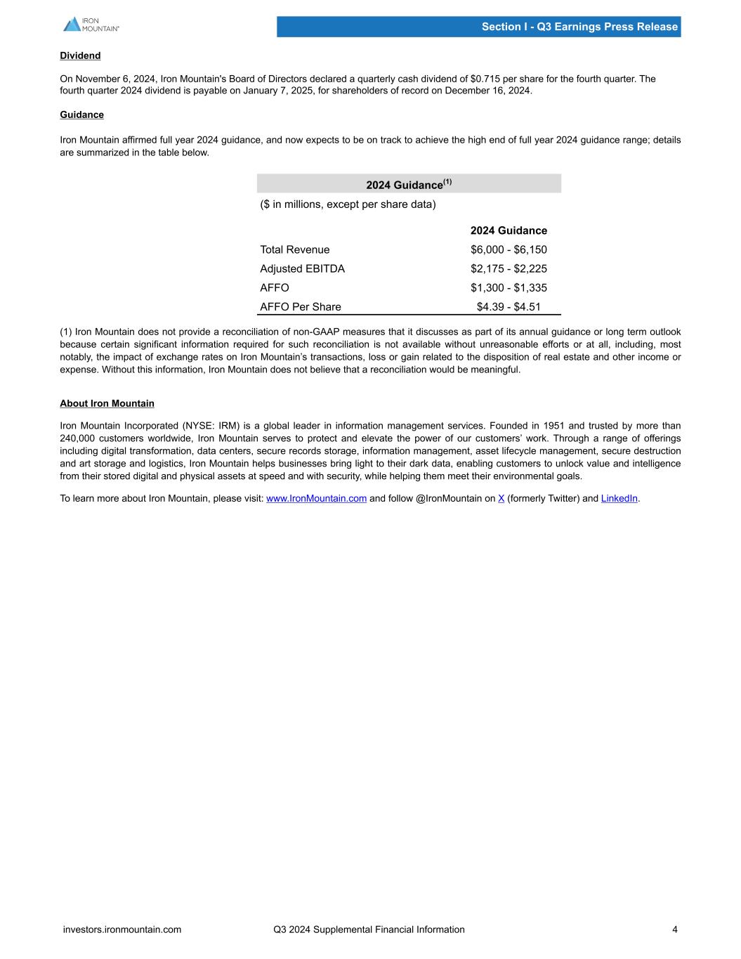 Dividend On November 6, 2024, Iron Mountain's Board of Directors declared a quarterly cash dividend of $0.715 per share for the fourth quarter. The fourth quarter 2024 dividend is payable on January 7, 2025, for shareholders of record on December 16, 2024. Guidance Iron Mountain affirmed full year 2024 guidance, and now expects to be on track to achieve the high end of full year 2024 guidance range; details are summarized in the table below. 2024 Guidance(1) ($ in millions, except per share data) 2024 Guidance Total Revenue $6,000 - $6,150 Adjusted EBITDA $2,175 - $2,225 AFFO $1,300 - $1,335 AFFO Per Share $4.39 - $4.51 (1) Iron Mountain does not provide a reconciliation of non-GAAP measures that it discusses as part of its annual guidance or long term outlook because certain significant information required for such reconciliation is not available without unreasonable efforts or at all, including, most notably, the impact of exchange rates on Iron Mountain’s transactions, loss or gain related to the disposition of real estate and other income or expense. Without this information, Iron Mountain does not believe that a reconciliation would be meaningful. About Iron Mountain Iron Mountain Incorporated (NYSE: IRM) is a global leader in information management services. Founded in 1951 and trusted by more than 240,000 customers worldwide, Iron Mountain serves to protect and elevate the power of our customers’ work. Through a range of offerings including digital transformation, data centers, secure records storage, information management, asset lifecycle management, secure destruction and art storage and logistics, Iron Mountain helps businesses bring light to their dark data, enabling customers to unlock value and intelligence from their stored digital and physical assets at speed and with security, while helping them meet their environmental goals. To learn more about Iron Mountain, please visit: www.IronMountain.com and follow @IronMountain on X (formerly Twitter) and LinkedIn. Section I - Q3 Earnings Press Release investors.ironmountain.com Q3 2024 Supplemental Financial Information 4