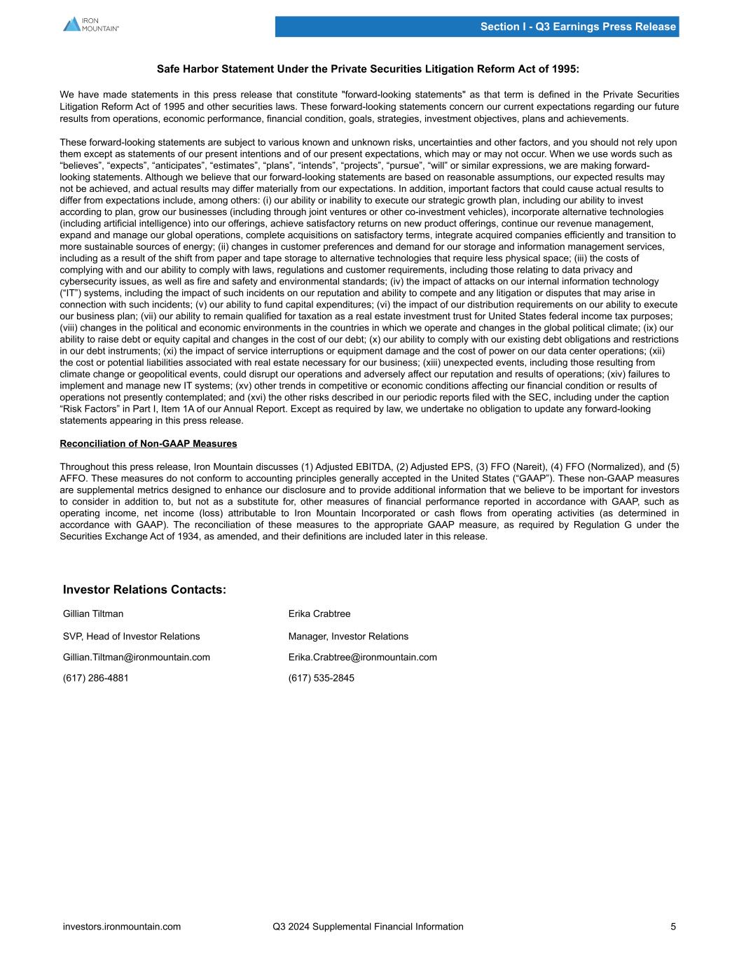 Safe Harbor Statement Under the Private Securities Litigation Reform Act of 1995: We have made statements in this press release that constitute "forward-looking statements" as that term is defined in the Private Securities Litigation Reform Act of 1995 and other securities laws. These forward-looking statements concern our current expectations regarding our future results from operations, economic performance, financial condition, goals, strategies, investment objectives, plans and achievements. These forward-looking statements are subject to various known and unknown risks, uncertainties and other factors, and you should not rely upon them except as statements of our present intentions and of our present expectations, which may or may not occur. When we use words such as “believes”, “expects”, “anticipates”, “estimates”, “plans”, “intends”, “projects”, “pursue”, “will” or similar expressions, we are making forward- looking statements. Although we believe that our forward-looking statements are based on reasonable assumptions, our expected results may not be achieved, and actual results may differ materially from our expectations. In addition, important factors that could cause actual results to differ from expectations include, among others: (i) our ability or inability to execute our strategic growth plan, including our ability to invest according to plan, grow our businesses (including through joint ventures or other co-investment vehicles), incorporate alternative technologies (including artificial intelligence) into our offerings, achieve satisfactory returns on new product offerings, continue our revenue management, expand and manage our global operations, complete acquisitions on satisfactory terms, integrate acquired companies efficiently and transition to more sustainable sources of energy; (ii) changes in customer preferences and demand for our storage and information management services, including as a result of the shift from paper and tape storage to alternative technologies that require less physical space; (iii) the costs of complying with and our ability to comply with laws, regulations and customer requirements, including those relating to data privacy and cybersecurity issues, as well as fire and safety and environmental standards; (iv) the impact of attacks on our internal information technology (“IT”) systems, including the impact of such incidents on our reputation and ability to compete and any litigation or disputes that may arise in connection with such incidents; (v) our ability to fund capital expenditures; (vi) the impact of our distribution requirements on our ability to execute our business plan; (vii) our ability to remain qualified for taxation as a real estate investment trust for United States federal income tax purposes; (viii) changes in the political and economic environments in the countries in which we operate and changes in the global political climate; (ix) our ability to raise debt or equity capital and changes in the cost of our debt; (x) our ability to comply with our existing debt obligations and restrictions in our debt instruments; (xi) the impact of service interruptions or equipment damage and the cost of power on our data center operations; (xii) the cost or potential liabilities associated with real estate necessary for our business; (xiii) unexpected events, including those resulting from climate change or geopolitical events, could disrupt our operations and adversely affect our reputation and results of operations; (xiv) failures to implement and manage new IT systems; (xv) other trends in competitive or economic conditions affecting our financial condition or results of operations not presently contemplated; and (xvi) the other risks described in our periodic reports filed with the SEC, including under the caption “Risk Factors” in Part I, Item 1A of our Annual Report. Except as required by law, we undertake no obligation to update any forward-looking statements appearing in this press release. Reconciliation of Non-GAAP Measures Throughout this press release, Iron Mountain discusses (1) Adjusted EBITDA, (2) Adjusted EPS, (3) FFO (Nareit), (4) FFO (Normalized), and (5) AFFO. These measures do not conform to accounting principles generally accepted in the United States (“GAAP”). These non-GAAP measures are supplemental metrics designed to enhance our disclosure and to provide additional information that we believe to be important for investors to consider in addition to, but not as a substitute for, other measures of financial performance reported in accordance with GAAP, such as operating income, net income (loss) attributable to Iron Mountain Incorporated or cash flows from operating activities (as determined in accordance with GAAP). The reconciliation of these measures to the appropriate GAAP measure, as required by Regulation G under the Securities Exchange Act of 1934, as amended, and their definitions are included later in this release. Investor Relations Contacts: Gillian Tiltman Erika Crabtree SVP, Head of Investor Relations Manager, Investor Relations Gillian.Tiltman@ironmountain.com Erika.Crabtree@ironmountain.com (617) 286-4881 (617) 535-2845 Section I - Q3 Earnings Press Release investors.ironmountain.com Q3 2024 Supplemental Financial Information 5