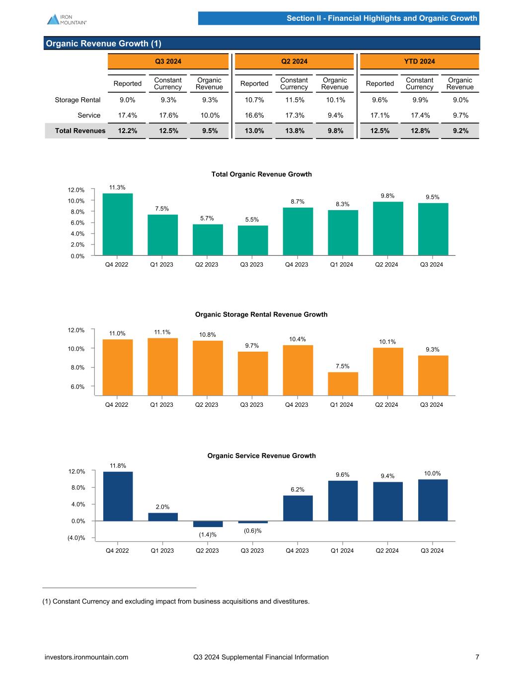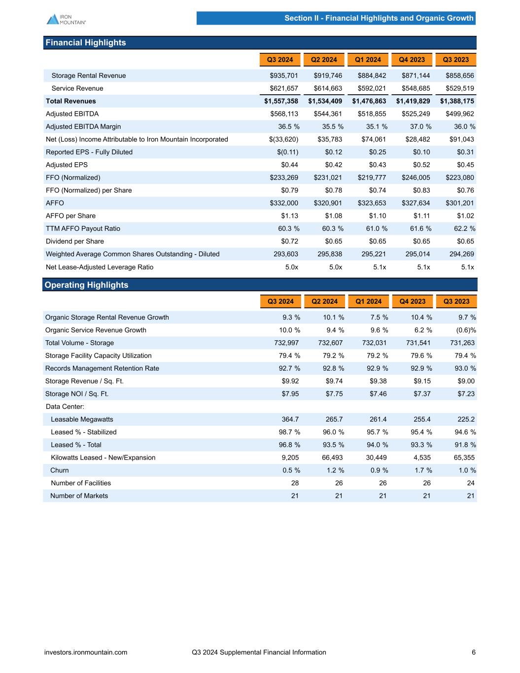 Financial Highlights Q3 2024 Q2 2024 Q1 2024 Q4 2023 Q3 2023 Storage Rental Revenue $935,701 $919,746 $884,842 $871,144 $858,656 Service Revenue $621,657 $614,663 $592,021 $548,685 $529,519 Total Revenues $1,557,358 $1,534,409 $1,476,863 $1,419,829 $1,388,175 Adjusted EBITDA $568,113 $544,361 $518,855 $525,249 $499,962 Adjusted EBITDA Margin 36.5 % 35.5 % 35.1 % 37.0 % 36.0 % Net (Loss) Income Attributable to Iron Mountain Incorporated $(33,620) $35,783 $74,061 $28,482 $91,043 Reported EPS - Fully Diluted $(0.11) $0.12 $0.25 $0.10 $0.31 Adjusted EPS $0.44 $0.42 $0.43 $0.52 $0.45 FFO (Normalized) $233,269 $231,021 $219,777 $246,005 $223,080 FFO (Normalized) per Share $0.79 $0.78 $0.74 $0.83 $0.76 AFFO $332,000 $320,901 $323,653 $327,634 $301,201 AFFO per Share $1.13 $1.08 $1.10 $1.11 $1.02 TTM AFFO Payout Ratio 60.3 % 60.3 % 61.0 % 61.6 % 62.2 % Dividend per Share $0.72 $0.65 $0.65 $0.65 $0.65 Weighted Average Common Shares Outstanding - Diluted 293,603 295,838 295,221 295,014 294,269 Net Lease-Adjusted Leverage Ratio 5.0x 5.0x 5.1x 5.1x 5.1x Operating Highlights Q3 2024 Q2 2024 Q1 2024 Q4 2023 Q3 2023 Organic Storage Rental Revenue Growth 9.3 % 10.1 % 7.5 % 10.4 % 9.7 % Organic Service Revenue Growth 10.0 % 9.4 % 9.6 % 6.2 % (0.6) % Total Volume - Storage 732,997 732,607 732,031 731,541 731,263 Storage Facility Capacity Utilization 79.4 % 79.2 % 79.2 % 79.6 % 79.4 % Records Management Retention Rate 92.7 % 92.8 % 92.9 % 92.9 % 93.0 % Storage Revenue / Sq. Ft. $9.92 $9.74 $9.38 $9.15 $9.00 Storage NOI / Sq. Ft. $7.95 $7.75 $7.46 $7.37 $7.23 Data Center: Leasable Megawatts 364.7 265.7 261.4 255.4 225.2 Leased % - Stabilized 98.7 % 96.0 % 95.7 % 95.4 % 94.6 % Leased % - Total 96.8 % 93.5 % 94.0 % 93.3 % 91.8 % Kilowatts Leased - New/Expansion 9,205 66,493 30,449 4,535 65,355 Churn 0.5 % 1.2 % 0.9 % 1.7 % 1.0 % Number of Facilities 28 26 26 26 24 Number of Markets 21 21 21 21 21 Section II - Financial Highlights and Organic Growth investors.ironmountain.com Q3 2024 Supplemental Financial Information 6