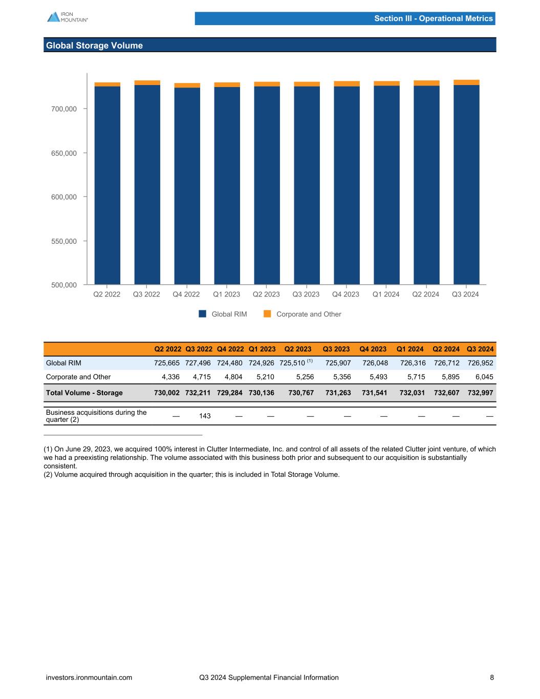 Global Storage Volume Global RIM Corporate and Other Q2 2022 Q3 2022 Q4 2022 Q1 2023 Q2 2023 Q3 2023 Q4 2023 Q1 2024 Q2 2024 Q3 2024 500,000 550,000 600,000 650,000 700,000 Q2 2022 Q3 2022 Q4 2022 Q1 2023 Q2 2023 Q3 2023 Q4 2023 Q1 2024 Q2 2024 Q3 2024 Global RIM 725,665 727,496 724,480 724,926 725,510 (1) 725,907 726,048 726,316 726,712 726,952 Corporate and Other 4,336 4,715 4,804 5,210 5,256 5,356 5,493 5,715 5,895 6,045 Total Volume - Storage 730,002 732,211 729,284 730,136 730,767 731,263 731,541 732,031 732,607 732,997 Business acquisitions during the quarter (2) — 143 — — — — — — — — (1) On June 29, 2023, we acquired 100% interest in Clutter Intermediate, Inc. and control of all assets of the related Clutter joint venture, of which we had a preexisting relationship. The volume associated with this business both prior and subsequent to our acquisition is substantially consistent. (2) Volume acquired through acquisition in the quarter; this is included in Total Storage Volume. Section III - Operational Metrics investors.ironmountain.com Q3 2024 Supplemental Financial Information 8