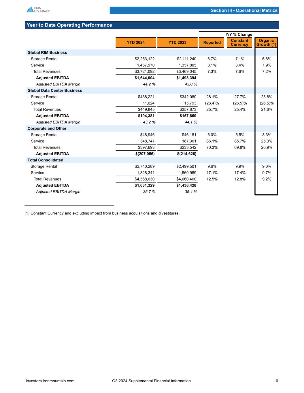 Quarterly Operating Performance Y/Y % Change Q3 2024 Q2 2024 Q3 2023 Reported Constant Currency Organic Growth (1) Global RIM Business Storage Rental $767,780 $756,358 $719,560 6.7% 7.2% 7.2% Service 492,578 494,219 463,092 6.4% 6.6% 6.6% Total Revenues $1,260,358 $1,250,577 $1,182,652 6.6% 7.0% 7.0% Adjusted EBITDA $568,994 $548,742 $516,548 Adjusted EBITDA Margin 45.1 % 43.9 % 43.7 % Global Data Center Business Storage Rental $150,796 $147,397 $123,655 21.9% 21.4% 21.4% Service 2,410 5,305 3,880 (37.9)% (37.6)% (37.6)% Total Revenues $153,206 $152,702 $127,535 20.1% 19.6% 19.6% Adjusted EBITDA $66,796 $66,017 $53,216 Adjusted EBITDA Margin 43.6 % 43.2 % 41.7 % Corporate and Other Storage Rental $17,125 $15,991 $15,441 10.9% 10.5% 8.8% Service 126,669 115,139 62,547 102.5% 102.0% 37.9% Total Revenues $143,794 $131,130 $77,988 84.4% 83.9% 32.1% Adjusted EBITDA $(67,677) $(70,398) $(69,802) Total Consolidated Storage Rental $935,701 $919,746 $858,656 9.0% 9.3% 9.3% Service 621,657 614,663 529,519 17.4% 17.6% 10.0% Total Revenues $1,557,358 $1,534,409 $1,388,175 12.2% 12.5% 9.5% Adjusted EBITDA $568,113 $544,361 $499,962 Adjusted EBITDA Margin 36.5 % 35.5 % 36.0 % (1) Constant Currency and excluding impact from business acquisitions and divestitures. Section III - Operational Metrics investors.ironmountain.com Q3 2024 Supplemental Financial Information 9