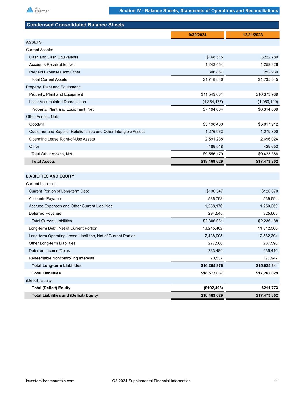 Condensed Consolidated Balance Sheets 9/30/2024 12/31/2023 ASSETS Current Assets: Cash and Cash Equivalents $168,515 $222,789 Accounts Receivable, Net 1,243,464 1,259,826 Prepaid Expenses and Other 306,867 252,930 Total Current Assets $1,718,846 $1,735,545 Property, Plant and Equipment: Property, Plant and Equipment $11,549,081 $10,373,989 Less: Accumulated Depreciation (4,354,477) (4,059,120) Property, Plant and Equipment, Net $7,194,604 $6,314,869 Other Assets, Net: Goodwill $5,198,460 $5,017,912 Customer and Supplier Relationships and Other Intangible Assets 1,276,963 1,279,800 Operating Lease Right-of-Use Assets 2,591,238 2,696,024 Other 489,518 429,652 Total Other Assets, Net $9,556,179 $9,423,388 Total Assets $18,469,629 $17,473,802 LIABILITIES AND EQUITY Current Liabilities: Current Portion of Long-term Debt $136,547 $120,670 Accounts Payable 586,793 539,594 Accrued Expenses and Other Current Liabilities 1,288,176 1,250,259 Deferred Revenue 294,545 325,665 Total Current Liabilities $2,306,061 $2,236,188 Long-term Debt, Net of Current Portion 13,245,462 11,812,500 Long-term Operating Lease Liabilities, Net of Current Portion 2,438,905 2,562,394 Other Long-term Liabilities 277,588 237,590 Deferred Income Taxes 233,484 235,410 Redeemable Noncontrolling Interests 70,537 177,947 Total Long-term Liabilities $16,265,976 $15,025,841 Total Liabilities $18,572,037 $17,262,029 (Deficit) Equity Total (Deficit) Equity ($102,408) $211,773 Total Liabilities and (Deficit) Equity $18,469,629 $17,473,802 Section IV - Balance Sheets, Statements of Operations and Reconciliations investors.ironmountain.com Q3 2024 Supplemental Financial Information 11