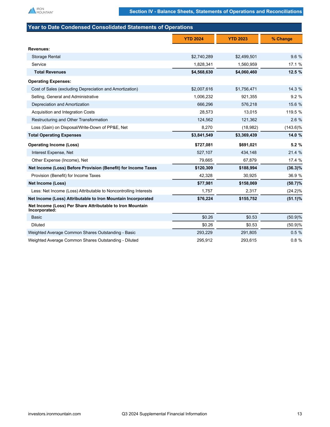 Year to Date Condensed Consolidated Statements of Operations YTD 2024 YTD 2023 % Change Revenues: Storage Rental $2,740,289 $2,499,501 9.6 % Service 1,828,341 1,560,959 17.1 % Total Revenues $4,568,630 $4,060,460 12.5 % Operating Expenses: Cost of Sales (excluding Depreciation and Amortization) $2,007,616 $1,756,471 14.3 % Selling, General and Administrative 1,006,232 921,355 9.2 % Depreciation and Amortization 666,296 576,218 15.6 % Acquisition and Integration Costs 28,573 13,015 119.5 % Restructuring and Other Transformation 124,562 121,362 2.6 % Loss (Gain) on Disposal/Write-Down of PP&E, Net 8,270 (18,982) (143.6) % Total Operating Expenses $3,841,549 $3,369,439 14.0 % Operating Income (Loss) $727,081 $691,021 5.2 % Interest Expense, Net 527,107 434,148 21.4 % Other Expense (Income), Net 79,665 67,879 17.4 % Net Income (Loss) Before Provision (Benefit) for Income Taxes $120,309 $188,994 (36.3) % Provision (Benefit) for Income Taxes 42,328 30,925 36.9 % Net Income (Loss) $77,981 $158,069 (50.7) % Less: Net Income (Loss) Attributable to Noncontrolling Interests 1,757 2,317 (24.2) % Net Income (Loss) Attributable to Iron Mountain Incorporated $76,224 $155,752 (51.1) % Net Income (Loss) Per Share Attributable to Iron Mountain Incorporated: Basic $0.26 $0.53 (50.9) % Diluted $0.26 $0.53 (50.9) % Weighted Average Common Shares Outstanding - Basic 293,229 291,805 0.5 % Weighted Average Common Shares Outstanding - Diluted 295,912 293,615 0.8 % Section IV - Balance Sheets, Statements of Operations and Reconciliations investors.ironmountain.com Q3 2024 Supplemental Financial Information 13