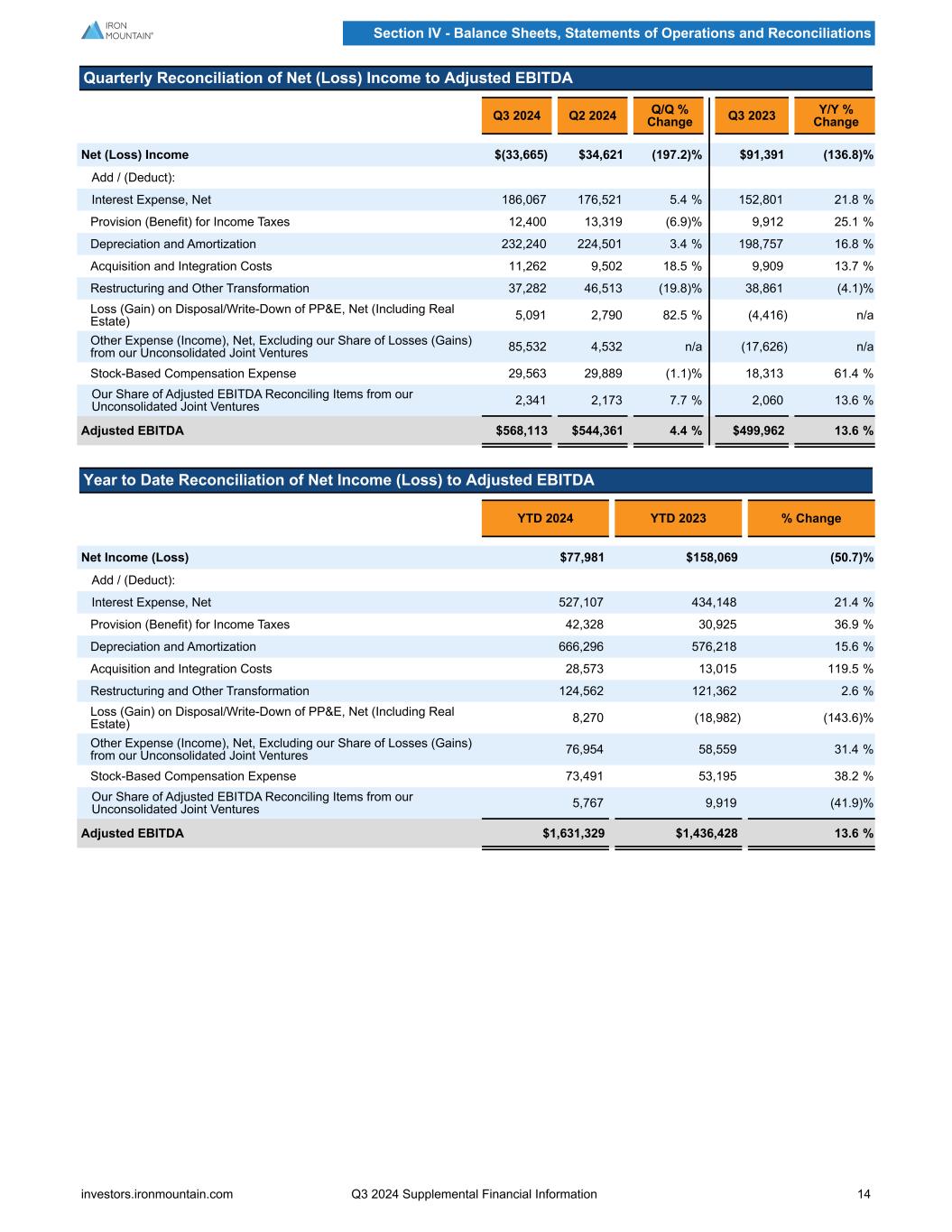 Quarterly Reconciliation of Net (Loss) Income to Adjusted EBITDA Q3 2024 Q2 2024 Q/Q % Change Q3 2023 Y/Y % Change Net (Loss) Income $(33,665) $34,621 (197.2) % $91,391 (136.8) % Add / (Deduct): Interest Expense, Net 186,067 176,521 5.4 % 152,801 21.8 % Provision (Benefit) for Income Taxes 12,400 13,319 (6.9) % 9,912 25.1 % Depreciation and Amortization 232,240 224,501 3.4 % 198,757 16.8 % Acquisition and Integration Costs 11,262 9,502 18.5 % 9,909 13.7 % Restructuring and Other Transformation 37,282 46,513 (19.8) % 38,861 (4.1) % Loss (Gain) on Disposal/Write-Down of PP&E, Net (Including Real Estate) 5,091 2,790 82.5 % (4,416) n/a Other Expense (Income), Net, Excluding our Share of Losses (Gains) from our Unconsolidated Joint Ventures 85,532 4,532 n/a (17,626) n/a Stock-Based Compensation Expense 29,563 29,889 (1.1) % 18,313 61.4 % Our Share of Adjusted EBITDA Reconciling Items from our Unconsolidated Joint Ventures 2,341 2,173 7.7 % 2,060 13.6 % Adjusted EBITDA $568,113 $544,361 4.4 % $499,962 13.6 % Year to Date Reconciliation of Net Income (Loss) to Adjusted EBITDA YTD 2024 YTD 2023 % Change Net Income (Loss) $77,981 $158,069 (50.7) % Add / (Deduct): Interest Expense, Net 527,107 434,148 21.4 % Provision (Benefit) for Income Taxes 42,328 30,925 36.9 % Depreciation and Amortization 666,296 576,218 15.6 % Acquisition and Integration Costs 28,573 13,015 119.5 % Restructuring and Other Transformation 124,562 121,362 2.6 % Loss (Gain) on Disposal/Write-Down of PP&E, Net (Including Real Estate) 8,270 (18,982) (143.6) % Other Expense (Income), Net, Excluding our Share of Losses (Gains) from our Unconsolidated Joint Ventures 76,954 58,559 31.4 % Stock-Based Compensation Expense 73,491 53,195 38.2 % Our Share of Adjusted EBITDA Reconciling Items from our Unconsolidated Joint Ventures 5,767 9,919 (41.9) % Adjusted EBITDA $1,631,329 $1,436,428 13.6 % Section IV - Balance Sheets, Statements of Operations and Reconciliations investors.ironmountain.com Q3 2024 Supplemental Financial Information 14