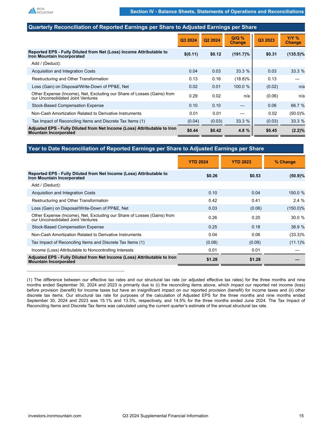 Quarterly Reconciliation of Reported Earnings per Share to Adjusted Earnings per Share Q3 2024 Q2 2024 Q/Q % Change Q3 2023 Y/Y % Change Reported EPS - Fully Diluted from Net (Loss) Income Attributable to Iron Mountain Incorporated $(0.11) $0.12 (191.7) % $0.31 (135.5) % Add / (Deduct): Acquisition and Integration Costs 0.04 0.03 33.3 % 0.03 33.3 % Restructuring and Other Transformation 0.13 0.16 (18.8) % 0.13 — Loss (Gain) on Disposal/Write-Down of PP&E, Net 0.02 0.01 100.0 % (0.02) n/a Other Expense (Income), Net, Excluding our Share of Losses (Gains) from our Unconsolidated Joint Ventures 0.29 0.02 n/a (0.06) n/a Stock-Based Compensation Expense 0.10 0.10 — 0.06 66.7 % Non-Cash Amortization Related to Derivative Instruments 0.01 0.01 — 0.02 (50.0) % Tax Impact of Reconciling Items and Discrete Tax Items (1) (0.04) (0.03) 33.3 % (0.03) 33.3 % Adjusted EPS - Fully Diluted from Net Income (Loss) Attributable to Iron Mountain Incorporated $0.44 $0.42 4.8 % $0.45 (2.2) % Year to Date Reconciliation of Reported Earnings per Share to Adjusted Earnings per Share YTD 2024 YTD 2023 % Change Reported EPS - Fully Diluted from Net Income (Loss) Attributable to Iron Mountain Incorporated $0.26 $0.53 (50.9) % Add / (Deduct): Acquisition and Integration Costs 0.10 0.04 150.0 % Restructuring and Other Transformation 0.42 0.41 2.4 % Loss (Gain) on Disposal/Write-Down of PP&E, Net 0.03 (0.06) (150.0) % Other Expense (Income), Net, Excluding our Share of Losses (Gains) from our Unconsolidated Joint Ventures 0.26 0.20 30.0 % Stock-Based Compensation Expense 0.25 0.18 38.9 % Non-Cash Amortization Related to Derivative Instruments 0.04 0.06 (33.3) % Tax Impact of Reconciling Items and Discrete Tax Items (1) (0.08) (0.09) (11.1) % Income (Loss) Attributable to Noncontrolling Interests 0.01 0.01 — Adjusted EPS - Fully Diluted from Net Income (Loss) Attributable to Iron Mountain Incorporated $1.28 $1.28 — (1) The difference between our effective tax rates and our structural tax rate (or adjusted effective tax rates) for the three months and nine months ended September 30, 2024 and 2023 is primarily due to (i) the reconciling items above, which impact our reported net income (loss) before provision (benefit) for income taxes but have an insignificant impact on our reported provision (benefit) for income taxes and (ii) other discrete tax items. Our structural tax rate for purposes of the calculation of Adjusted EPS for the three months and nine months ended September 30, 2024 and 2023 was 15.1% and 13.3%, respectively, and 14.5% for the three months ended June 2024. The Tax Impact of Reconciling Items and Discrete Tax Items was calculated using the current quarter’s estimate of the annual structural tax rate. Section IV - Balance Sheets, Statements of Operations and Reconciliations investors.ironmountain.com Q3 2024 Supplemental Financial Information 15