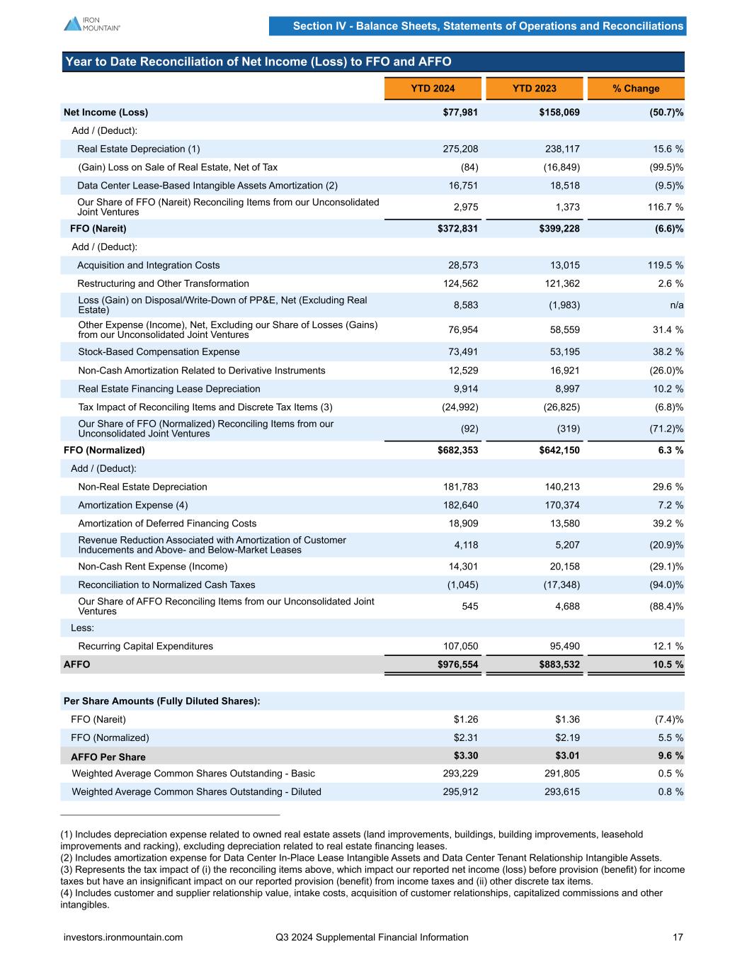 Year to Date Reconciliation of Net Income (Loss) to FFO and AFFO YTD 2024 YTD 2023 % Change Net Income (Loss) $77,981 $158,069 (50.7) % Add / (Deduct): Real Estate Depreciation (1) 275,208 238,117 15.6 % (Gain) Loss on Sale of Real Estate, Net of Tax (84) (16,849) (99.5) % Data Center Lease-Based Intangible Assets Amortization (2) 16,751 18,518 (9.5) % Our Share of FFO (Nareit) Reconciling Items from our Unconsolidated Joint Ventures 2,975 1,373 116.7 % FFO (Nareit) $372,831 $399,228 (6.6) % Add / (Deduct): Acquisition and Integration Costs 28,573 13,015 119.5 % Restructuring and Other Transformation 124,562 121,362 2.6 % Loss (Gain) on Disposal/Write-Down of PP&E, Net (Excluding Real Estate) 8,583 (1,983) n/a Other Expense (Income), Net, Excluding our Share of Losses (Gains) from our Unconsolidated Joint Ventures 76,954 58,559 31.4 % Stock-Based Compensation Expense 73,491 53,195 38.2 % Non-Cash Amortization Related to Derivative Instruments 12,529 16,921 (26.0) % Real Estate Financing Lease Depreciation 9,914 8,997 10.2 % Tax Impact of Reconciling Items and Discrete Tax Items (3) (24,992) (26,825) (6.8) % Our Share of FFO (Normalized) Reconciling Items from our Unconsolidated Joint Ventures (92) (319) (71.2) % FFO (Normalized) $682,353 $642,150 6.3 % Add / (Deduct): Non-Real Estate Depreciation 181,783 140,213 29.6 % Amortization Expense (4) 182,640 170,374 7.2 % Amortization of Deferred Financing Costs 18,909 13,580 39.2 % Revenue Reduction Associated with Amortization of Customer Inducements and Above- and Below-Market Leases 4,118 5,207 (20.9) % Non-Cash Rent Expense (Income) 14,301 20,158 (29.1) % Reconciliation to Normalized Cash Taxes (1,045) (17,348) (94.0) % Our Share of AFFO Reconciling Items from our Unconsolidated Joint Ventures 545 4,688 (88.4) % Less: Recurring Capital Expenditures 107,050 95,490 12.1 % AFFO $976,554 $883,532 10.5 % Per Share Amounts (Fully Diluted Shares): FFO (Nareit) $1.26 $1.36 (7.4) % FFO (Normalized) $2.31 $2.19 5.5 % AFFO Per Share $3.30 $3.01 9.6 % Weighted Average Common Shares Outstanding - Basic 293,229 291,805 0.5 % Weighted Average Common Shares Outstanding - Diluted 295,912 293,615 0.8 % (1) Includes depreciation expense related to owned real estate assets (land improvements, buildings, building improvements, leasehold improvements and racking), excluding depreciation related to real estate financing leases. (2) Includes amortization expense for Data Center In-Place Lease Intangible Assets and Data Center Tenant Relationship Intangible Assets. (3) Represents the tax impact of (i) the reconciling items above, which impact our reported net income (loss) before provision (benefit) for income taxes but have an insignificant impact on our reported provision (benefit) from income taxes and (ii) other discrete tax items. (4) Includes customer and supplier relationship value, intake costs, acquisition of customer relationships, capitalized commissions and other intangibles. Section IV - Balance Sheets, Statements of Operations and Reconciliations investors.ironmountain.com Q3 2024 Supplemental Financial Information 17