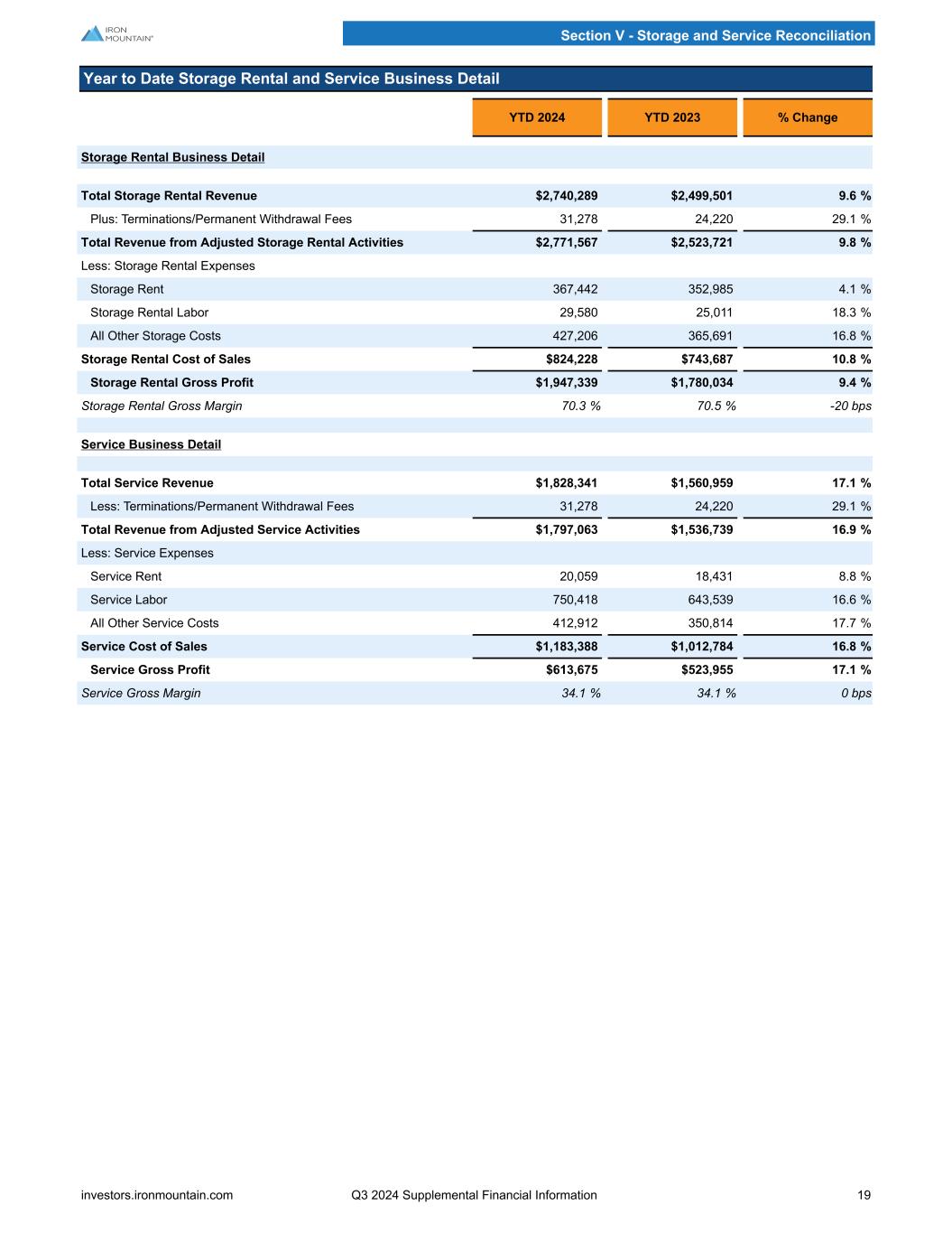 Quarterly Storage Rental and Service Business Detail Q3 2024 Q2 2024 Q/Q % Change Q3 2023 Y/Y % Change Storage Rental Business Detail Total Storage Rental Revenue $935,701 $919,746 1.7 % $858,656 9.0 % Plus: Terminations/Permanent Withdrawal Fees 11,052 10,562 4.6 % 8,725 26.7 % Total Revenue from Adjusted Storage Rental Activities $946,753 $930,308 1.8 % $867,381 9.2 % Less: Storage Rental Expenses Storage Rent 122,396 121,657 0.6 % 119,371 2.5 % Storage Rental Labor 9,015 10,305 (12.5) % 8,777 2.7 % All Other Storage Costs 142,993 147,385 (3.0) % 127,187 12.4 % Storage Rental Cost of Sales $274,404 $279,346 (1.8) % $255,335 7.5 % Storage Rental Gross Profit $672,349 $650,962 3.3 % $612,046 9.9 % Storage Rental Gross Margin 71.0 % 70.0 % 100 bps 70.6 % 40 bps Service Business Detail Total Service Revenue $621,657 $614,663 1.1 % $529,519 17.4 % Less: Terminations/Permanent Withdrawal Fees 11,052 10,562 4.6 % 8,725 26.7 % Total Revenue from Adjusted Service Activities $610,605 $604,100 1.1 % $520,794 17.2 % Less: Service Expenses Service Rent 6,979 6,863 1.7 % 7,233 (3.5) % Service Labor 255,484 253,863 0.6 % 215,846 18.4 % All Other Service Costs 141,523 135,898 4.1 % 113,787 24.4 % Service Cost of Sales $403,986 $396,625 1.9 % $336,866 19.9 % Service Gross Profit $206,619 $207,476 (0.4) % $183,928 12.3 % Service Gross Margin 33.8 % 34.3 % -50 bps 35.3 % -150 bps Section V - Storage and Service Reconciliation investors.ironmountain.com Q3 2024 Supplemental Financial Information 18