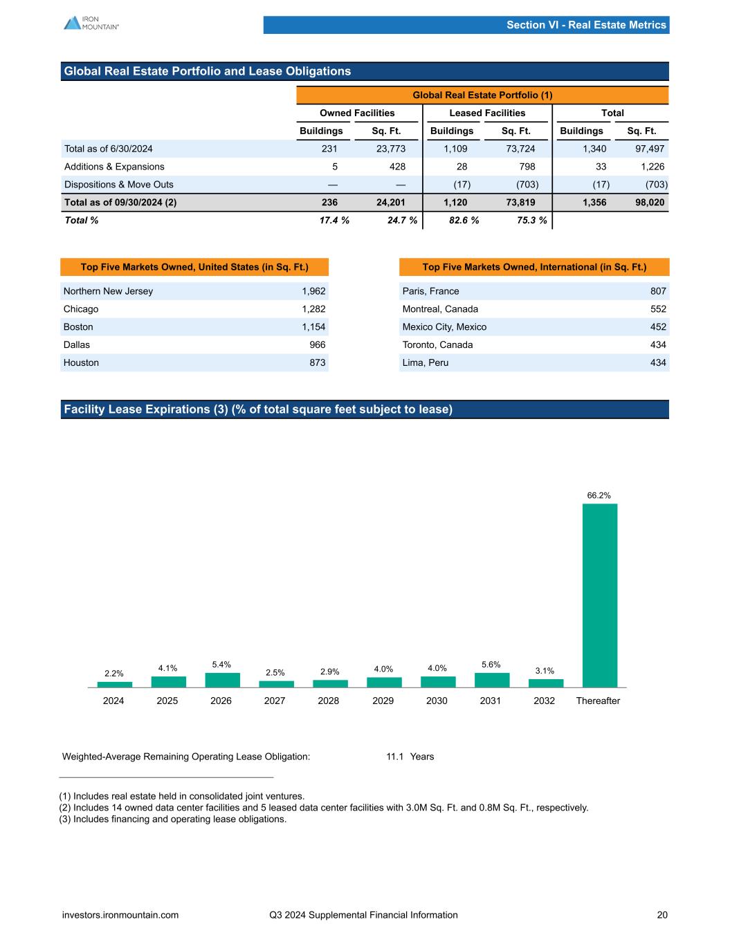 Global Real Estate Portfolio and Lease Obligations Global Real Estate Portfolio (1) Owned Facilities Leased Facilities Total Buildings Sq. Ft. Buildings Sq. Ft. Buildings Sq. Ft. Total as of 6/30/2024 231 23,773 1,109 73,724 1,340 97,497 Additions & Expansions 5 428 28 798 33 1,226 Dispositions & Move Outs — — (17) (703) (17) (703) Total as of 09/30/2024 (2) 236 24,201 1,120 73,819 1,356 98,020 Total % 17.4 % 24.7 % 82.6 % 75.3 % Top Five Markets Owned, United States (in Sq. Ft.) Top Five Markets Owned, International (in Sq. Ft.) Northern New Jersey 1,962 Paris, France 807 Chicago 1,282 Montreal, Canada 552 Boston 1,154 Mexico City, Mexico 452 Dallas 966 Toronto, Canada 434 Houston 873 Lima, Peru 434 Facility Lease Expirations (3) (% of total square feet subject to lease) 2.2% 4.1% 5.4% 2.5% 2.9% 4.0% 4.0% 5.6% 3.1% 66.2% 2024 2025 2026 2027 2028 2029 2030 2031 2032 Thereafter Weighted-Average Remaining Operating Lease Obligation: 11.1 Years (1) Includes real estate held in consolidated joint ventures. (2) Includes 14 owned data center facilities and 5 leased data center facilities with 3.0M Sq. Ft. and 0.8M Sq. Ft., respectively. (3) Includes financing and operating lease obligations. Section VI - Real Estate Metrics investors.ironmountain.com Q3 2024 Supplemental Financial Information 20