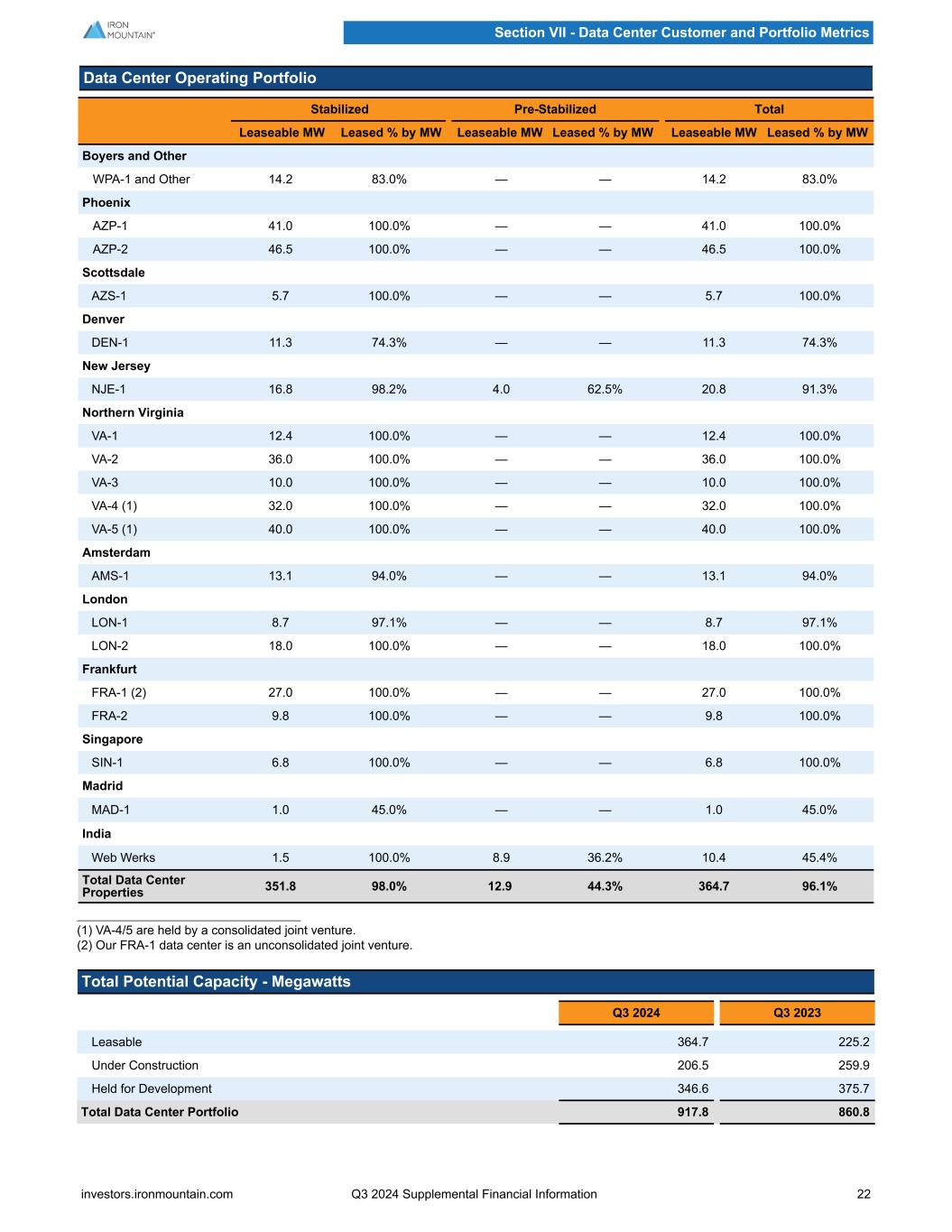 Data Center Operating Portfolio Stabilized Pre-Stabilized Total Leaseable MW Leased % by MW Leaseable MW Leased % by MW Leaseable MW Leased % by MW Boyers and Other WPA-1 and Other 14.2 83.0% — — 14.2 83.0% Phoenix AZP-1 41.0 100.0% — — 41.0 100.0% AZP-2 46.5 100.0% — — 46.5 100.0% Scottsdale AZS-1 5.7 100.0% — — 5.7 100.0% Denver DEN-1 11.3 74.3% — — 11.3 74.3% New Jersey NJE-1 16.8 98.2% 4.0 62.5% 20.8 91.3% Northern Virginia VA-1 12.4 100.0% — — 12.4 100.0% VA-2 36.0 100.0% — — 36.0 100.0% VA-3 10.0 100.0% — — 10.0 100.0% VA-4 (1) 32.0 100.0% — — 32.0 100.0% VA-5 (1) 40.0 100.0% — — 40.0 100.0% Amsterdam AMS-1 13.1 94.0% — — 13.1 94.0% London LON-1 8.7 97.1% — — 8.7 97.1% LON-2 18.0 100.0% — — 18.0 100.0% Frankfurt FRA-1 (2) 27.0 100.0% — — 27.0 100.0% FRA-2 9.8 100.0% — — 9.8 100.0% Singapore SIN-1 6.8 100.0% — — 6.8 100.0% Madrid MAD-1 1.0 45.0% — — 1.0 45.0% India Web Werks 1.5 100.0% 8.9 36.2% 10.4 45.4% Total Data Center Properties 351.8 98.0% 12.9 44.3% 364.7 96.1% (1) VA-4/5 are held by a consolidated joint venture. (2) Our FRA-1 data center is an unconsolidated joint venture. Total Potential Capacity - Megawatts Q3 2024 Q3 2023 Leasable 364.7 225.2 Under Construction 206.5 259.9 Held for Development 346.6 375.7 Total Data Center Portfolio 917.8 860.8 Section VII - Data Center Customer and Portfolio Metrics investors.ironmountain.com Q3 2024 Supplemental Financial Information 22