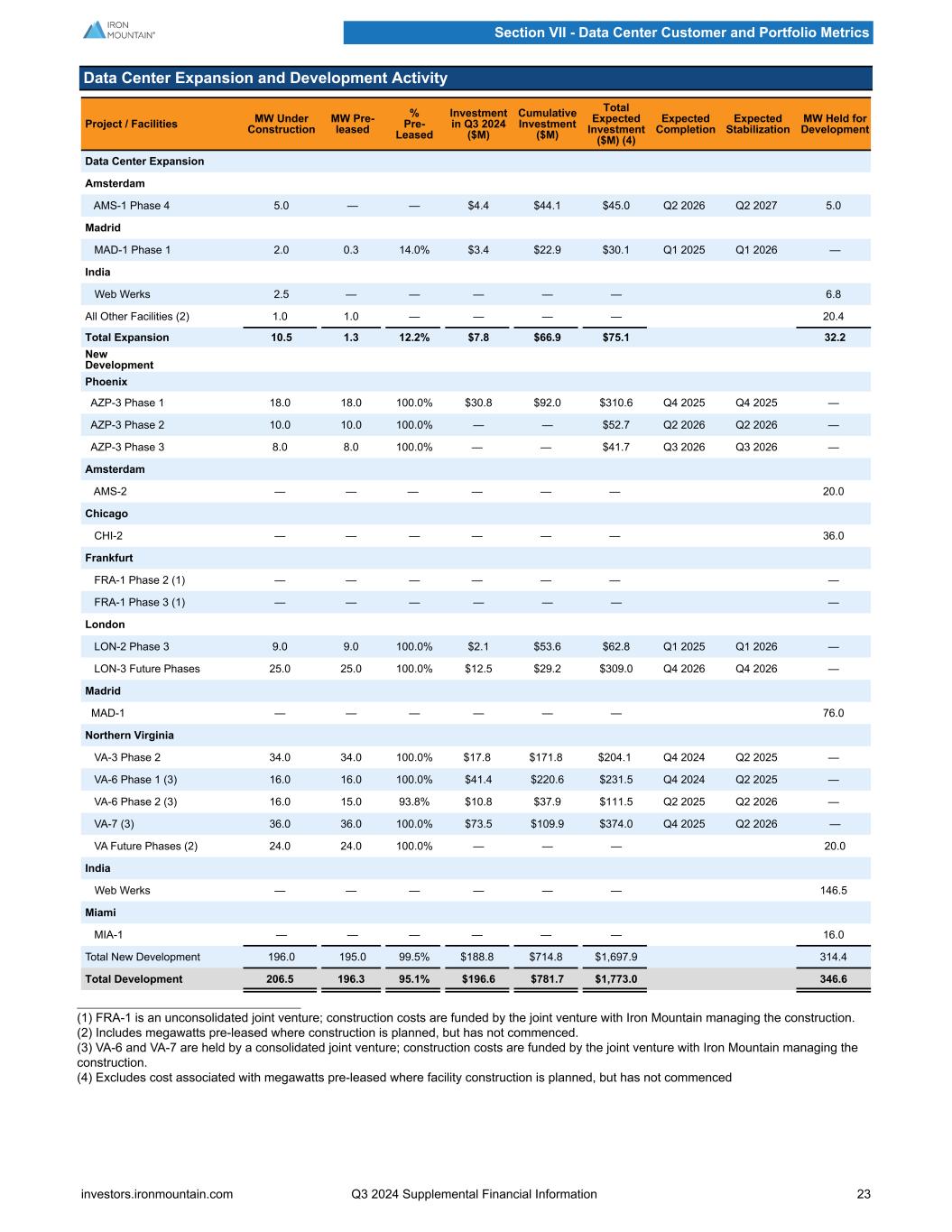Data Center Expansion and Development Activity Project / Facilities MW Under Construction MW Pre- leased % Pre- Leased Investment in Q3 2024 ($M) Cumulative Investment ($M) Total Expected Investment ($M) (4) Expected Completion Expected Stabilization MW Held for Development Data Center Expansion Amsterdam AMS-1 Phase 4 5.0 — — $4.4 $44.1 $45.0 Q2 2026 Q2 2027 5.0 Madrid MAD-1 Phase 1 2.0 0.3 14.0% $3.4 $22.9 $30.1 Q1 2025 Q1 2026 — India Web Werks 2.5 — — — — — 6.8 All Other Facilities (2) 1.0 1.0 — — — — 20.4 Total Expansion 10.5 1.3 12.2% $7.8 $66.9 $75.1 32.2 New Development Phoenix AZP-3 Phase 1 18.0 18.0 100.0% $30.8 $92.0 $310.6 Q4 2025 Q4 2025 — AZP-3 Phase 2 10.0 10.0 100.0% — — $52.7 Q2 2026 Q2 2026 — AZP-3 Phase 3 8.0 8.0 100.0% — — $41.7 Q3 2026 Q3 2026 — Amsterdam AMS-2 — — — — — — 20.0 Chicago CHI-2 — — — — — — 36.0 Frankfurt FRA-1 Phase 2 (1) — — — — — — — FRA-1 Phase 3 (1) — — — — — — — London LON-2 Phase 3 9.0 9.0 100.0% $2.1 $53.6 $62.8 Q1 2025 Q1 2026 — LON-3 Future Phases 25.0 25.0 100.0% $12.5 $29.2 $309.0 Q4 2026 Q4 2026 — Madrid MAD-1 — — — — — — 76.0 Northern Virginia VA-3 Phase 2 34.0 34.0 100.0% $17.8 $171.8 $204.1 Q4 2024 Q2 2025 — VA-6 Phase 1 (3) 16.0 16.0 100.0% $41.4 $220.6 $231.5 Q4 2024 Q2 2025 — VA-6 Phase 2 (3) 16.0 15.0 93.8% $10.8 $37.9 $111.5 Q2 2025 Q2 2026 — VA-7 (3) 36.0 36.0 100.0% $73.5 $109.9 $374.0 Q4 2025 Q2 2026 — VA Future Phases (2) 24.0 24.0 100.0% — — — 20.0 India Web Werks — — — — — — 146.5 Miami MIA-1 — — — — — — 16.0 Total New Development 196.0 195.0 99.5% $188.8 $714.8 $1,697.9 314.4 Total Development 206.5 196.3 95.1% $196.6 $781.7 $1,773.0 346.6 (1) FRA-1 is an unconsolidated joint venture; construction costs are funded by the joint venture with Iron Mountain managing the construction. (2) Includes megawatts pre-leased where construction is planned, but has not commenced. (3) VA-6 and VA-7 are held by a consolidated joint venture; construction costs are funded by the joint venture with Iron Mountain managing the construction. (4) Excludes cost associated with megawatts pre-leased where facility construction is planned, but has not commenced Section VII - Data Center Customer and Portfolio Metrics investors.ironmountain.com Q3 2024 Supplemental Financial Information 23