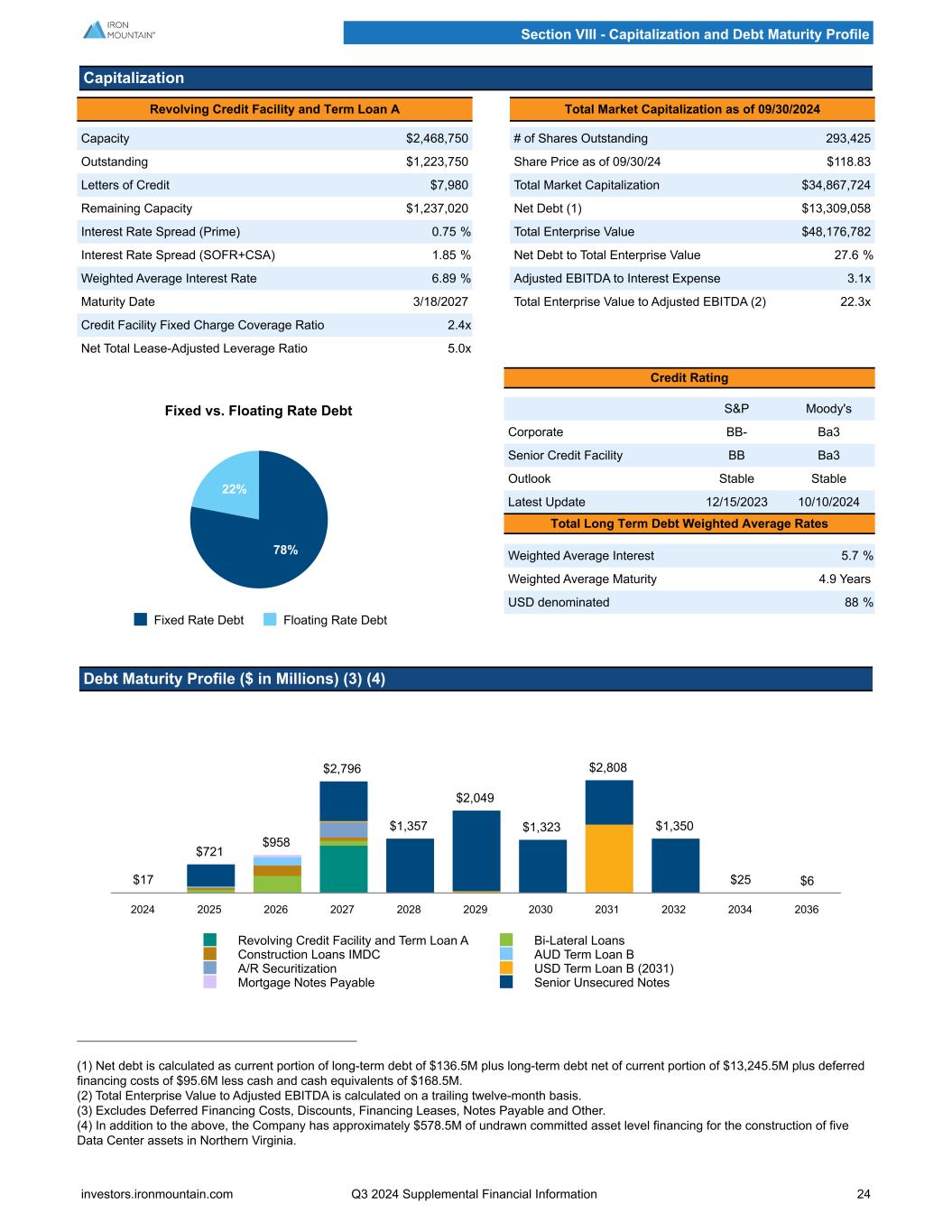 Capitalization Revolving Credit Facility and Term Loan A Total Market Capitalization as of 09/30/2024 Capacity $2,468,750 # of Shares Outstanding 293,425 Outstanding $1,223,750 Share Price as of 09/30/24 $118.83 Letters of Credit $7,980 Total Market Capitalization $34,867,724 Remaining Capacity $1,237,020 Net Debt (1) $13,309,058 Interest Rate Spread (Prime) 0.75 % Total Enterprise Value $48,176,782 Interest Rate Spread (SOFR+CSA) 1.85 % Net Debt to Total Enterprise Value 27.6 % Weighted Average Interest Rate 6.89 % Adjusted EBITDA to Interest Expense 3.1x Maturity Date 3/18/2027 Total Enterprise Value to Adjusted EBITDA (2) 22.3x Credit Facility Fixed Charge Coverage Ratio 2.4x Net Total Lease-Adjusted Leverage Ratio 5.0x Fixed vs. Floating Rate Debt 78% 22% Fixed Rate Debt Floating Rate Debt Credit Rating S&P Moody's Corporate BB- Ba3 Senior Credit Facility BB Ba3 Outlook Stable Stable Latest Update 12/15/2023 10/10/2024 Total Long Term Debt Weighted Average Rates Weighted Average Interest 5.7 % Weighted Average Maturity 4.9 Years USD denominated 88 % Debt Maturity Profile ($ in Millions) (3) (4) $17 $721 $958 $2,796 $1,357 $2,049 $1,323 $2,808 $1,350 $25 $6 Revolving Credit Facility and Term Loan A Bi-Lateral Loans Construction Loans IMDC AUD Term Loan B A/R Securitization USD Term Loan B (2031) Mortgage Notes Payable Senior Unsecured Notes 2024 2025 2026 2027 2028 2029 2030 2031 2032 2034 2036 (1) Net debt is calculated as current portion of long-term debt of $136.5M plus long-term debt net of current portion of $13,245.5M plus deferred financing costs of $95.6M less cash and cash equivalents of $168.5M. (2) Total Enterprise Value to Adjusted EBITDA is calculated on a trailing twelve-month basis. (3) Excludes Deferred Financing Costs, Discounts, Financing Leases, Notes Payable and Other. (4) In addition to the above, the Company has approximately $578.5M of undrawn committed asset level financing for the construction of five Data Center assets in Northern Virginia. Section VIII - Capitalization and Debt Maturity Profile investors.ironmountain.com Q3 2024 Supplemental Financial Information 24