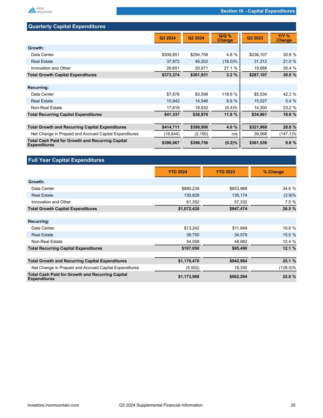 Quarterly Capital Expenditures Q3 2024 Q2 2024 Q/Q % Change Q3 2023 Y/Y % Change Growth: Data Center $308,851 $294,758 4.8 % $236,107 30.8 % Real Estate 37,872 46,202 (18.0) % 31,312 21.0 % Innovation and Other 26,651 20,971 27.1 % 19,688 35.4 % Total Growth Capital Expenditures $373,374 $361,931 3.2 % $287,107 30.0 % Recurring: Data Center $7,876 $3,598 118.9 % $5,534 42.3 % Real Estate 15,842 14,546 8.9 % 15,027 5.4 % Non-Real Estate 17,619 18,832 (6.4) % 14,300 23.2 % Total Recurring Capital Expenditures $41,337 $36,976 11.8 % $34,861 18.6 % Total Growth and Recurring Capital Expenditures $414,711 $398,906 4.0 % $321,968 28.8 % Net Change in Prepaid and Accrued Capital Expenditures (18,644) (2,150) n/a 39,568 (147.1) % Total Cash Paid for Growth and Recurring Capital Expenditures $396,067 $396,756 (0.2) % $361,536 9.6 % Full Year Capital Expenditures YTD 2024 YTD 2023 % Change Growth: Data Center $880,239 $653,968 34.6 % Real Estate 130,829 136,174 (3.9) % Innovation and Other 61,352 57,332 7.0 % Total Growth Capital Expenditures $1,072,420 $847,474 26.5 % Recurring: Data Center $13,242 $11,949 10.8 % Real Estate 39,750 34,579 15.0 % Non-Real Estate 54,058 48,962 10.4 % Total Recurring Capital Expenditures $107,050 $95,490 12.1 % Total Growth and Recurring Capital Expenditures $1,179,470 $942,964 25.1 % Net Change in Prepaid and Accrued Capital Expenditures (5,502) 19,330 (128.5) % Total Cash Paid for Growth and Recurring Capital Expenditures $1,173,968 $962,294 22.0 % Section IX - Capital Expenditures investors.ironmountain.com Q3 2024 Supplemental Financial Information 25